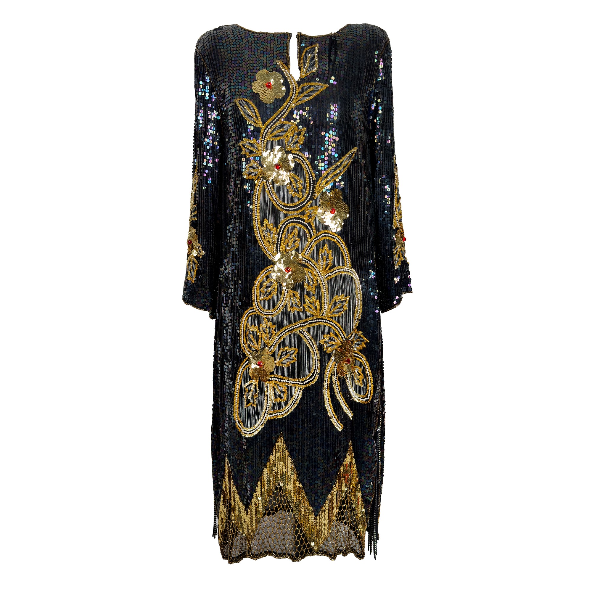 arricchito da paillettes nere e sontuosi ricami a motivi floreali eseguiti a cannette e paillettes dorate; sui fianchi un inserito di raso nero ornato da strass (difetto in prossimità dello scollo sul dietro)