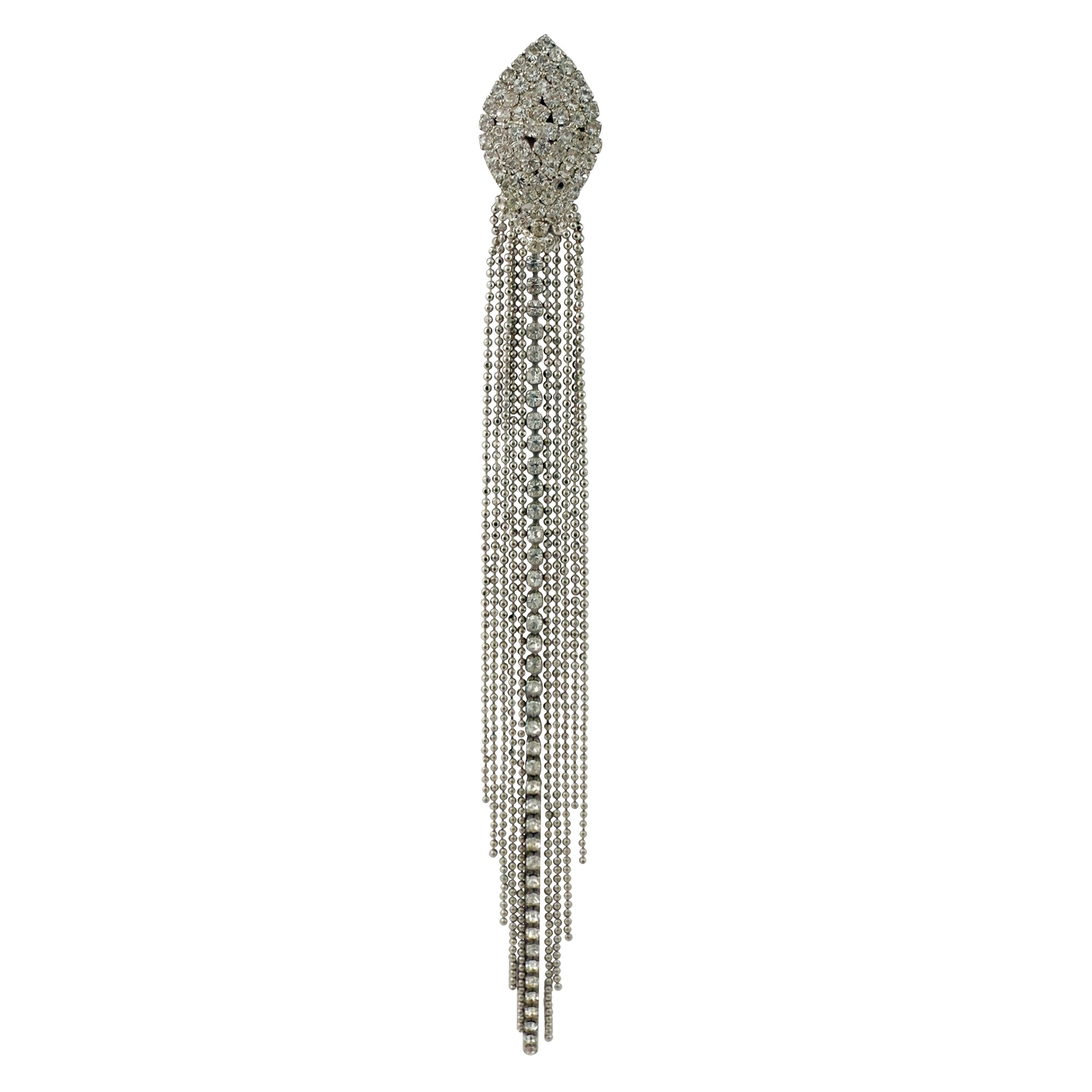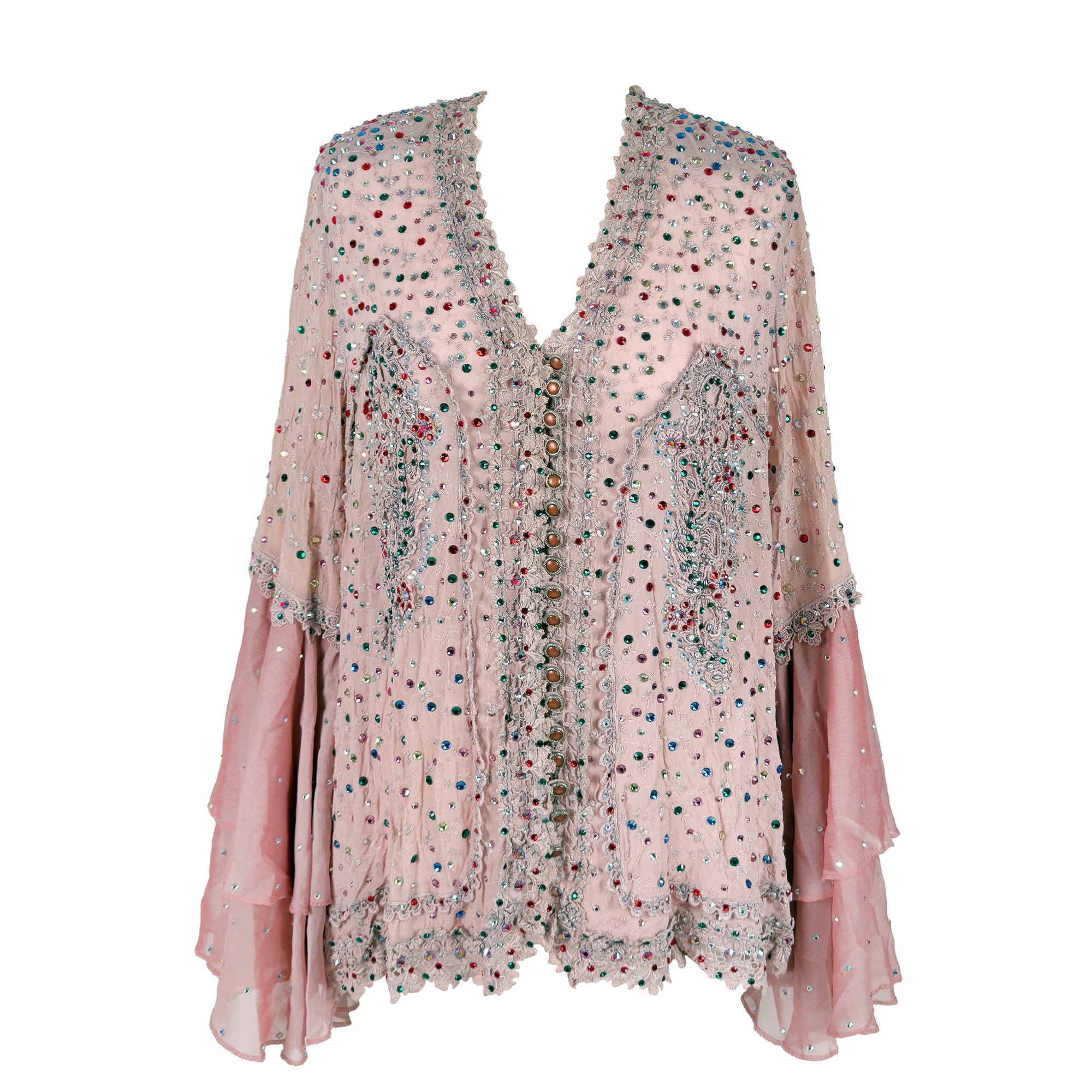 riccamente ornata da strass e perle artificiali; maniche con due ampie balze UNITA a un orecchino singolo in metallo argentato e strass.