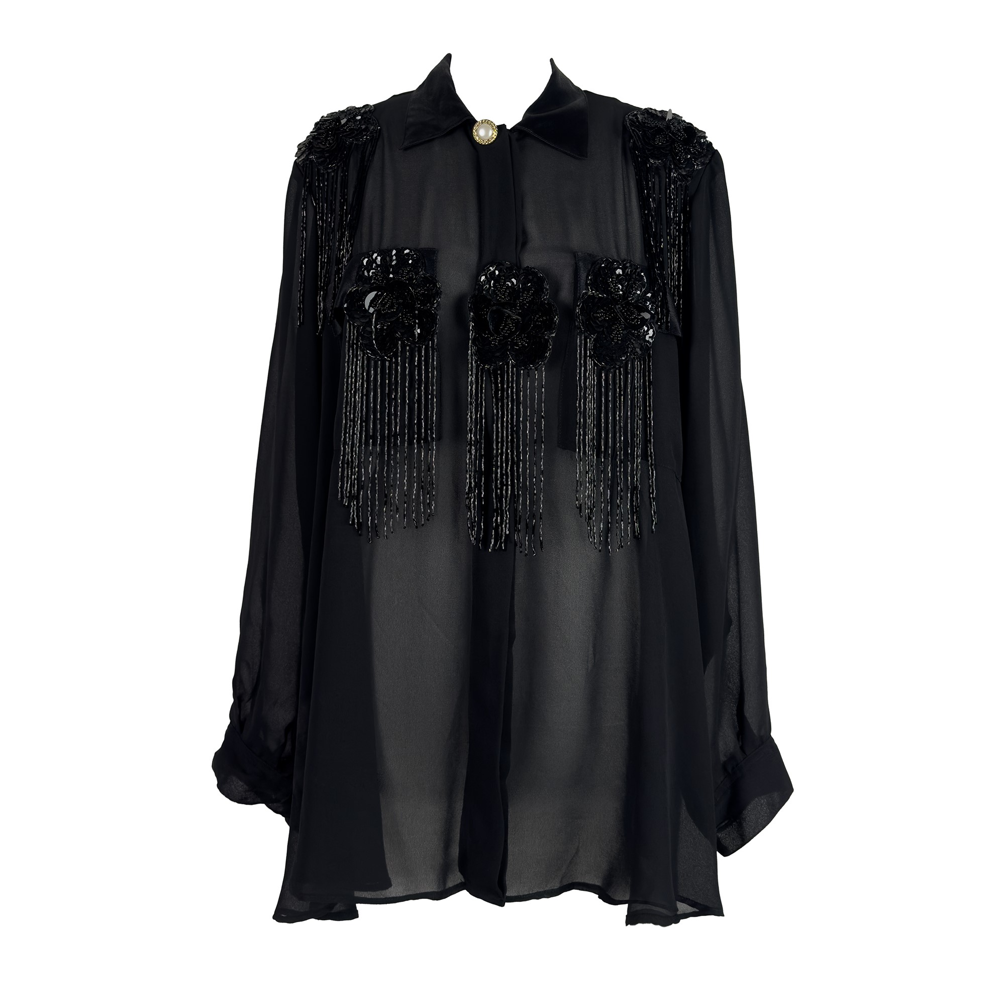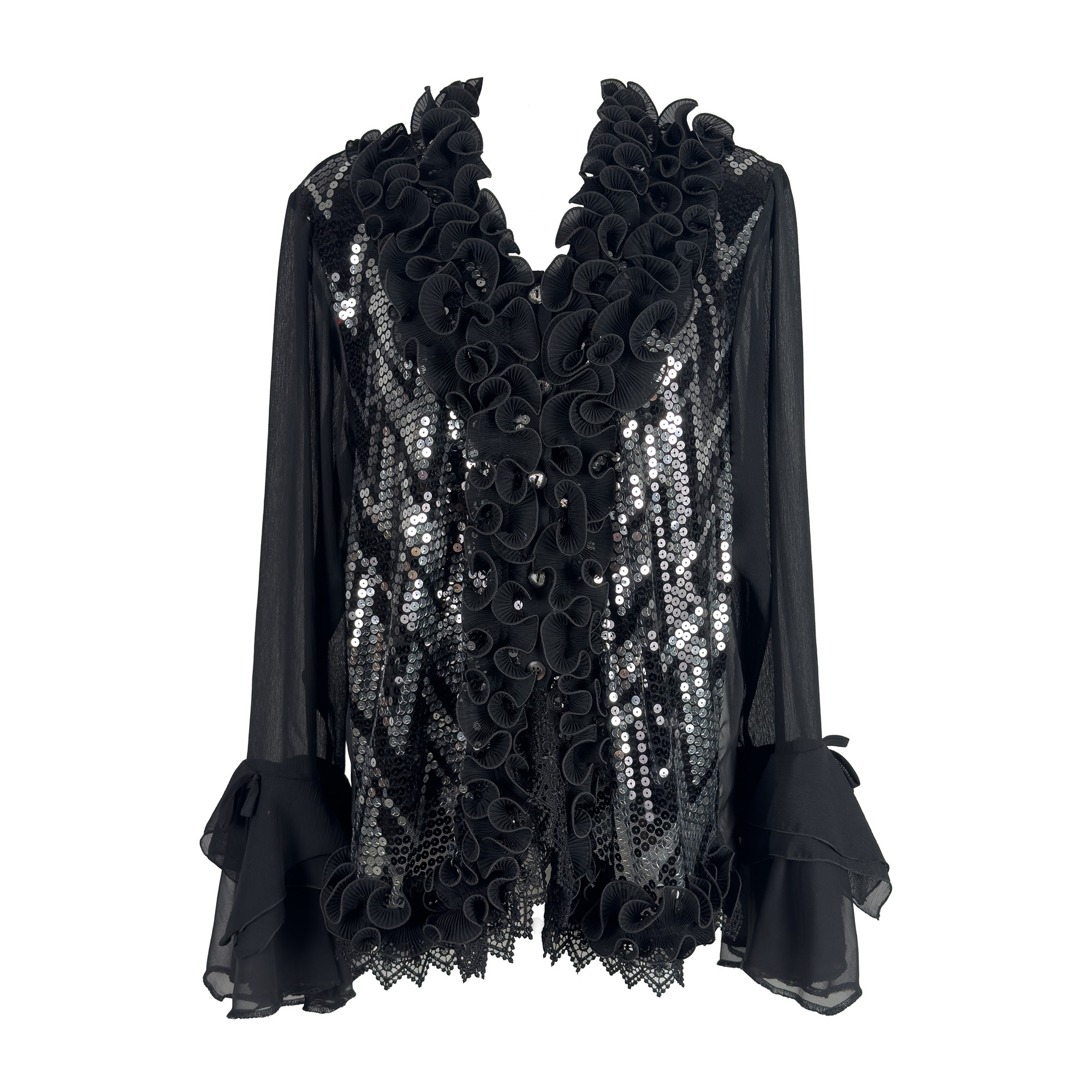 abbellita sul davanti da paillettes a zigzag nere e argento, profilata da una ruche plissettata; maniche con polso a doppia balza UNITA ad altra camicia in tessuto nero con applicazioni di grandi fiori di paillettes, tg. M