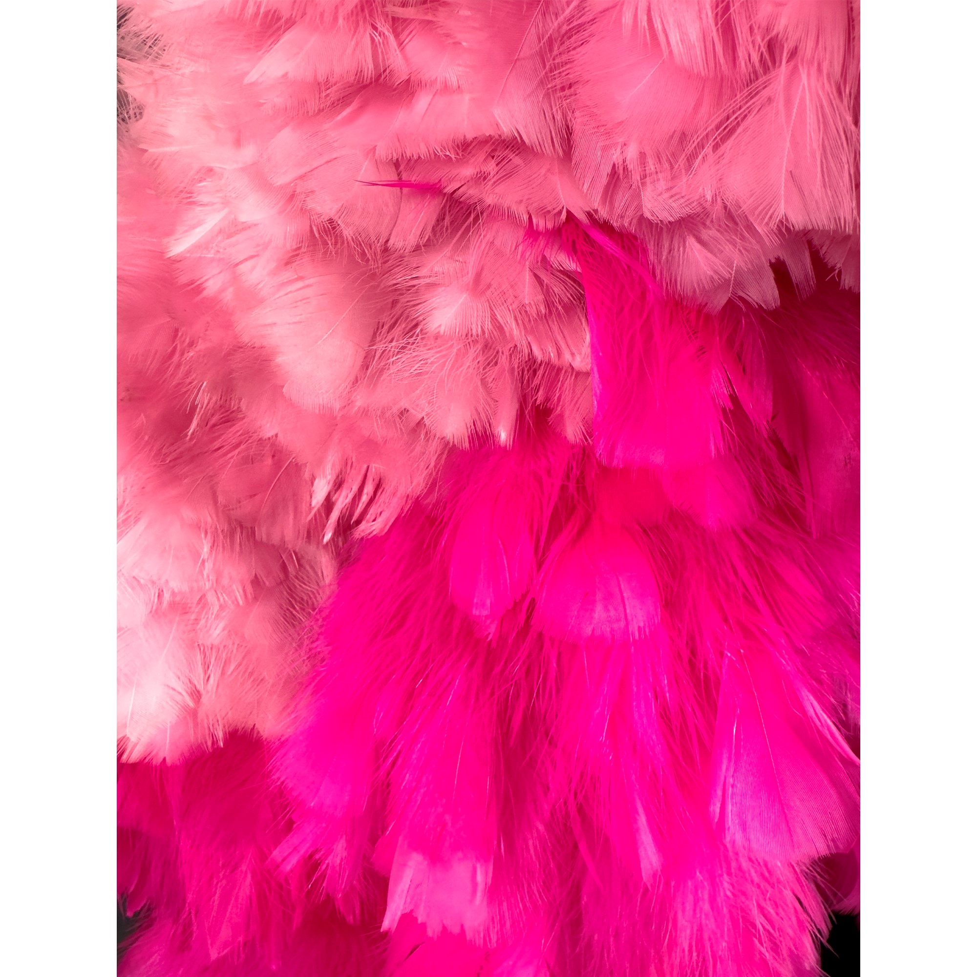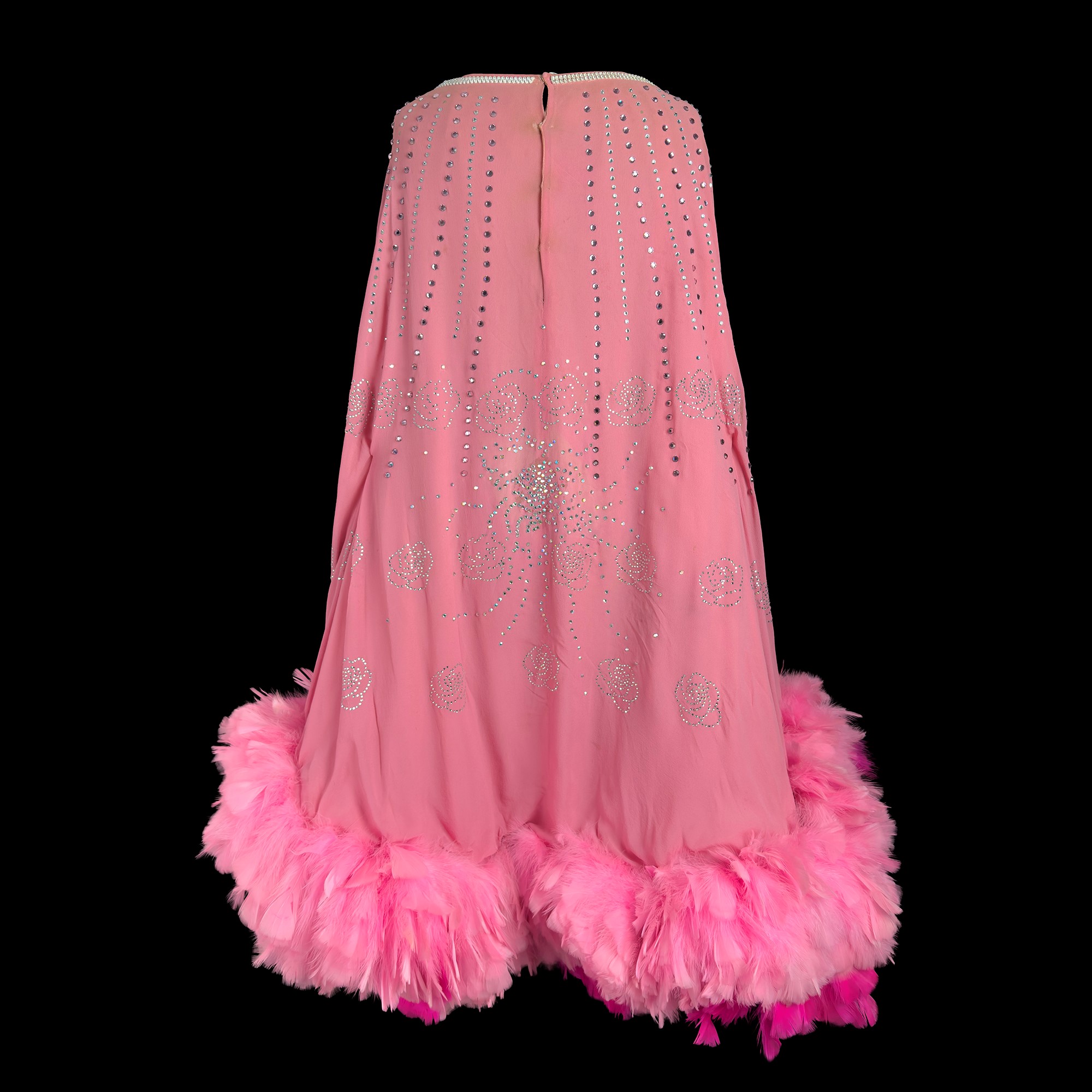 in seta rosa arricchita da strass disposti a raggiera; bordo in marabù di due tonalità di rosa (difetti)