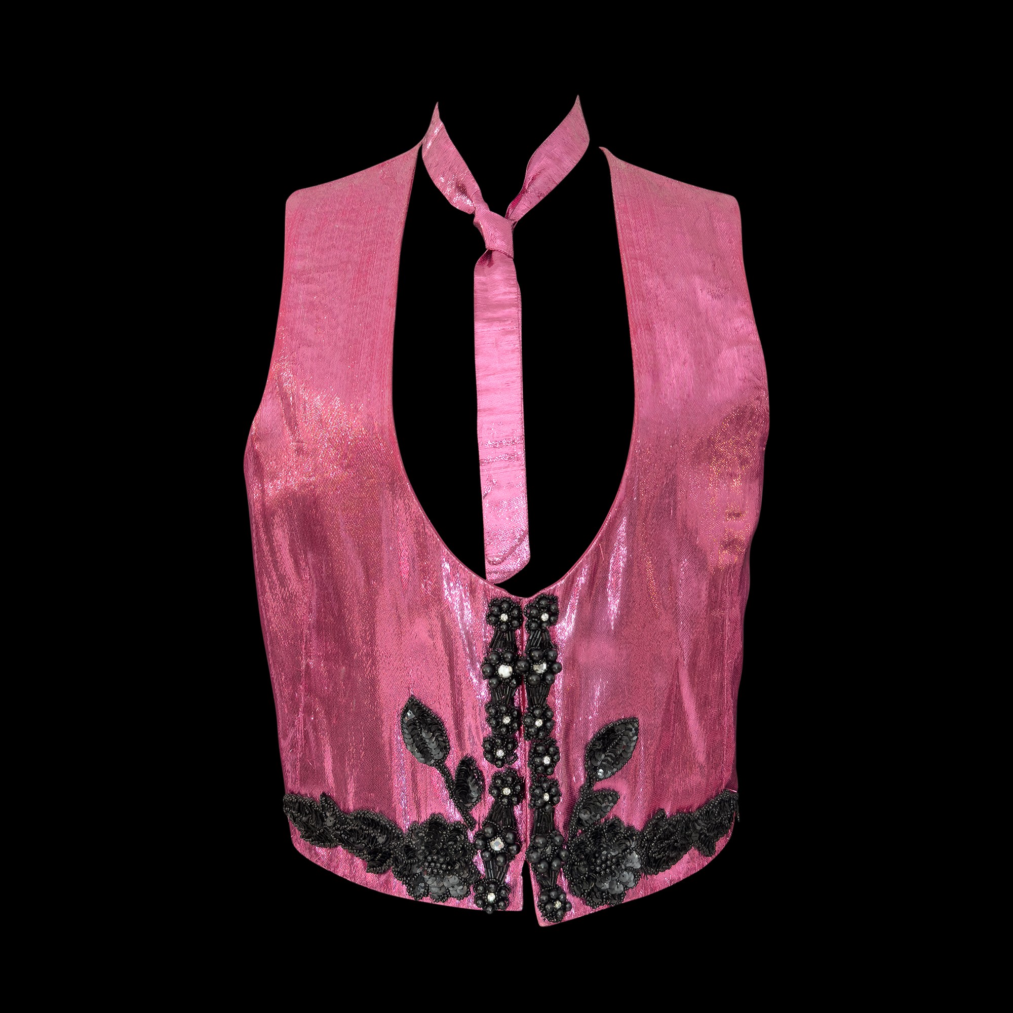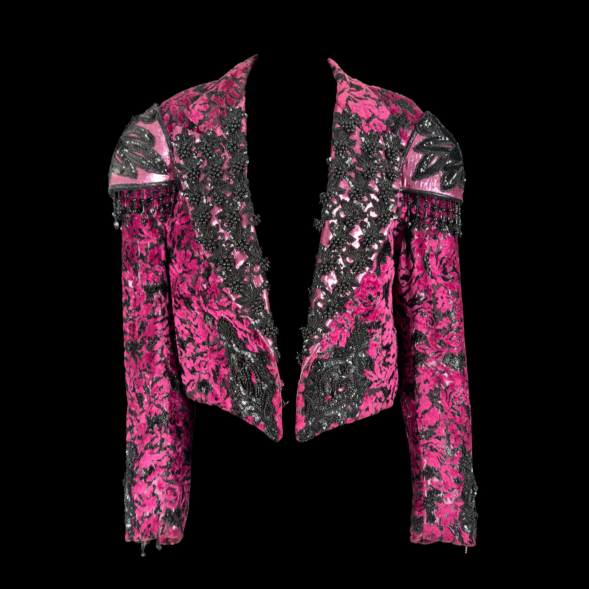 composto da una giacca in velluto controtagliato fucsia e nero a motivi floreali arricchito da applicazioni di paillettes e perline nere e da un gilet con cravattino in tessuto laminato rosa con applicazioni floreali di paillettes e perline nere.