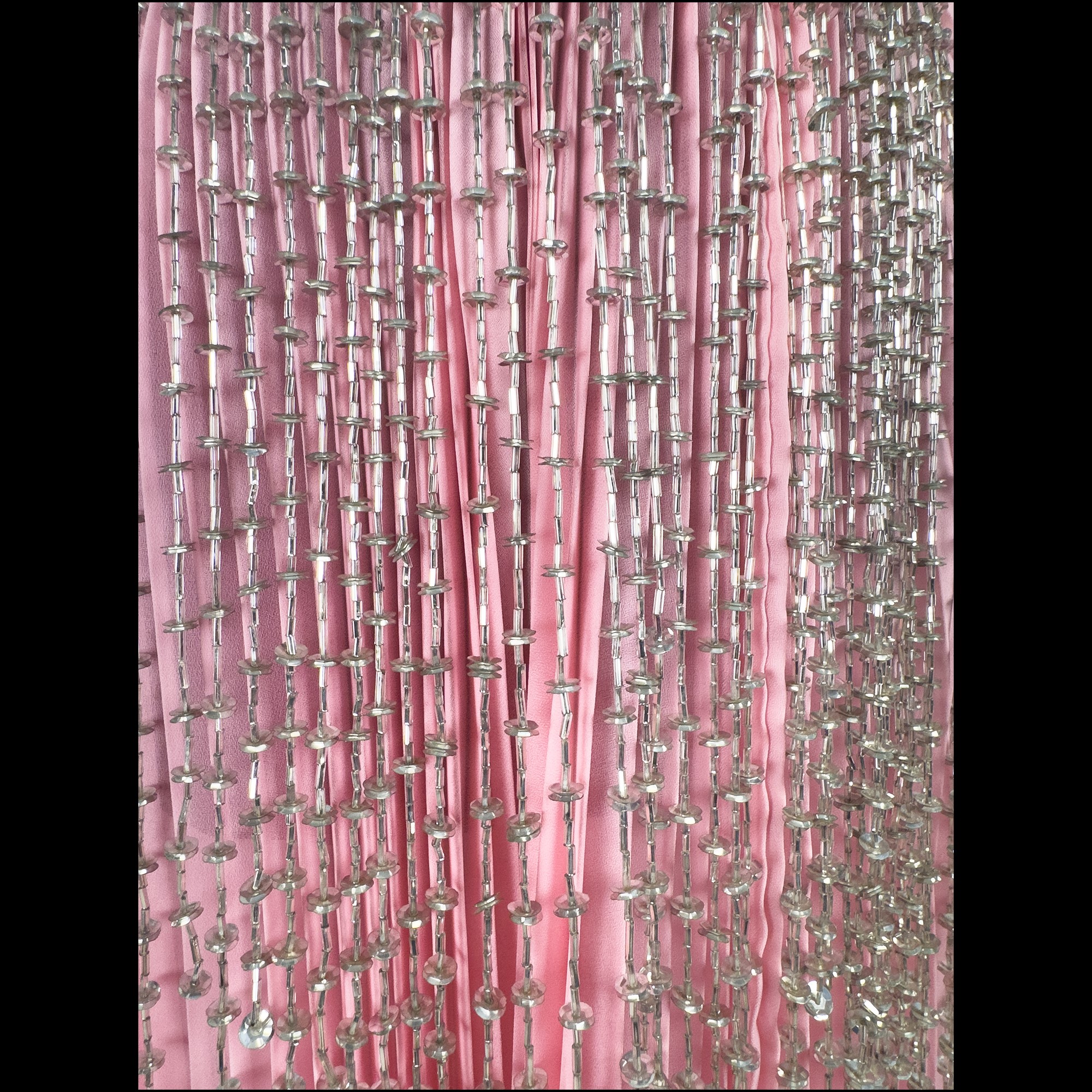 in tessuto rosa plissettato abbellita da cascatelle di fili con cannette e paillettes.