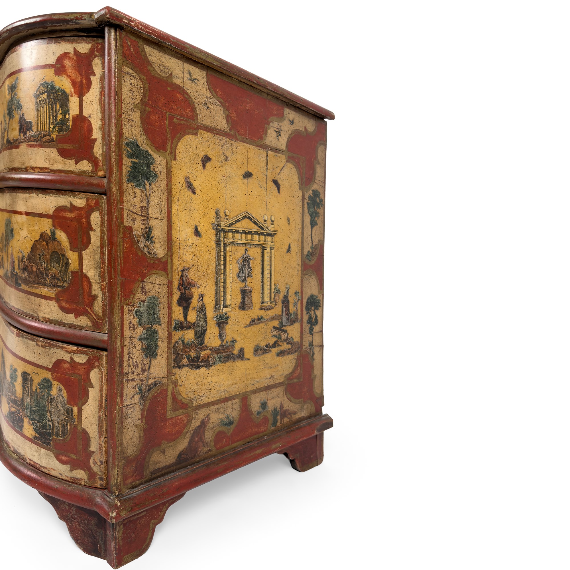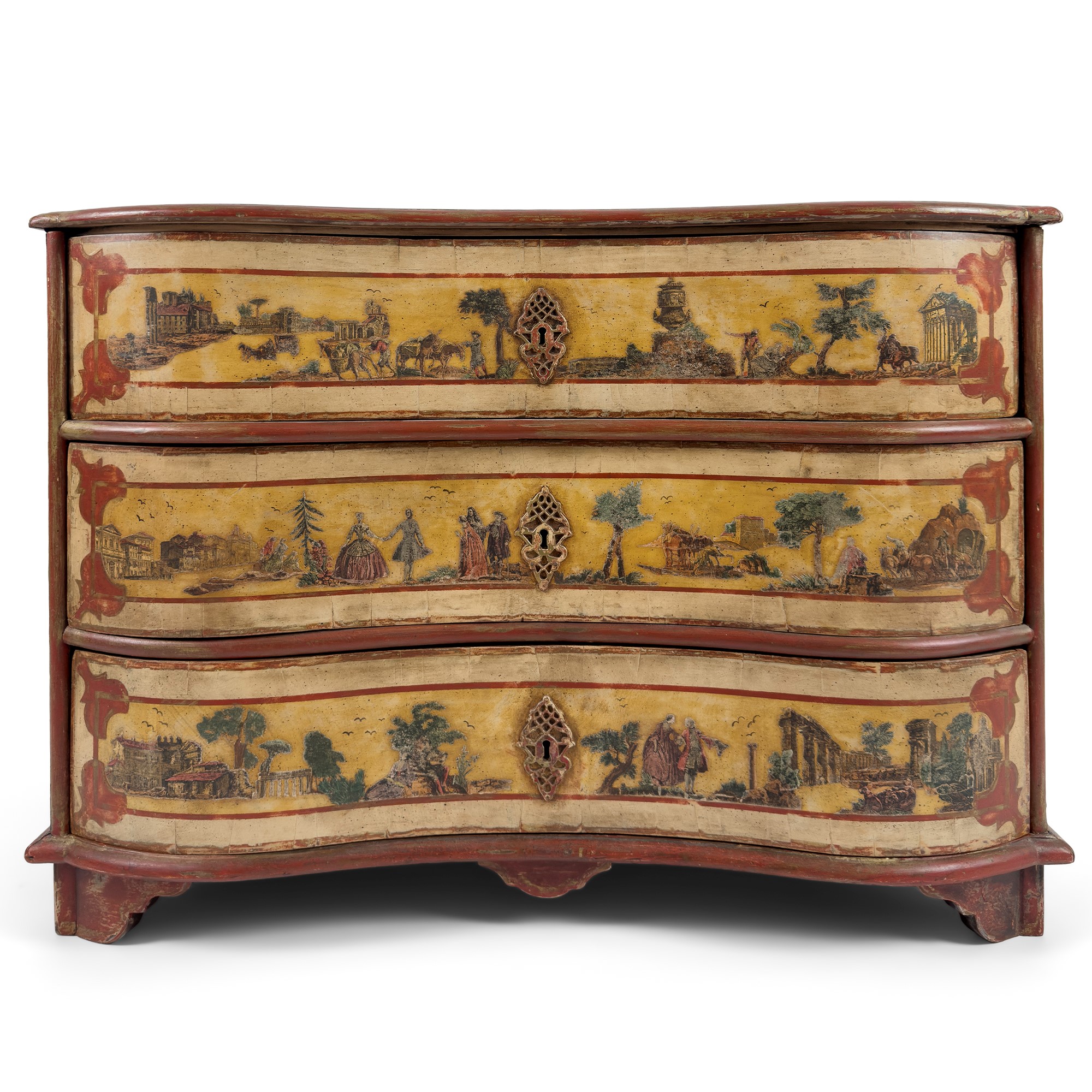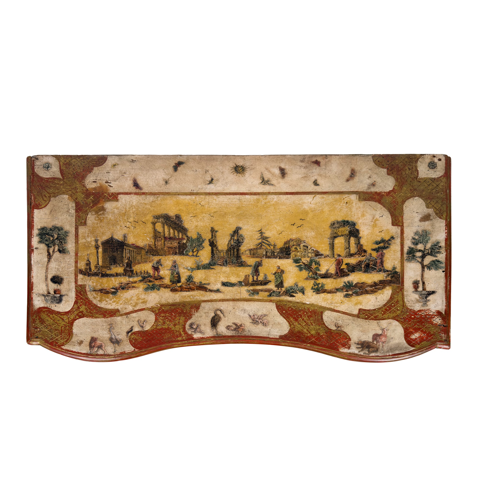 piano rettangolare sagomato con profili in rosso, decorato al centro con architetture e paesaggi e riserve ornamentali a motivi zoomorfi e alberi; fronte con tre cassetti arcuati che ripetono la decorazione del piano; piedi a mensola, cm. 78x110x62