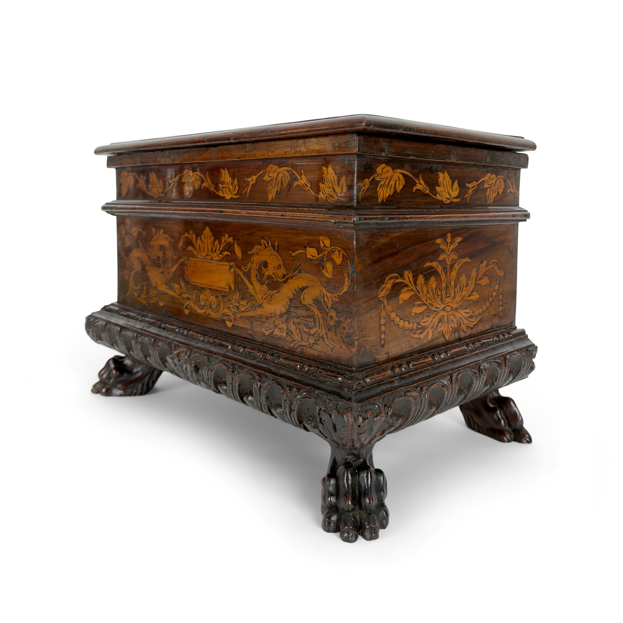 interamente decorata sul fronte ad animali di fantasia che trattengono una targa e sui fianchi a motivi fogliati; il coperchio è centrato dallo stemma mediceo; fascia inferiore in rilievo intagliata a scanalature; piedi ferini, cm. 34x53,5x29