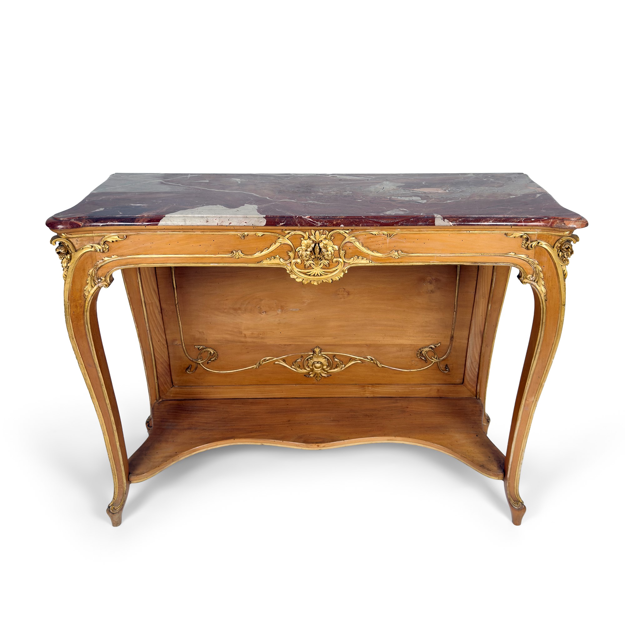profili intagliati a motivi vegetali e volute. La console con piano di marmo rosso; gambe anteriori lievemente mosse riunite da tablette; il fondo è chiuso da un pannello con i medesimi motivi decorativi, cm. 100x137x50. La specchiera reca due etichette cartacee al verso Carlo Azzi Napoli, cm. 221x123 circa