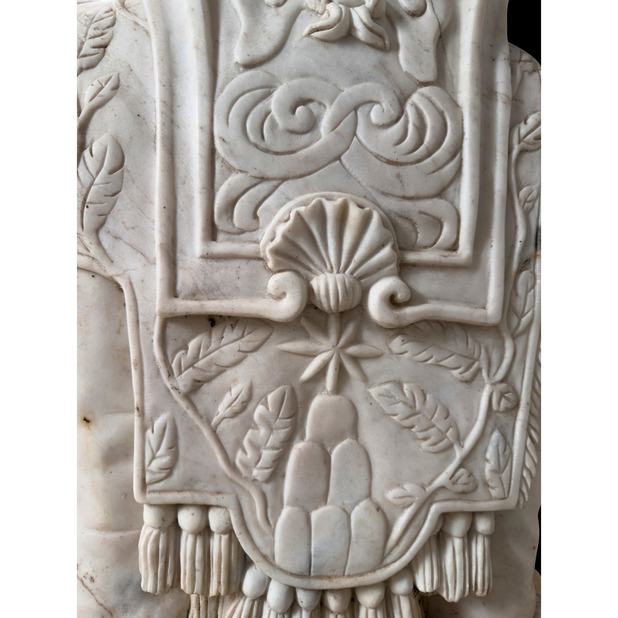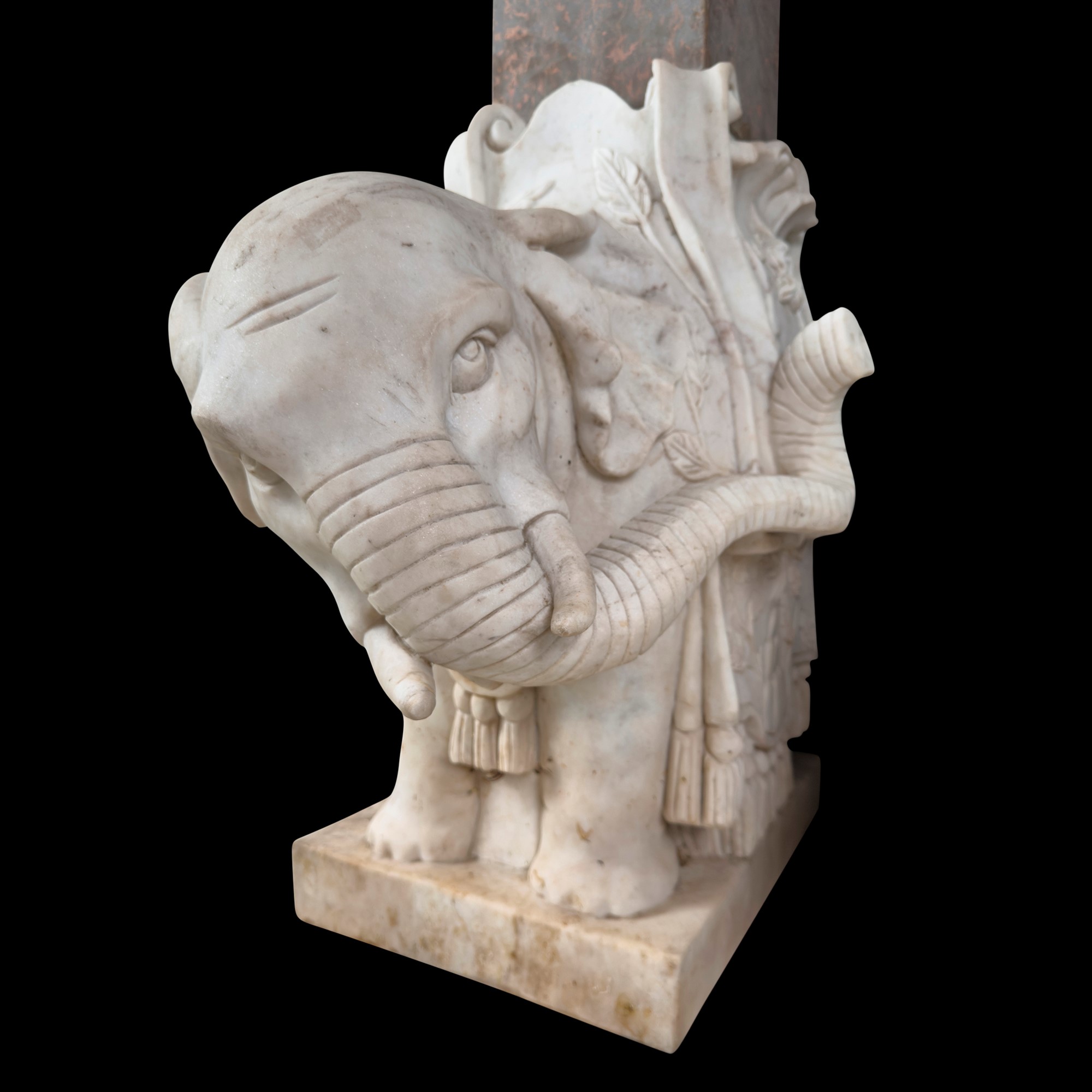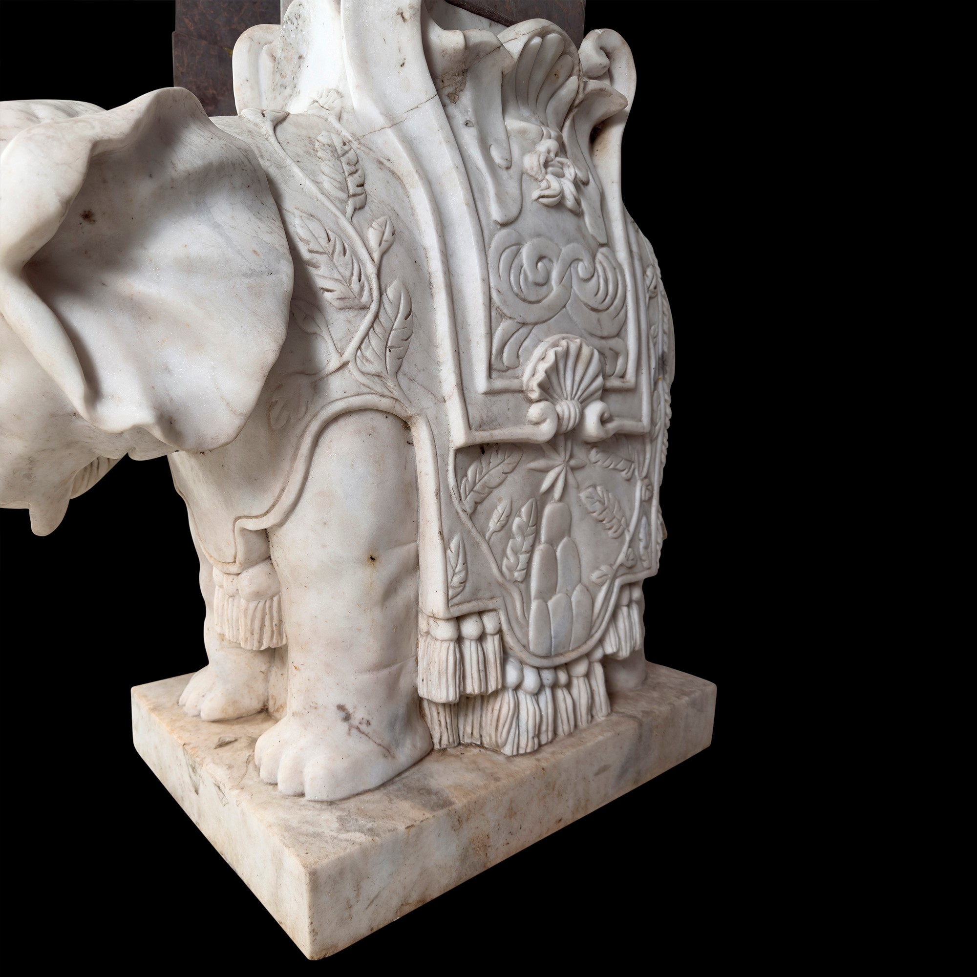 Coppia di elefanti bardati in marmo bianco