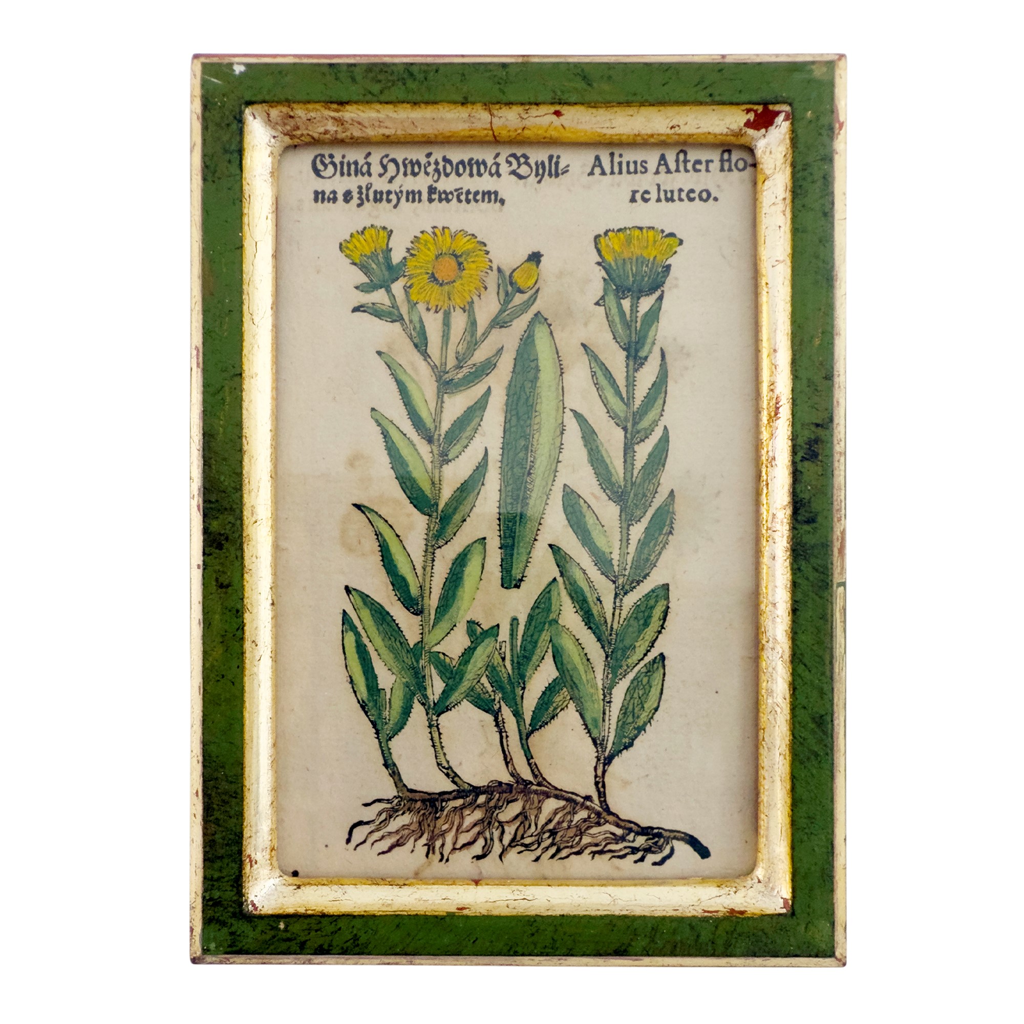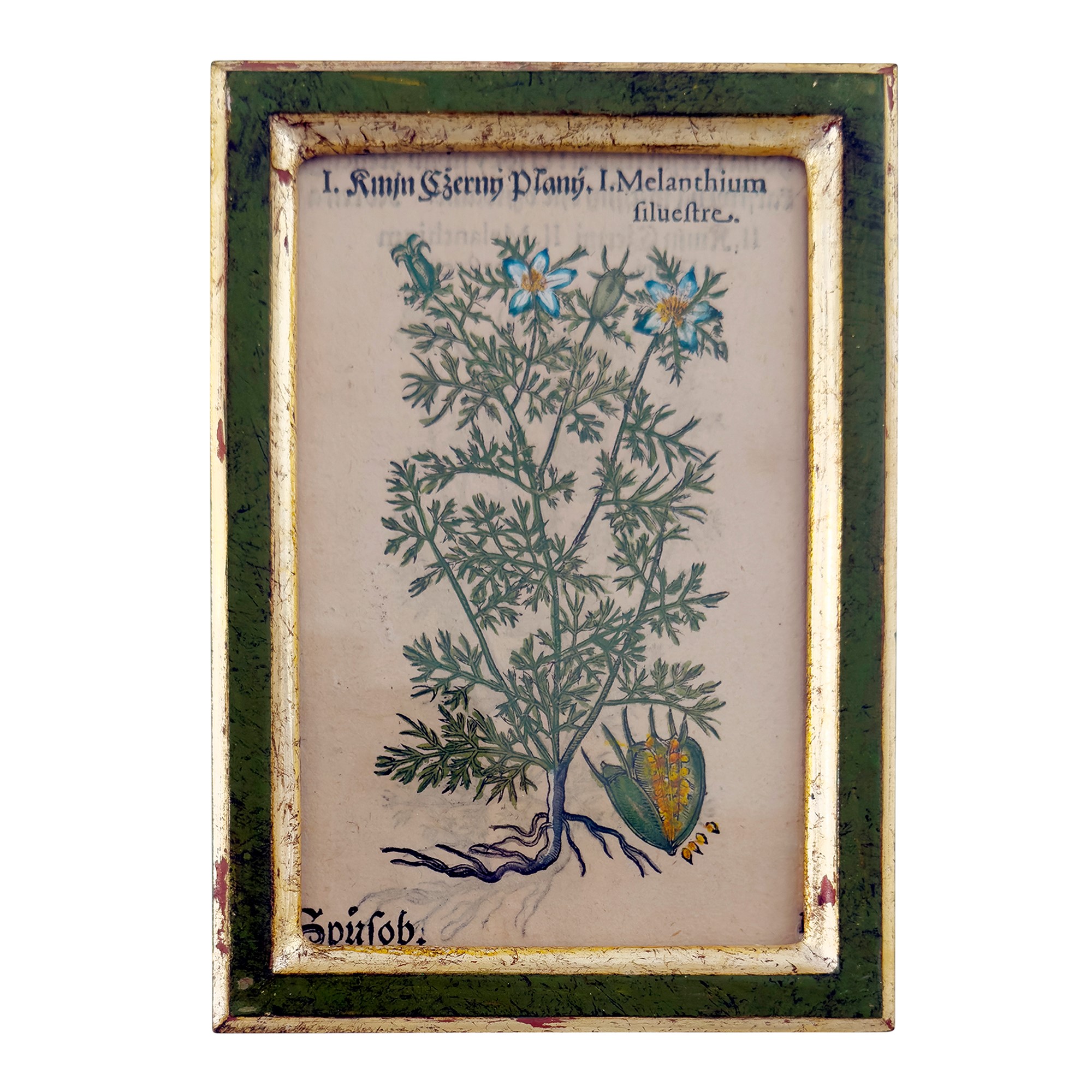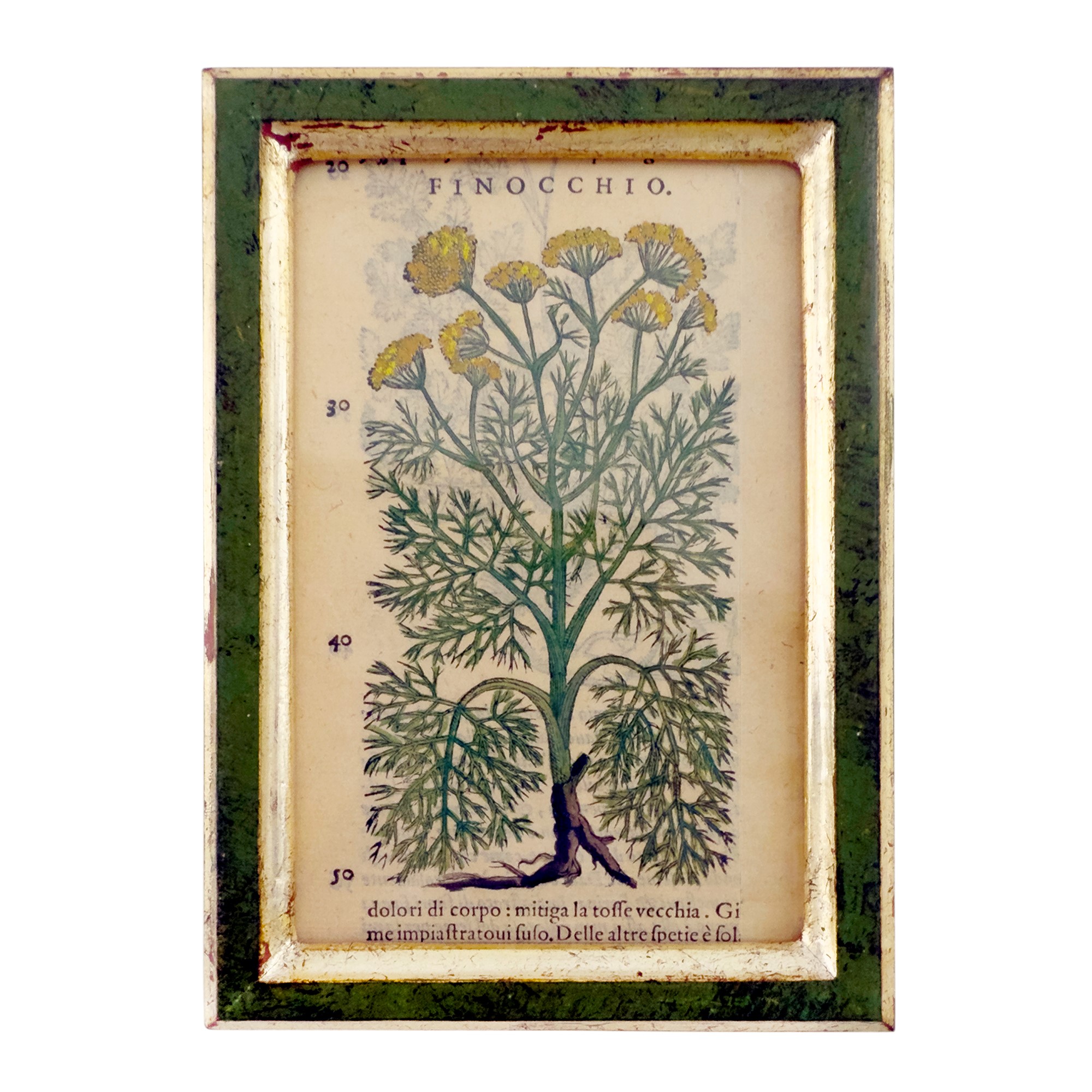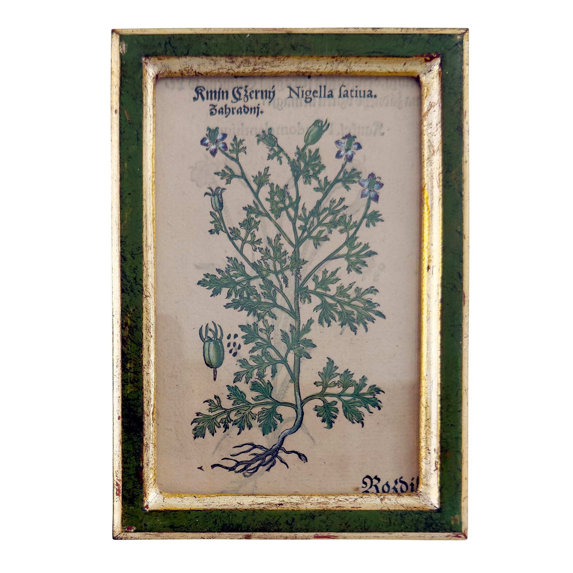 dall'opera di Mattioli raffiguranti specie diverse di piante; cornice di legno laccato verde e dorato a mecca, complessivamente cm. 16,5x11,5