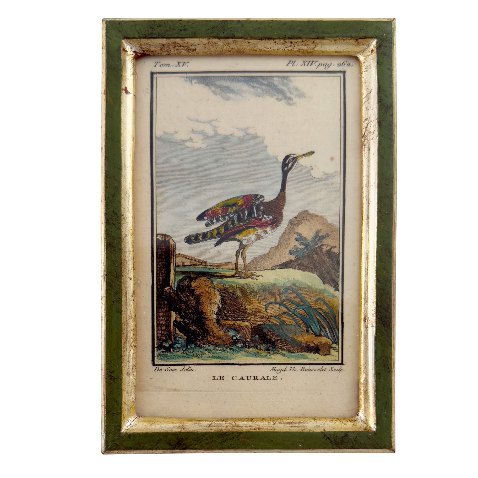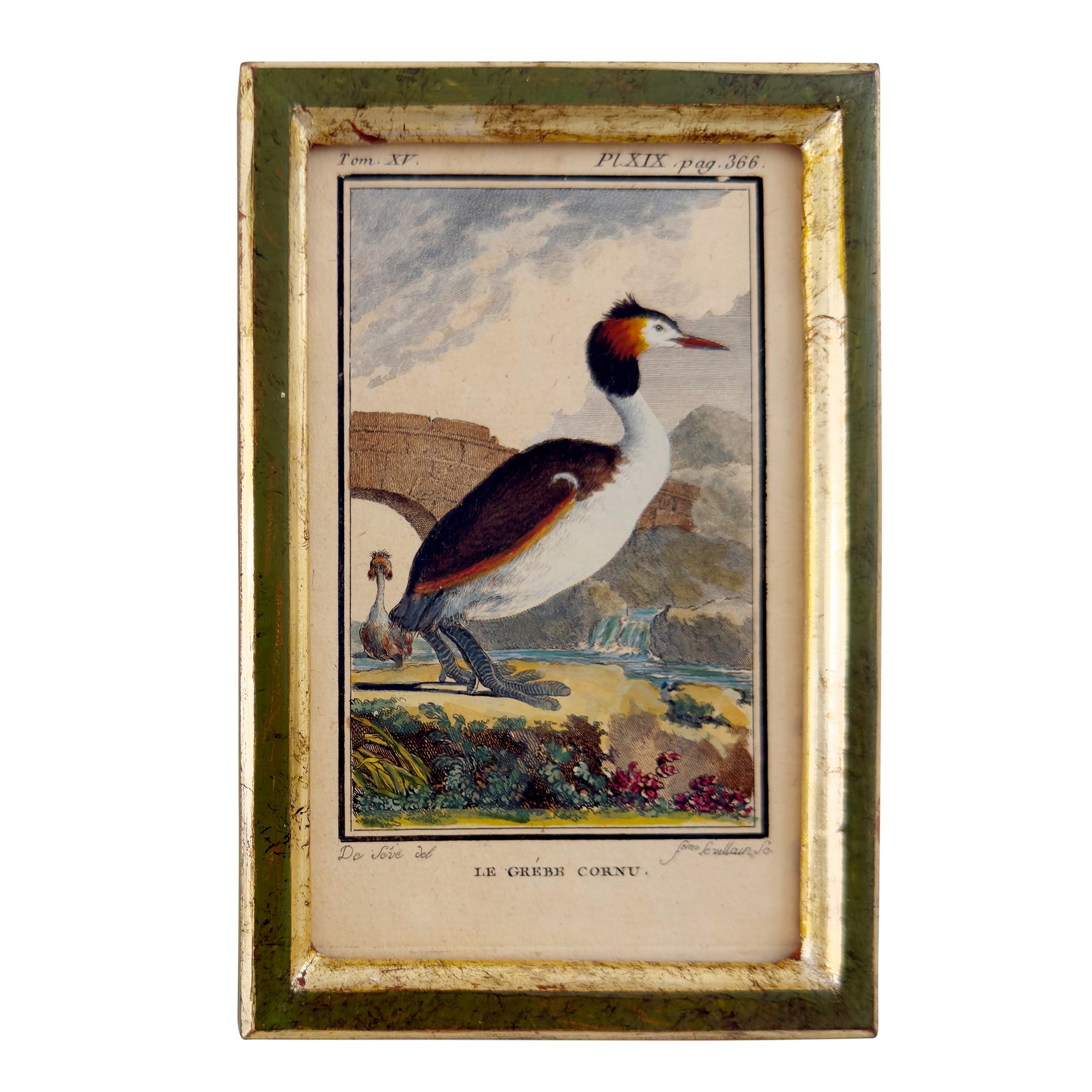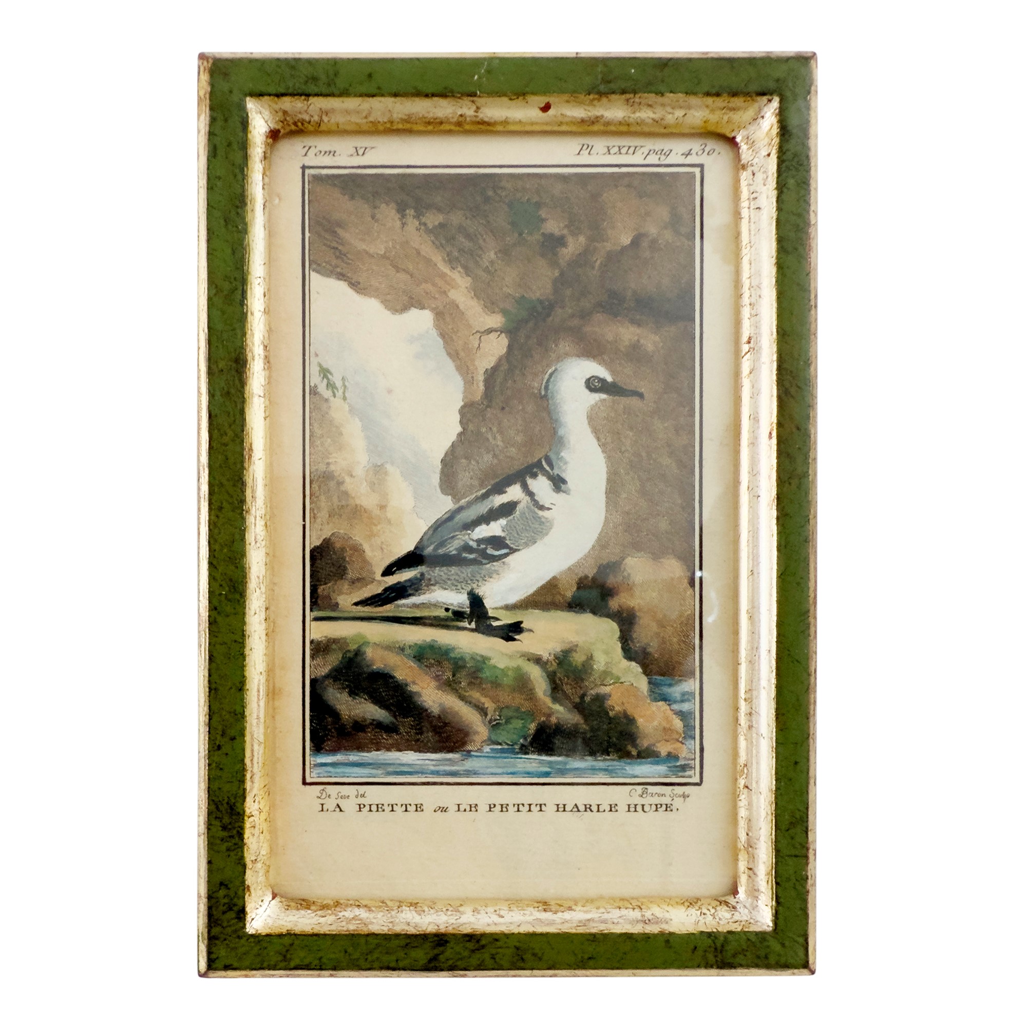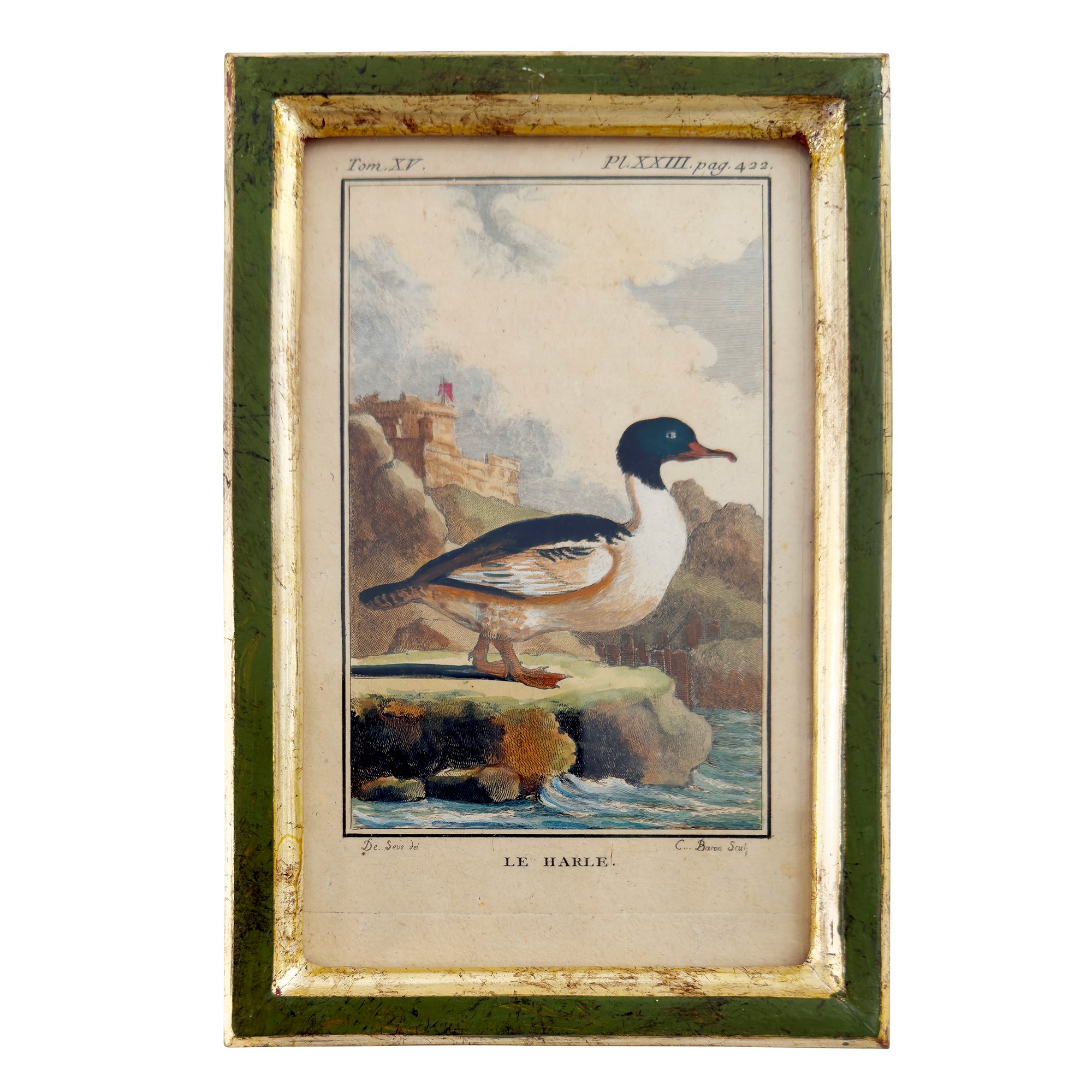 dall'opera di Buffon raffiguranti specie di papere; cornice di legno laccato verde e dorato a mecca, complessivamente cm. 18x12