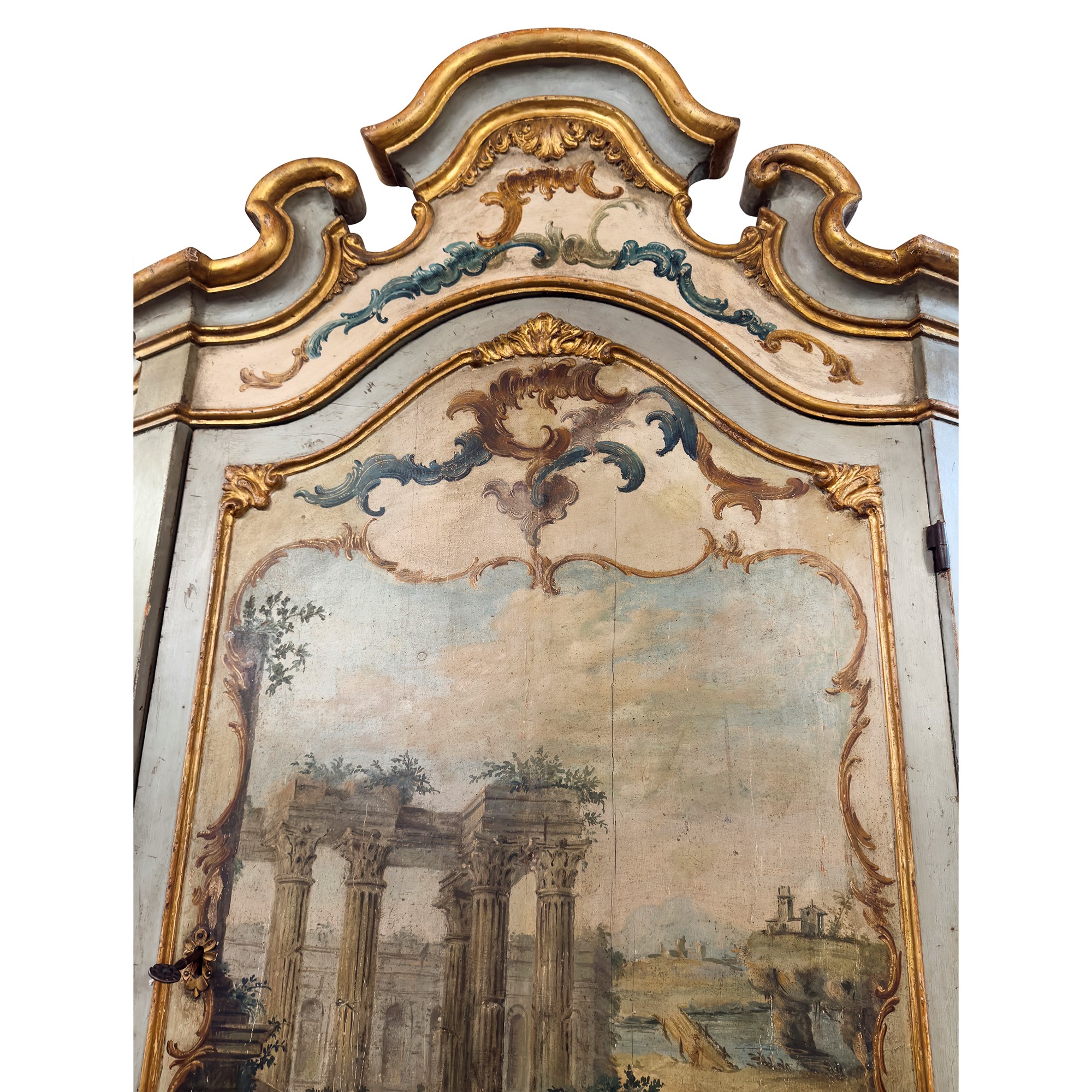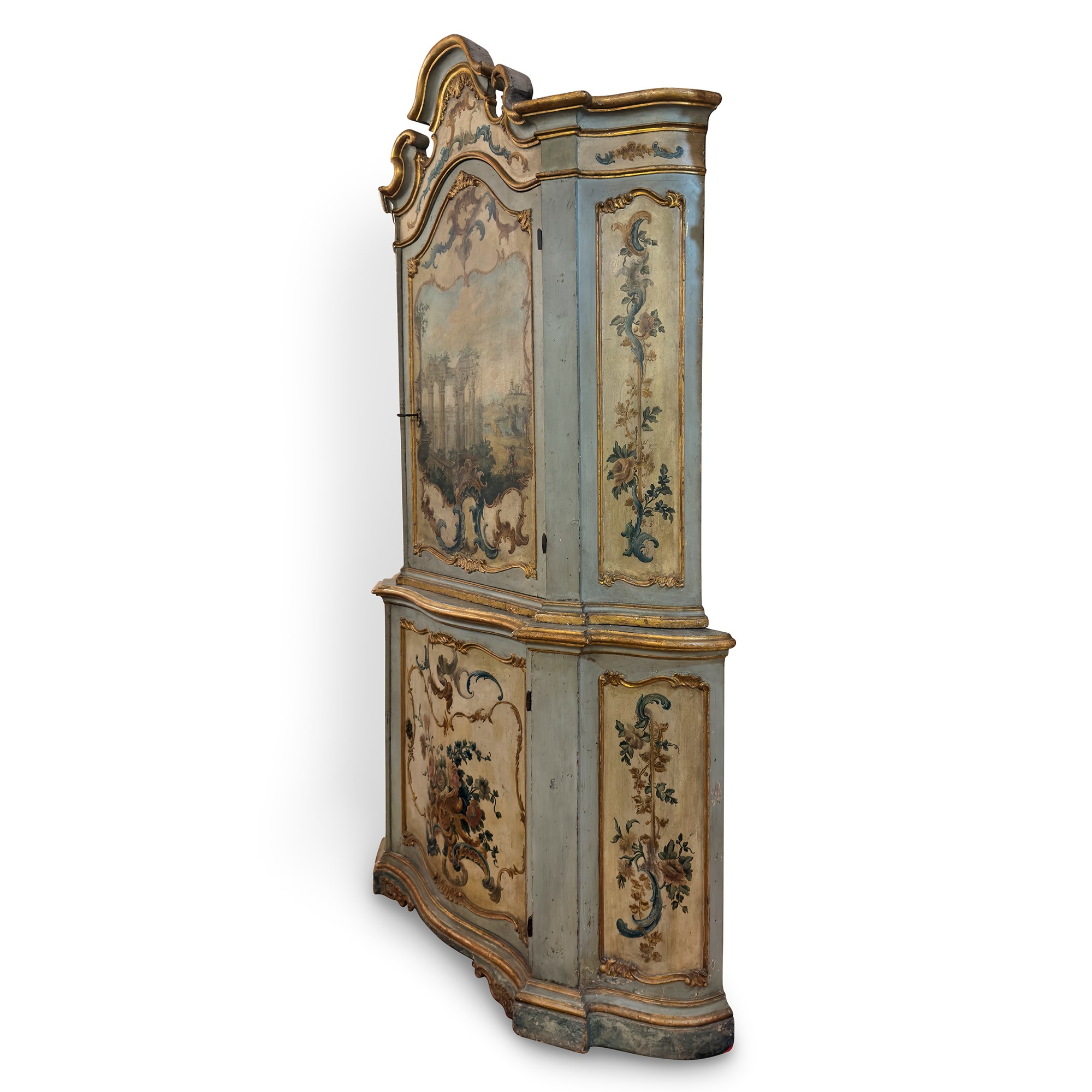 fronte mistilineo con scorniciature dorate. La parte superiore a un'anta centrale finemente dipinta a paesaggio con rovine e figure, sormontata da una cimasa a timpano spezzato; fianchi bombati qualificati da due serti fogliati e fioriti. Quella inferiore della medesima linea parimenti a un'anta centrata da un elegante motivo floreale dipinto entro una cornice di rocailles, affiancata da due composizioni fogliate che riprendono quelle dei pannelli superiori. Piedi a mensola sagomata, cm. 280x180x40 circa.
