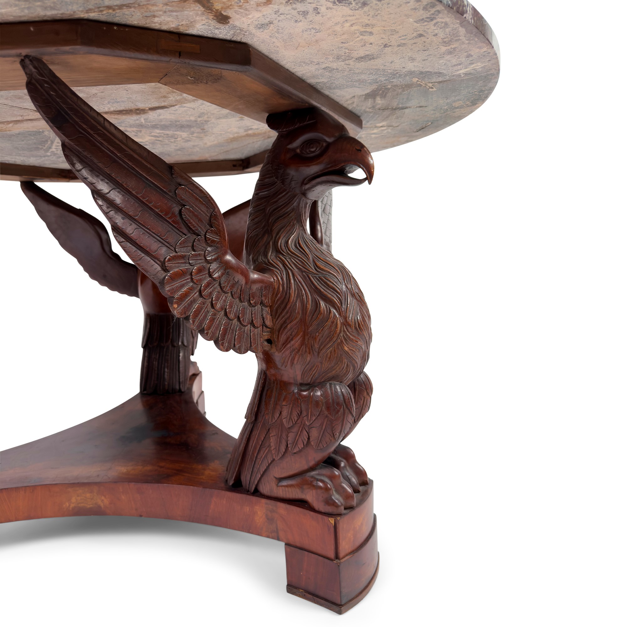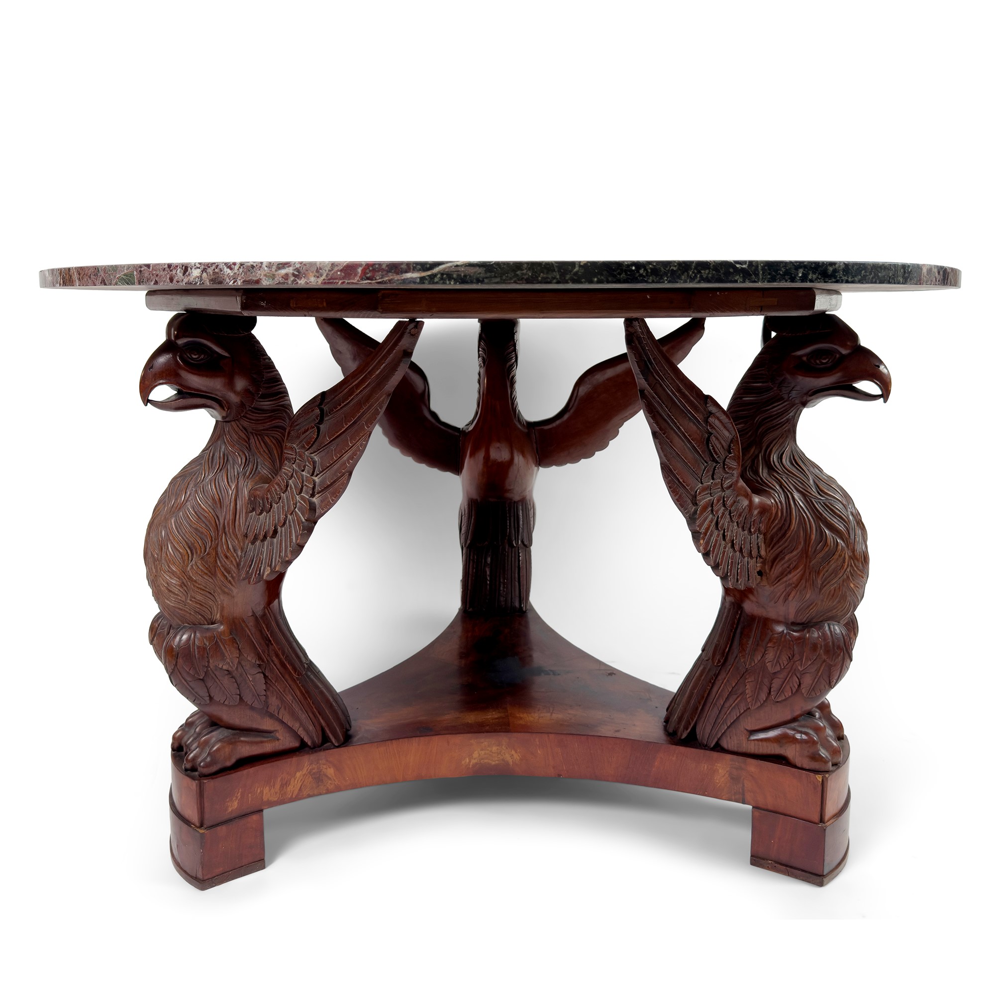 base caratterizzata da tre aquile dalle ali spiegate rese a tuttotondo poggianti su una pedana triangolare; piano circolare di marmo rosso Levanto, cm. 80x135 (qualche sbeccatura al profilo del piano)
