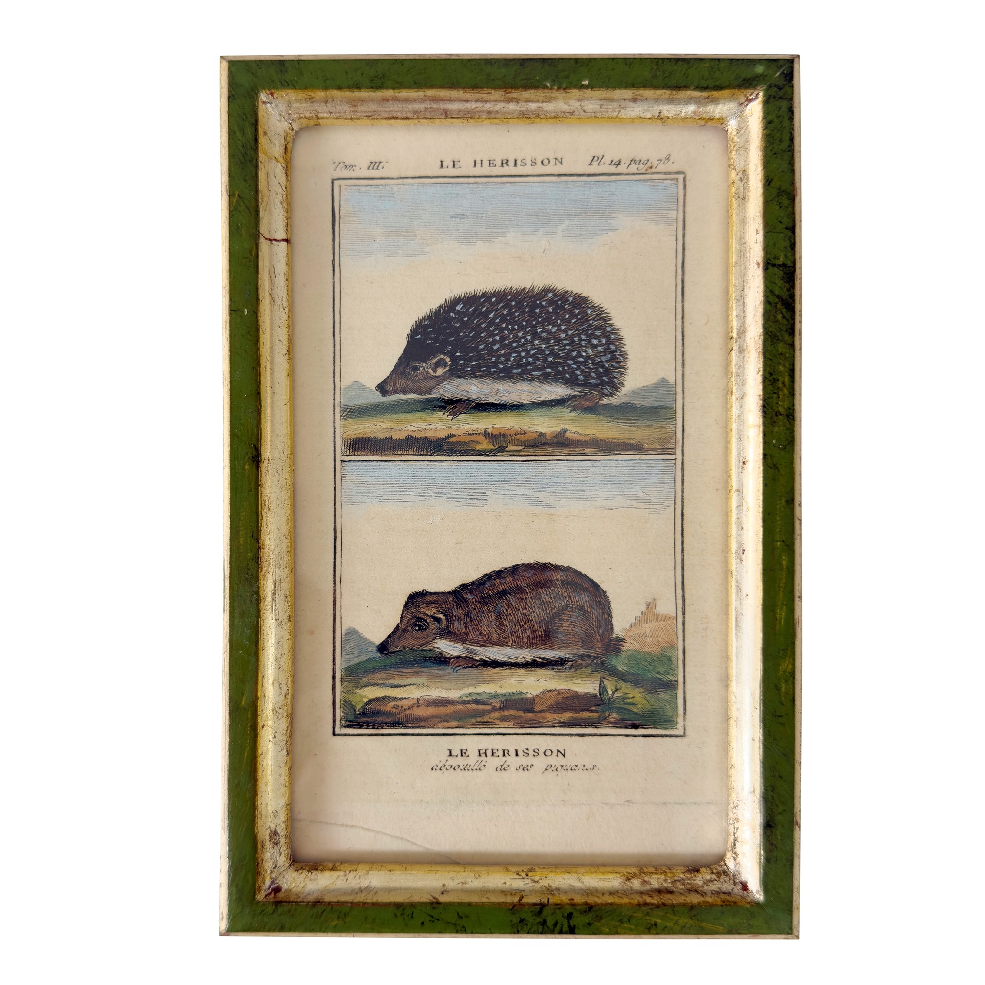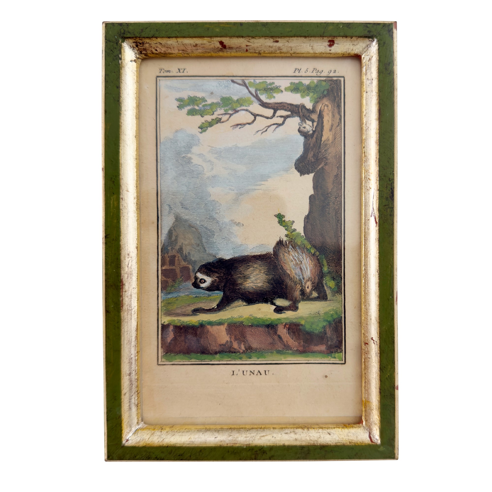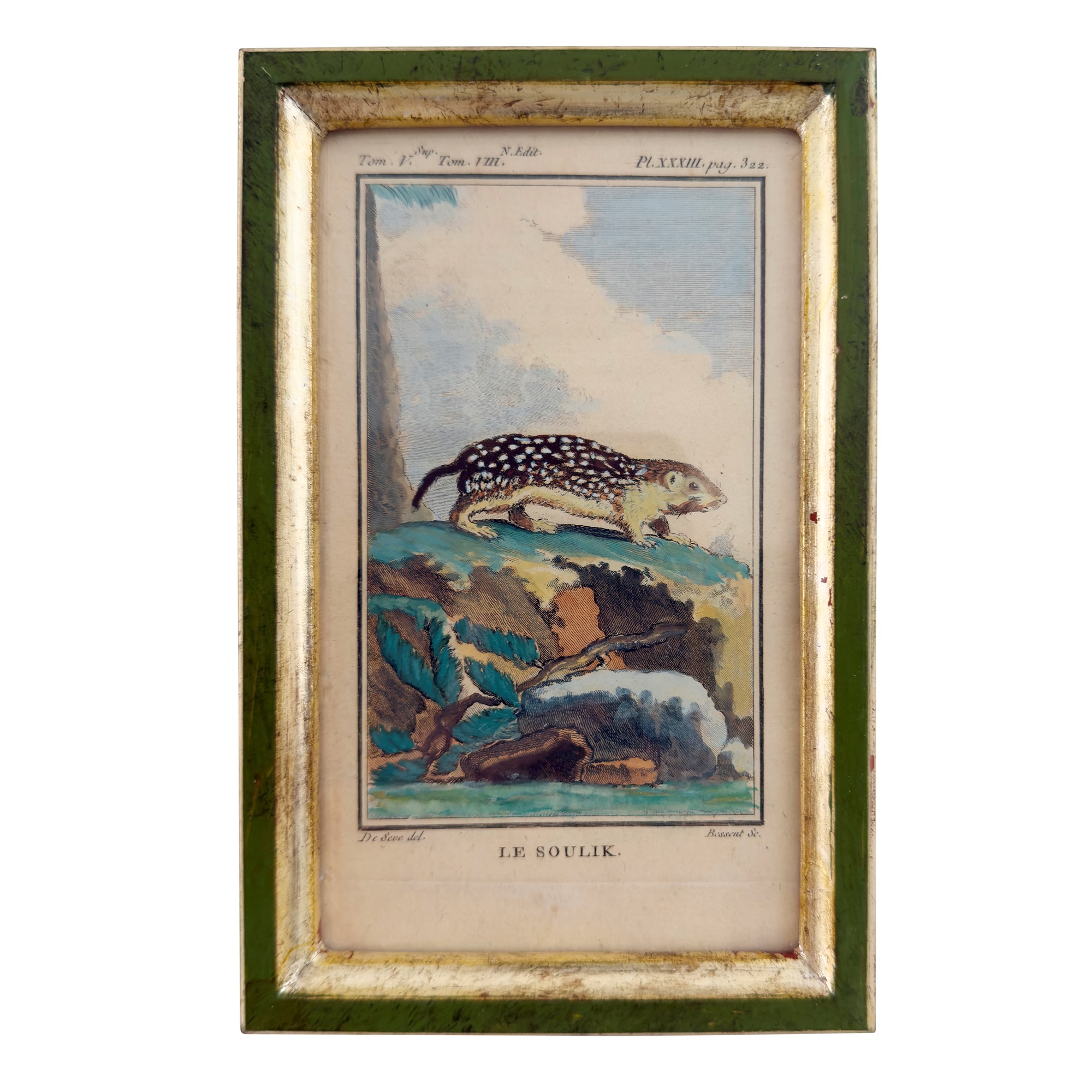 dall'opera di Buffon raffiguranti specie di furetti; cornice di legno laccato verde e dorato a mecca, complessivamente cm. 18,5x12
