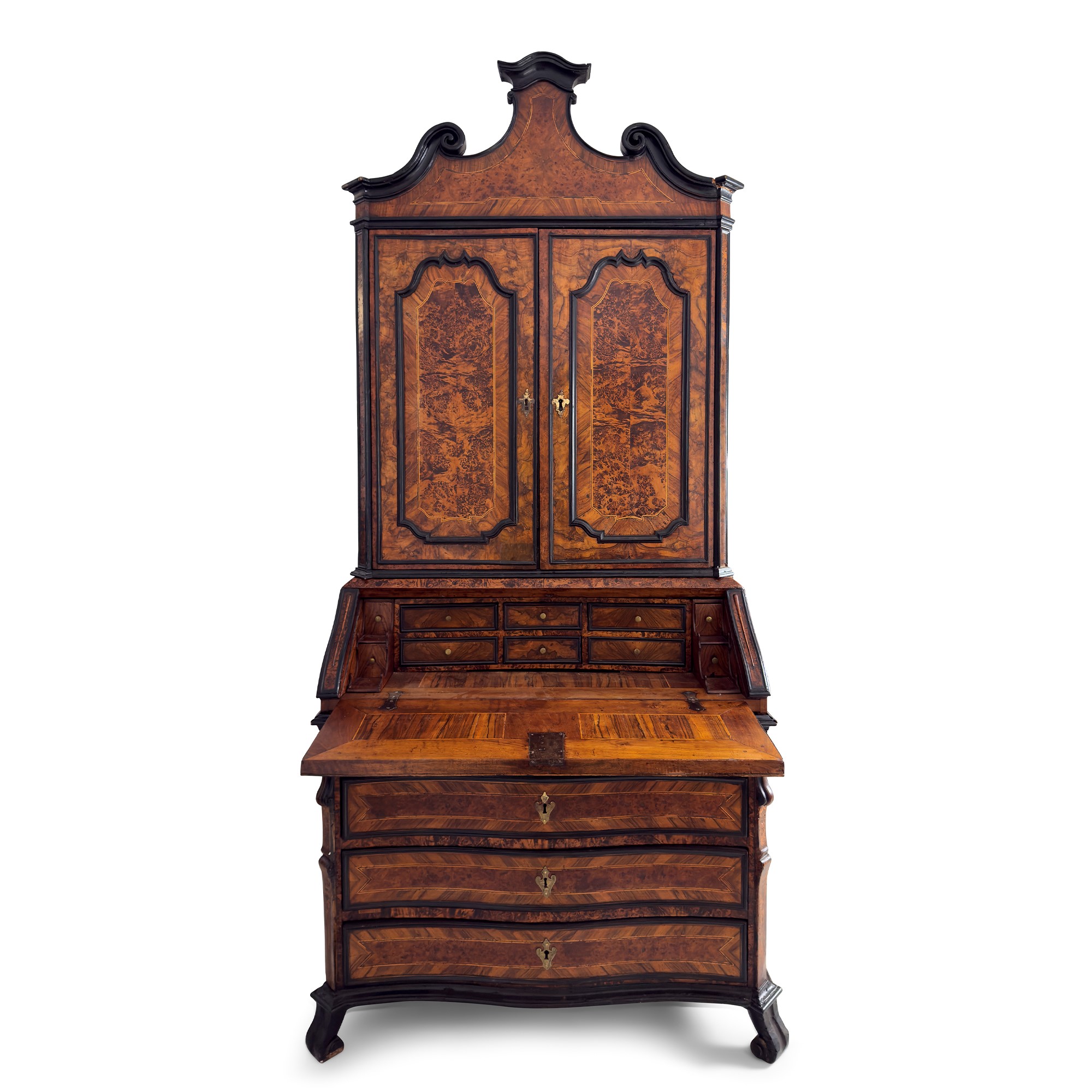 con profili in legno ebanizzato. la parte inferiore con fronte leggermente bombato a quattro cassetti sottesi a una calatoia celante sei tiretti al centro e due laterali per parte. Alta cimasa a timpano spezzato; piedi a ricciolo, cm. 250x112x54