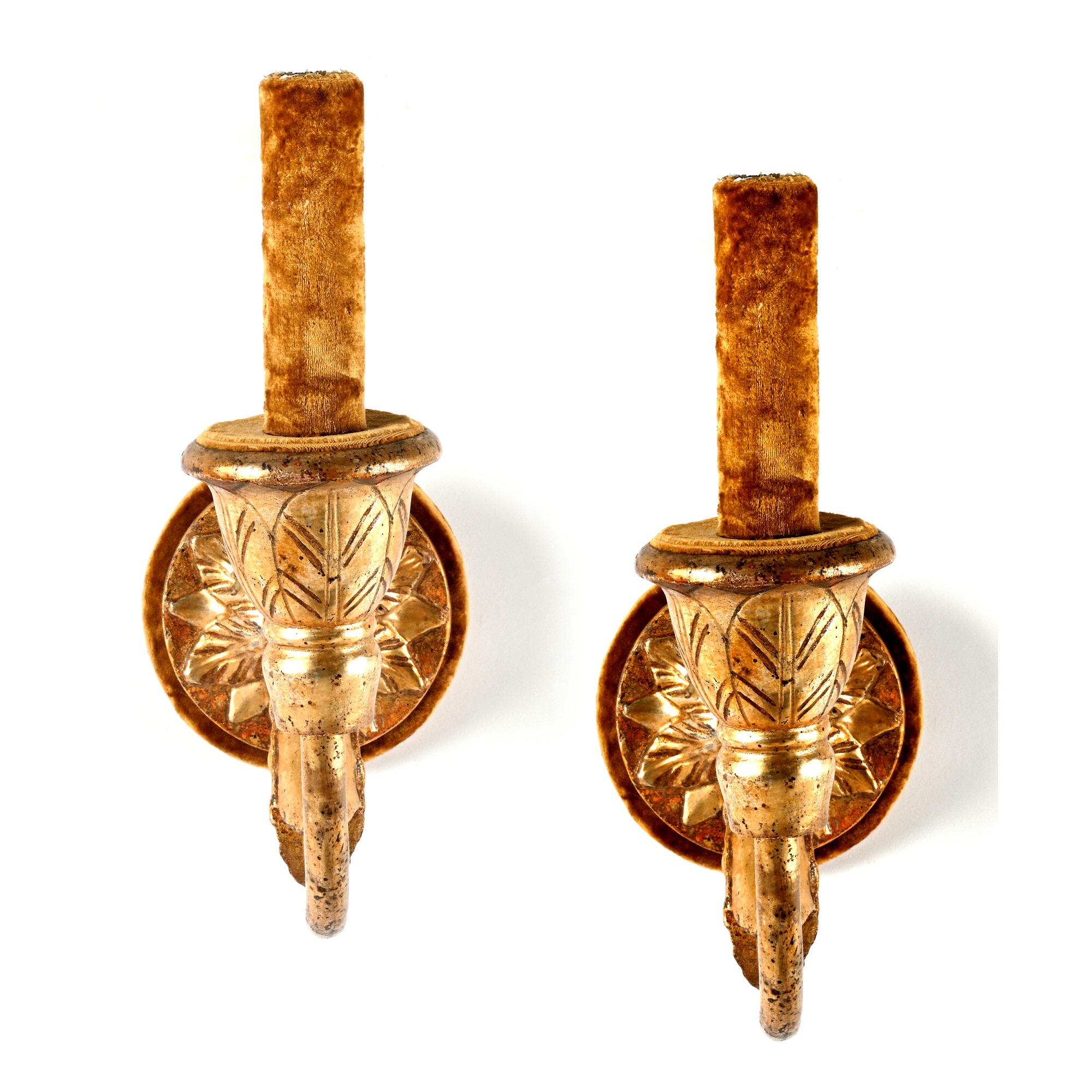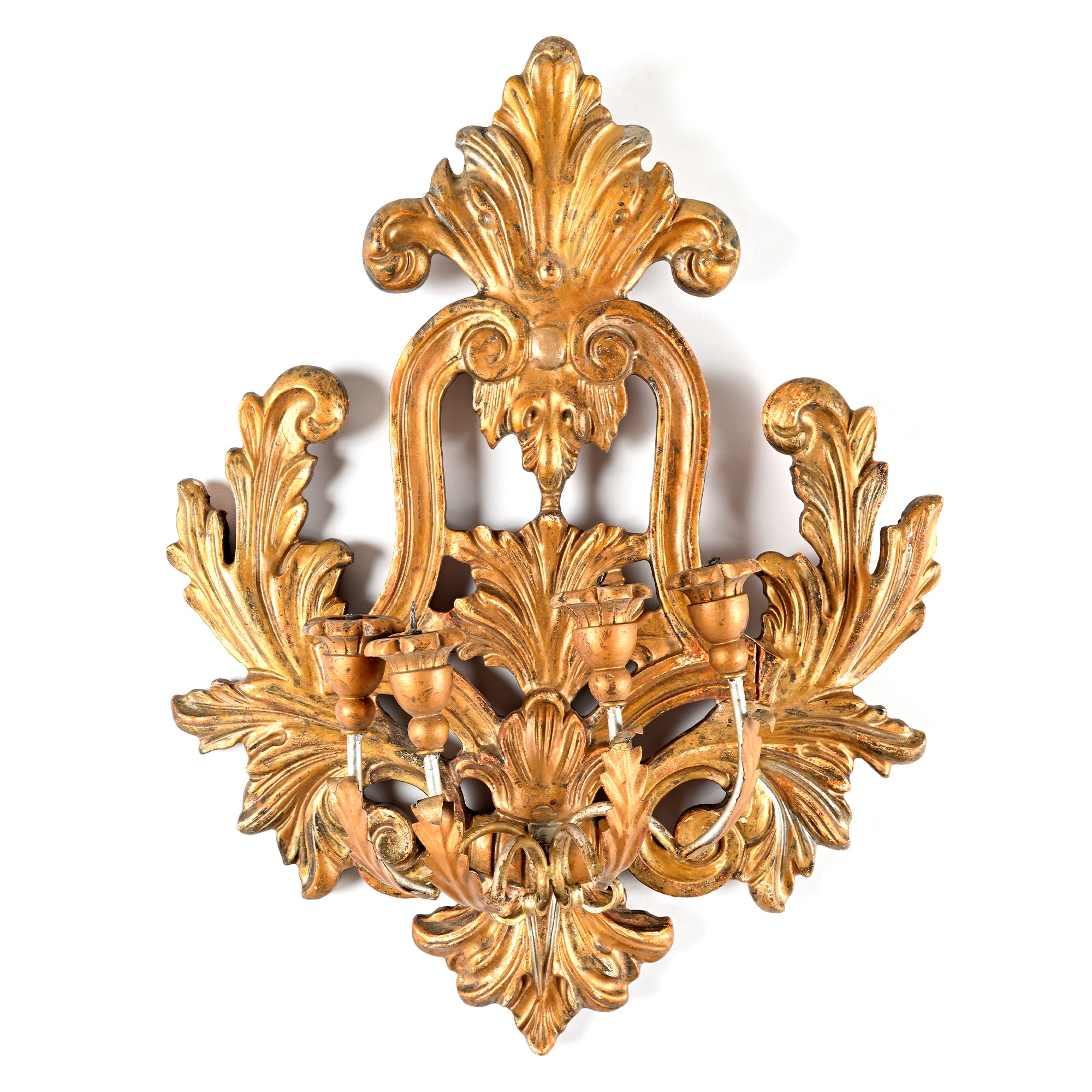 cartella parietale fogliata intagliata a volute da cui emergono quattro bracci per candela in ferro battuto, cm. 65x49 (difetti) UNITA a una coppia di bracci da parete in legno dorato a mecca in parte intagliato, cm. 34x34 circa