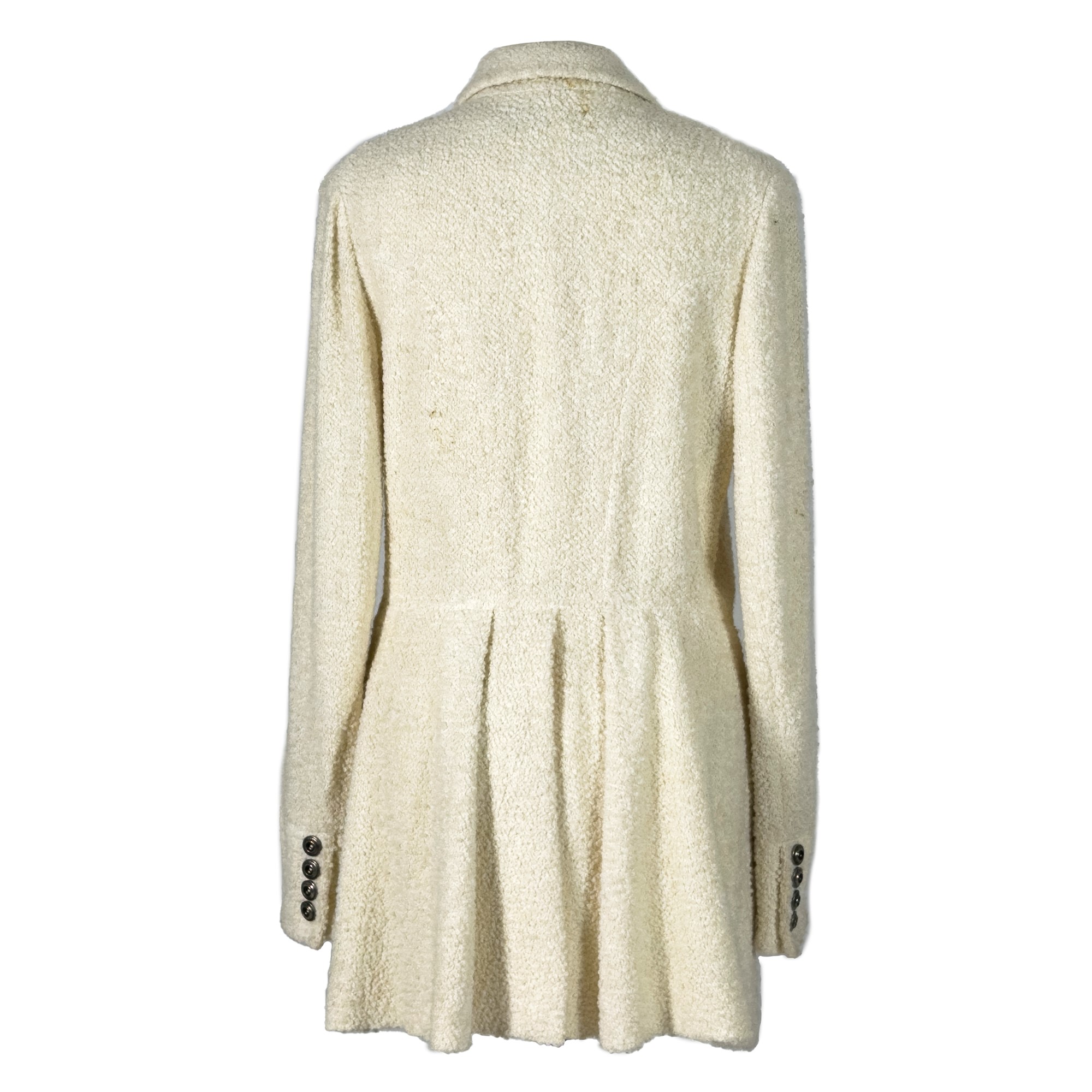 cappottino in tessuto bouclé misto lana color avorio con abbottonatura doppio petto; bottoni logati, tg. 44.