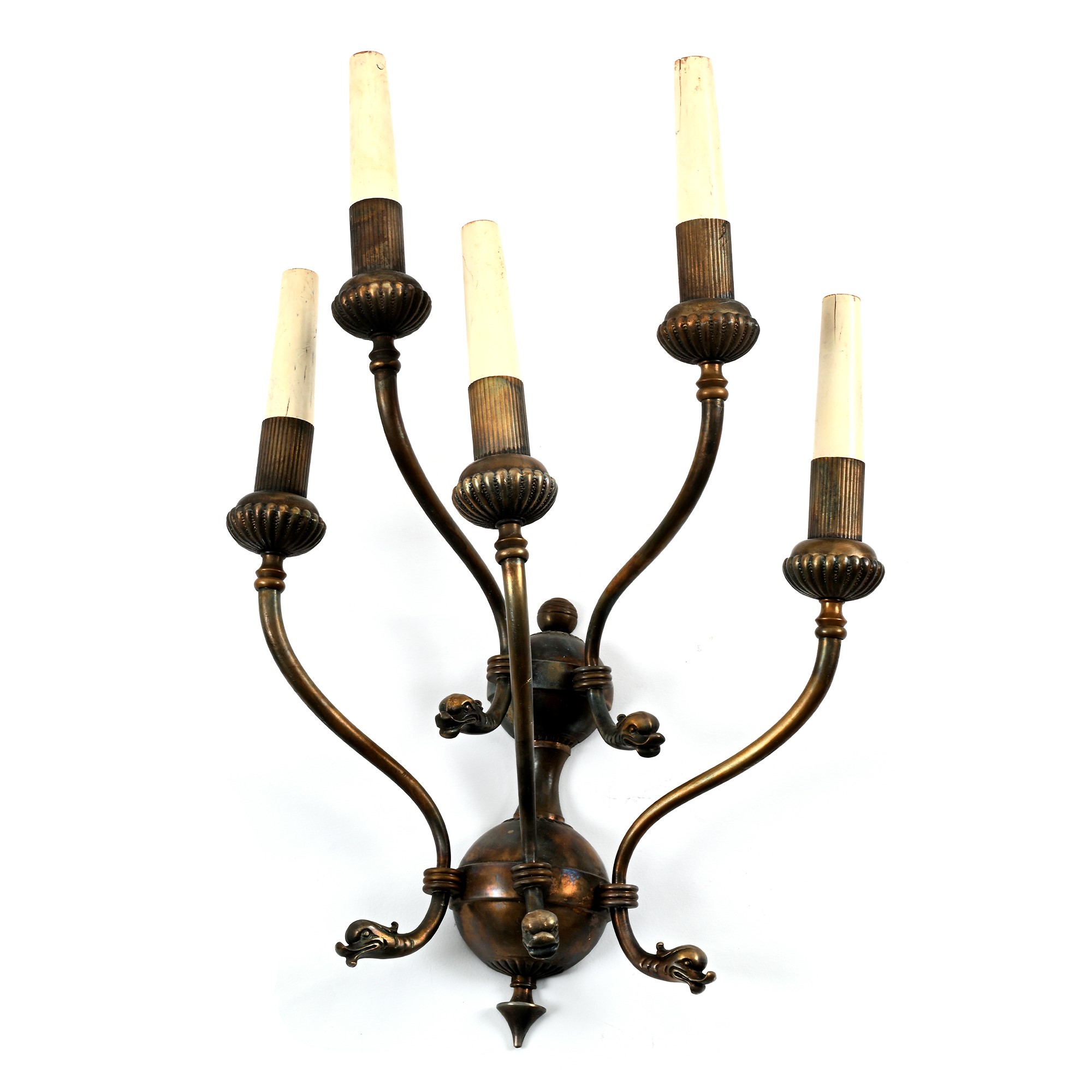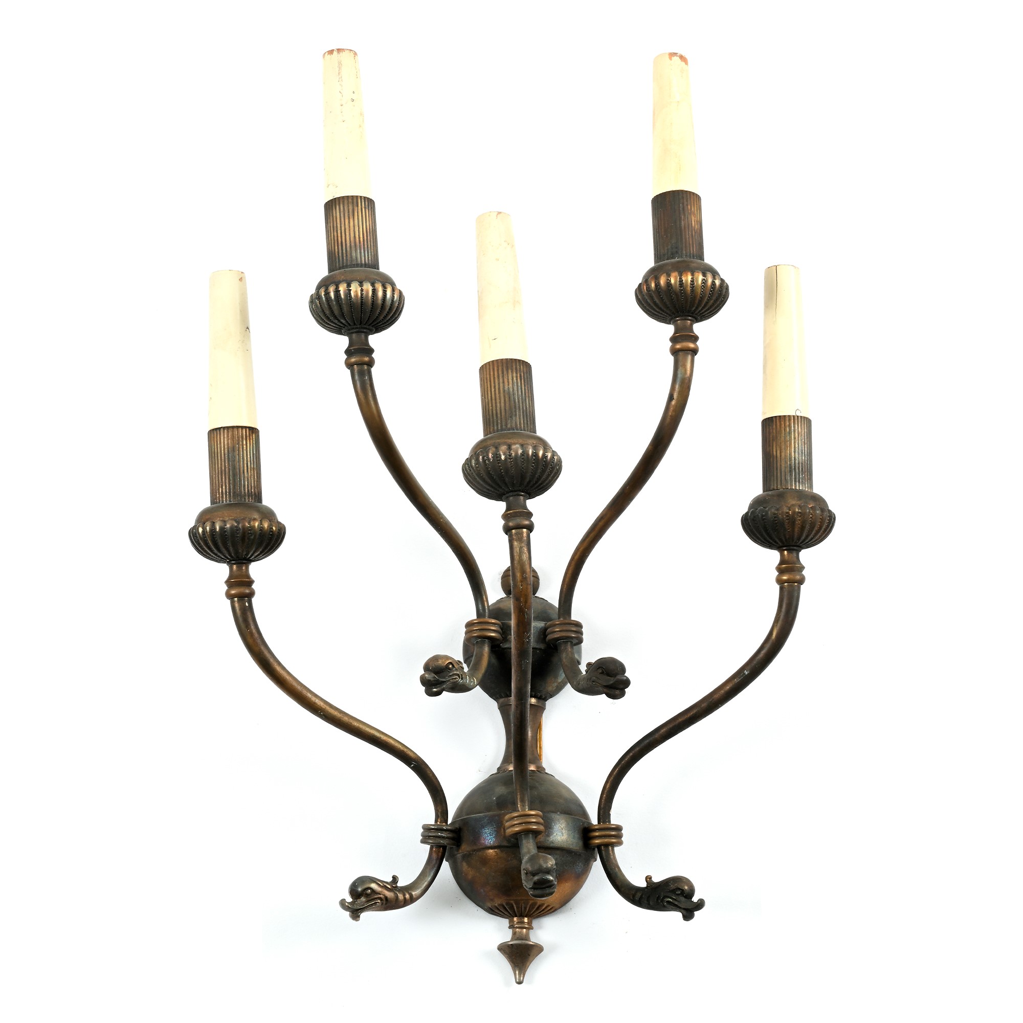 a cinque luci emergenti da braccetti centinati desinenti in una testa di delfino, sostenuti da un elemento cesellato a due semisfere sovrapposte, cm. 47x35 circa