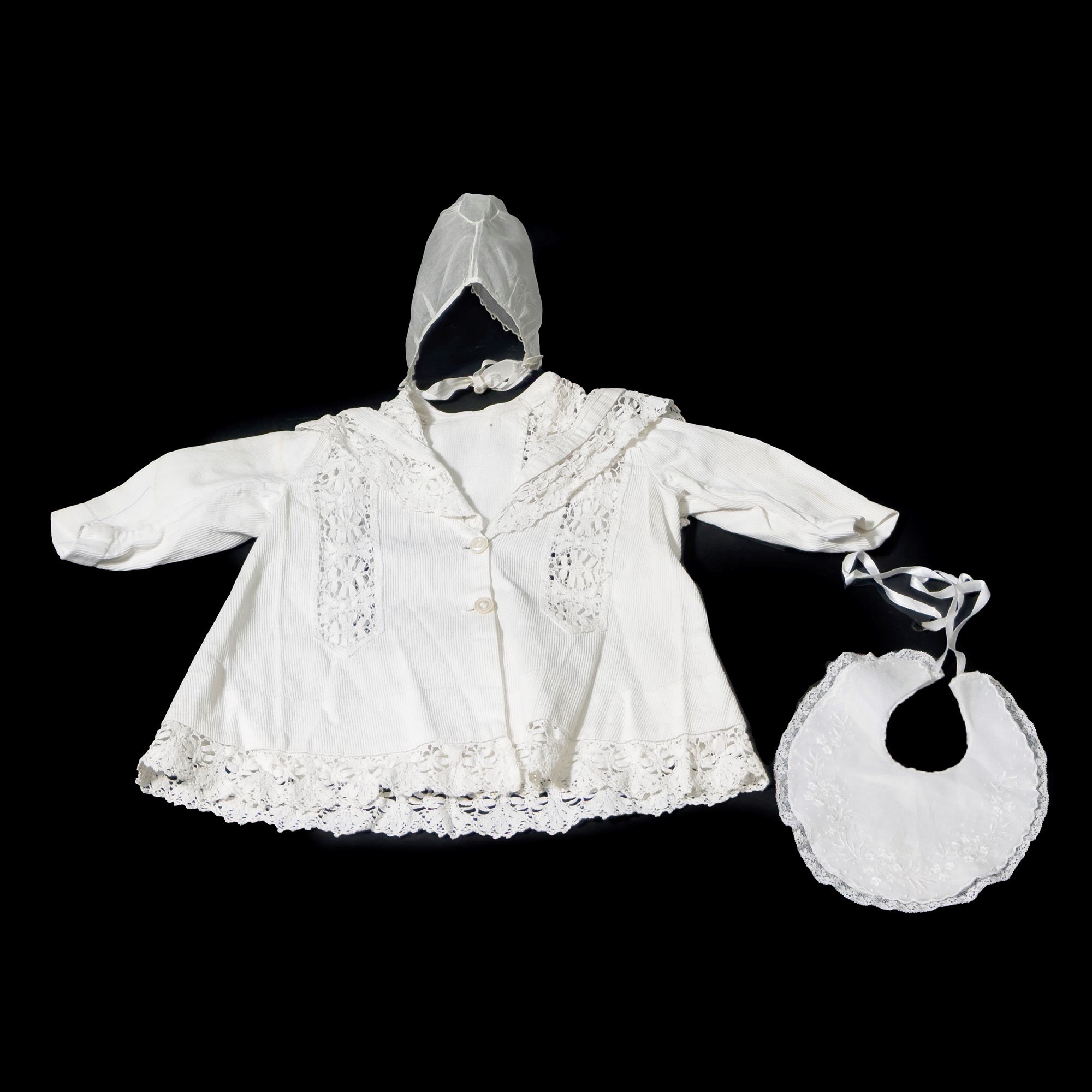 uno in organza di seta ricamata a motivi floreali con cuffietta e port-enfant, l'altro in seta con inserti in pizzo UNITI a una camiciola in cotone con inserti in pizzo e a un bavaglino ricamato.