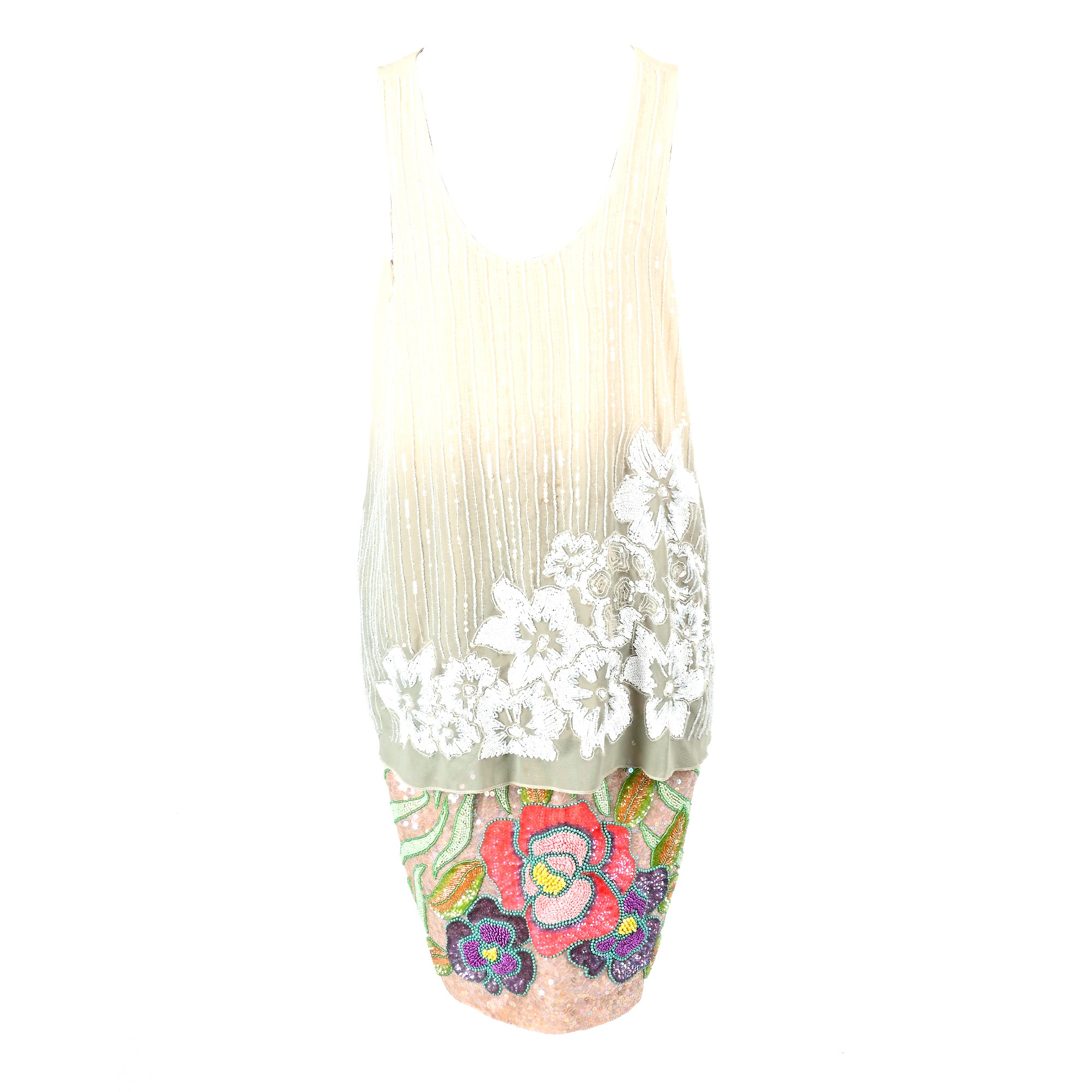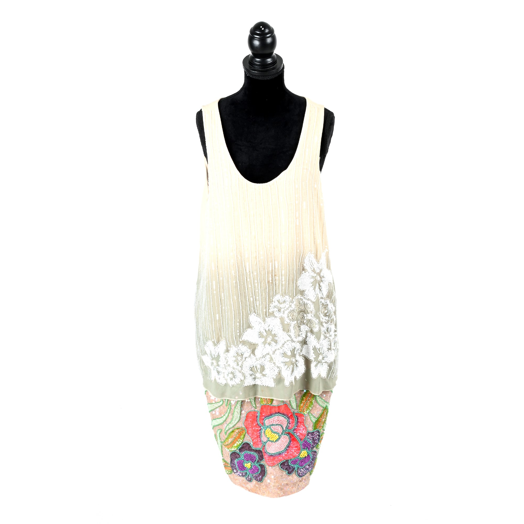 interamente ricamata in paillettes, perline e canottiglia a motivi fogliati e floreali, tg. 42 UNITA a una canottiera in seta beige ricamata in paillettes e perline a motivi floreali, tg. 46.