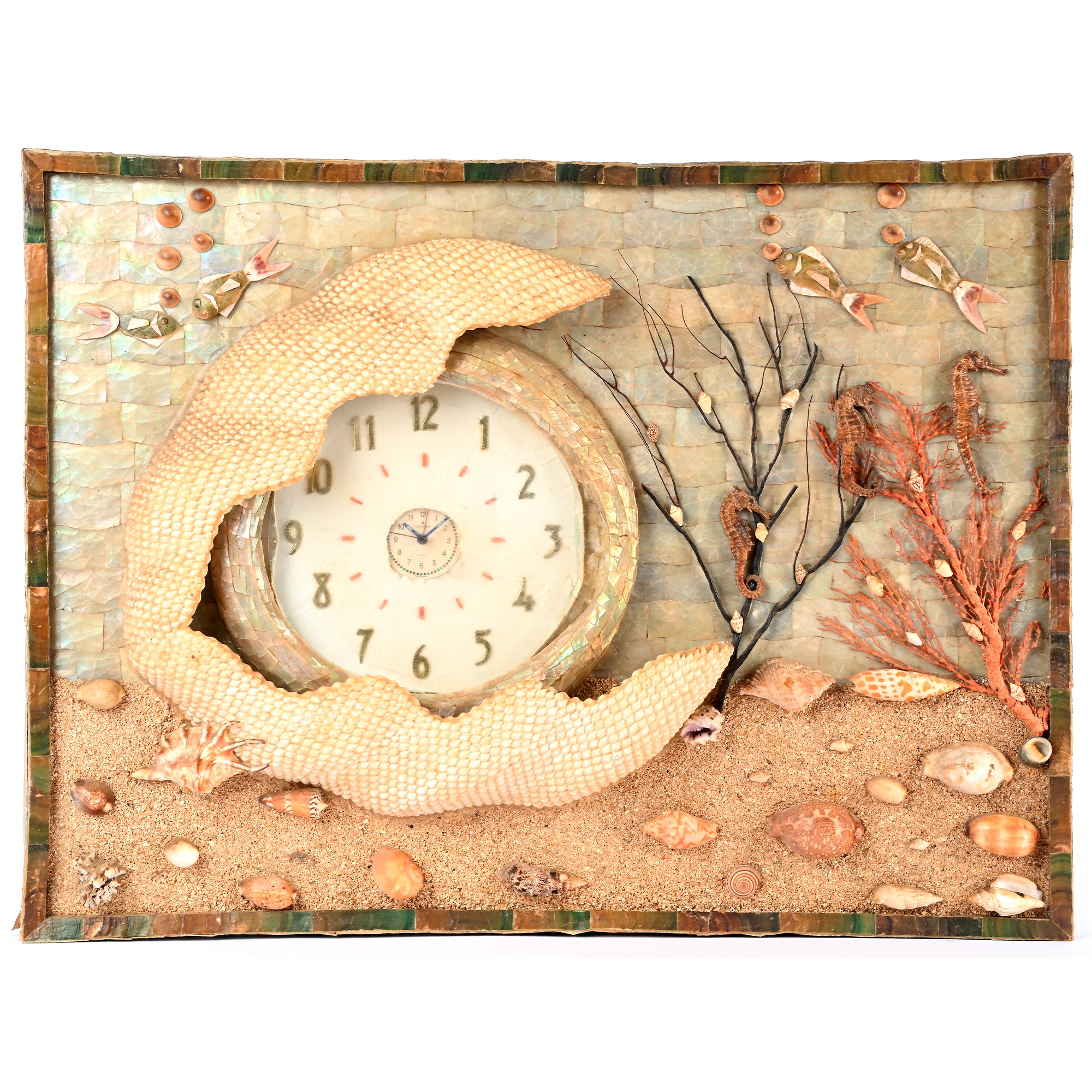 caratterizzato da numerosissime conchiglie di differenti specie, d. cm. 51 (qualche mancanza) UNITO a un orologio da muro di forma rettangolare simulante un fondale marino con coralli, conchiglie e pesci, cm. 53,5x70 (qualche difetto)