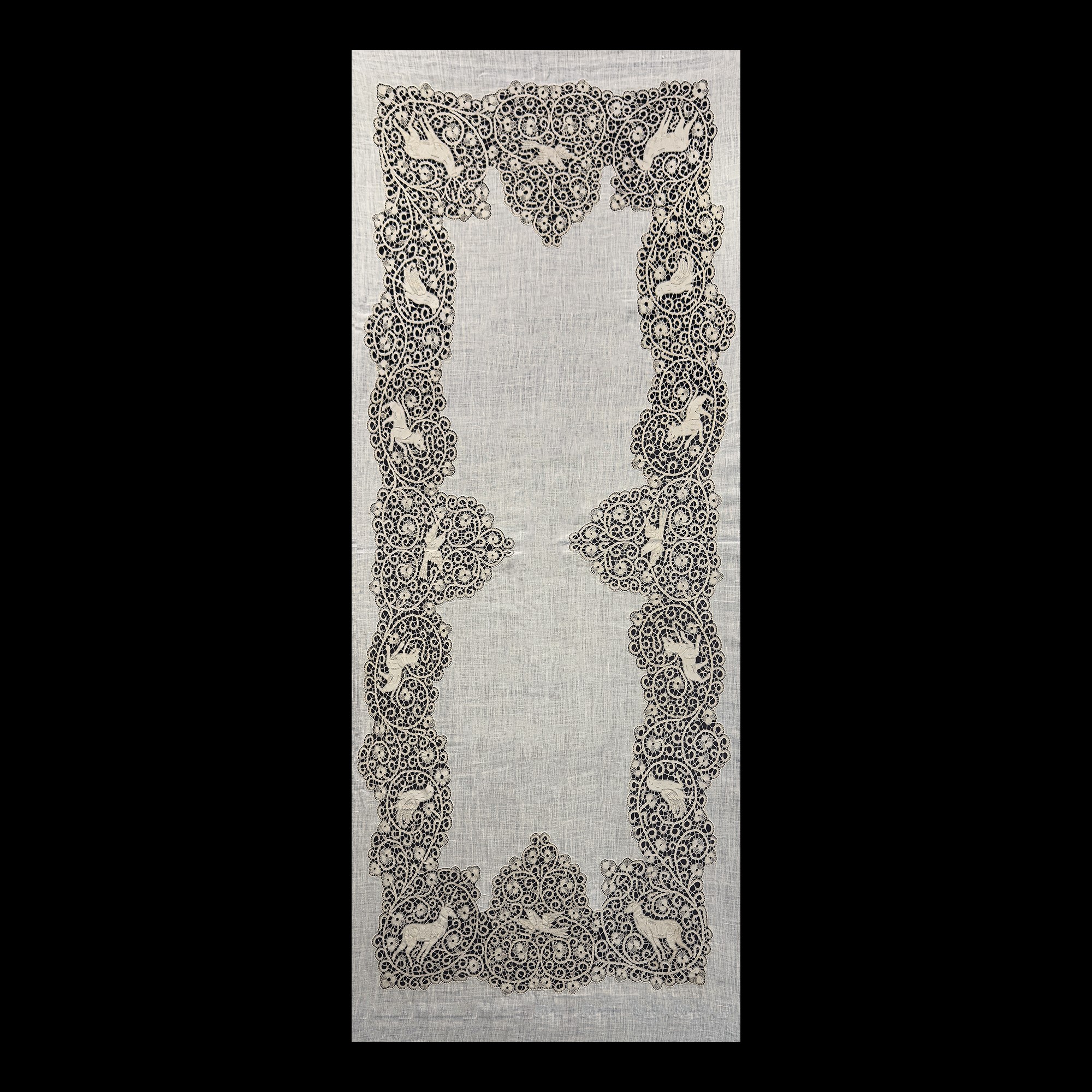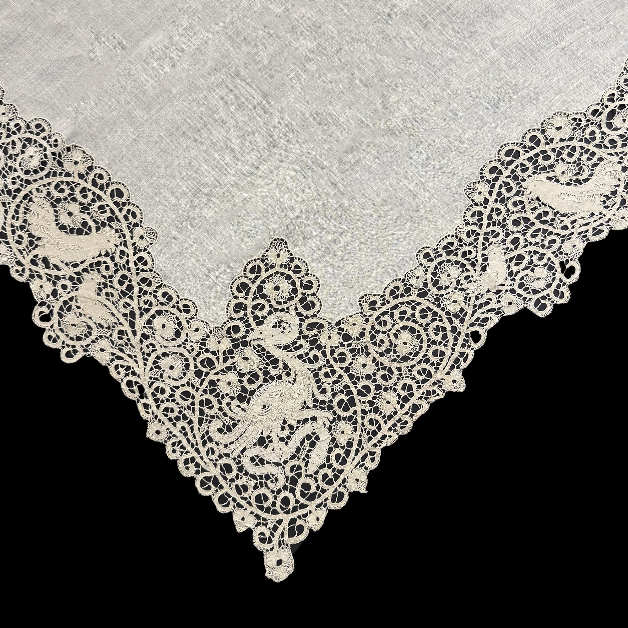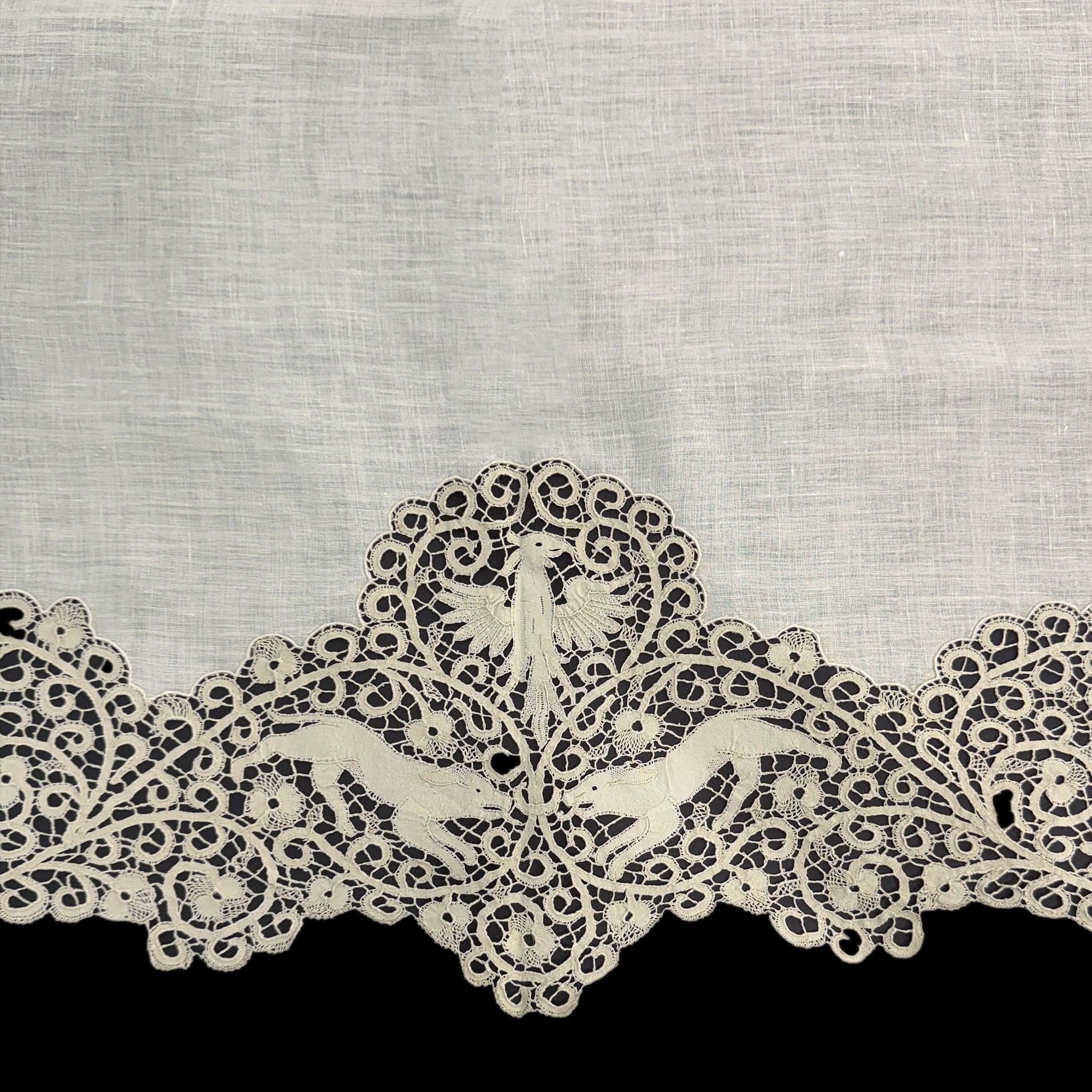 con iniziale E ricamata, bordo in pizzo a tombolo con uccelli e cani UNITA a 12 tovaglioli con la medesima iniziale ricamata, la tovaglia; cm. 280x160 circa (qualche macchia)