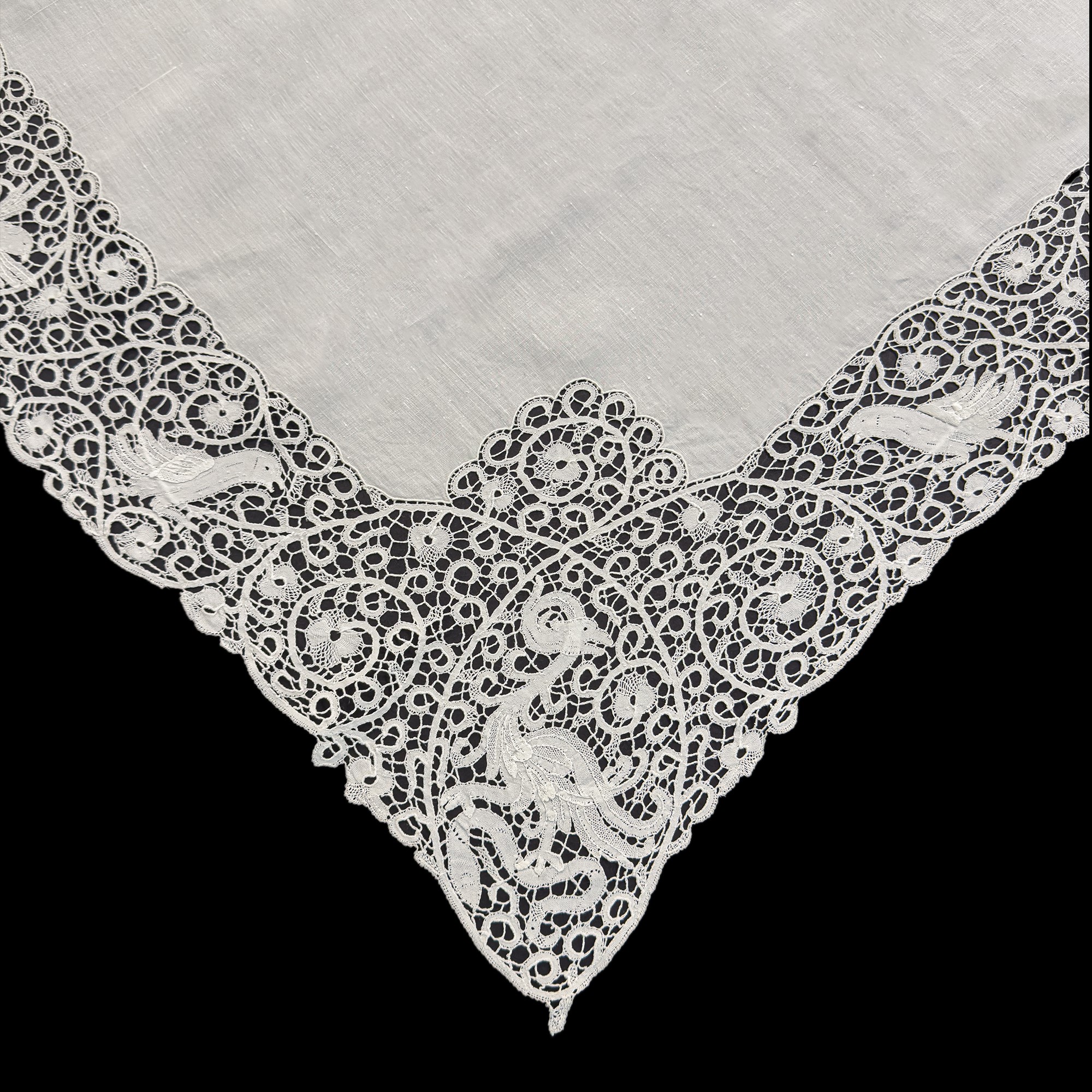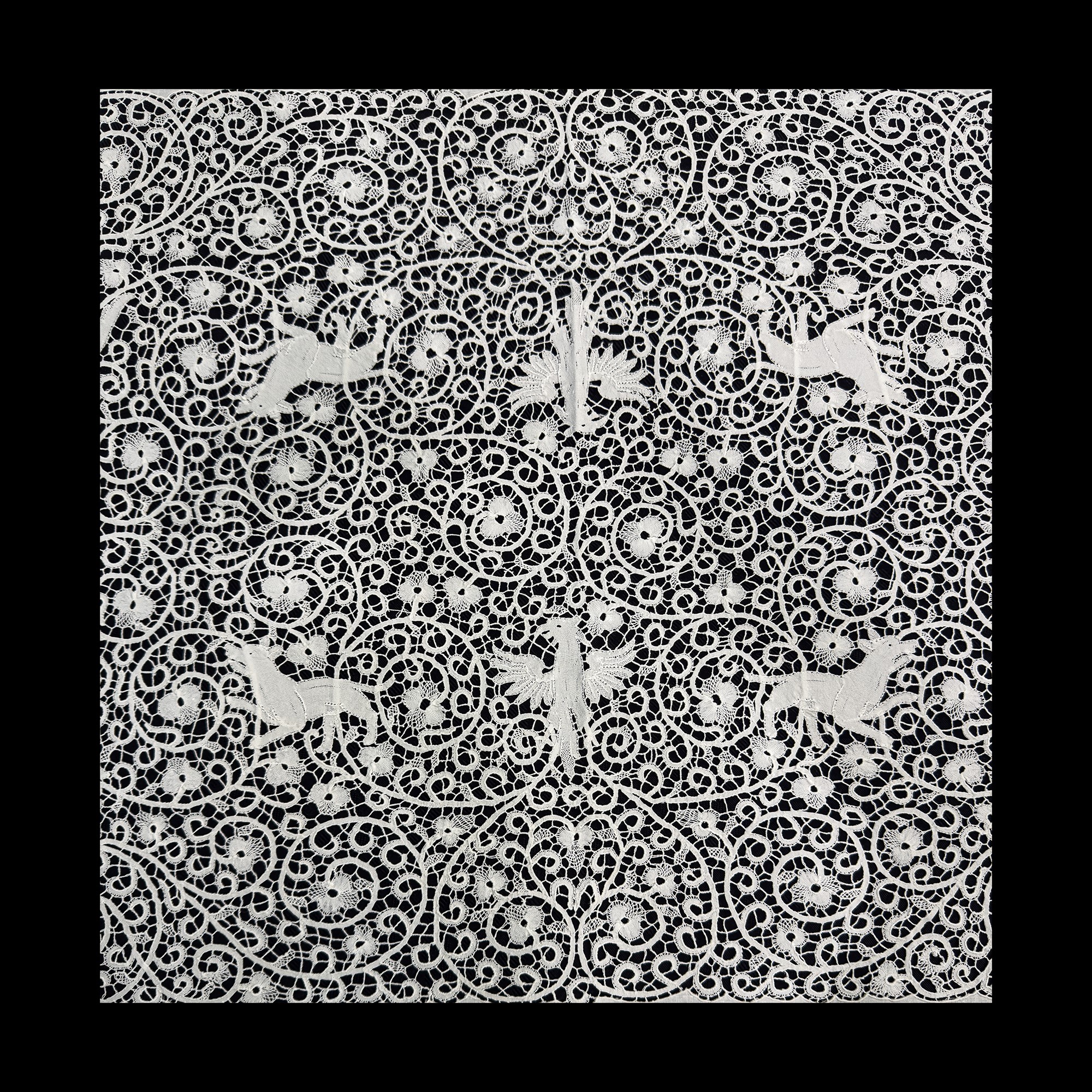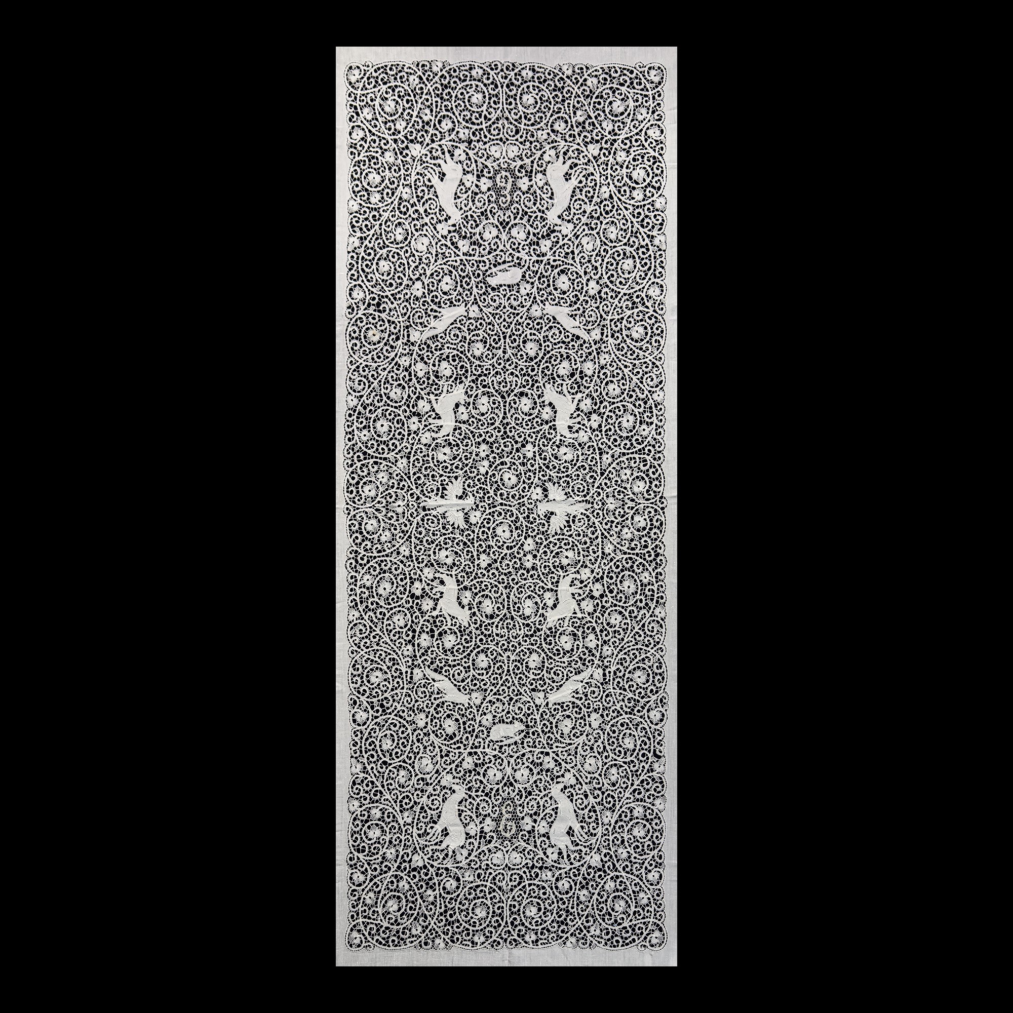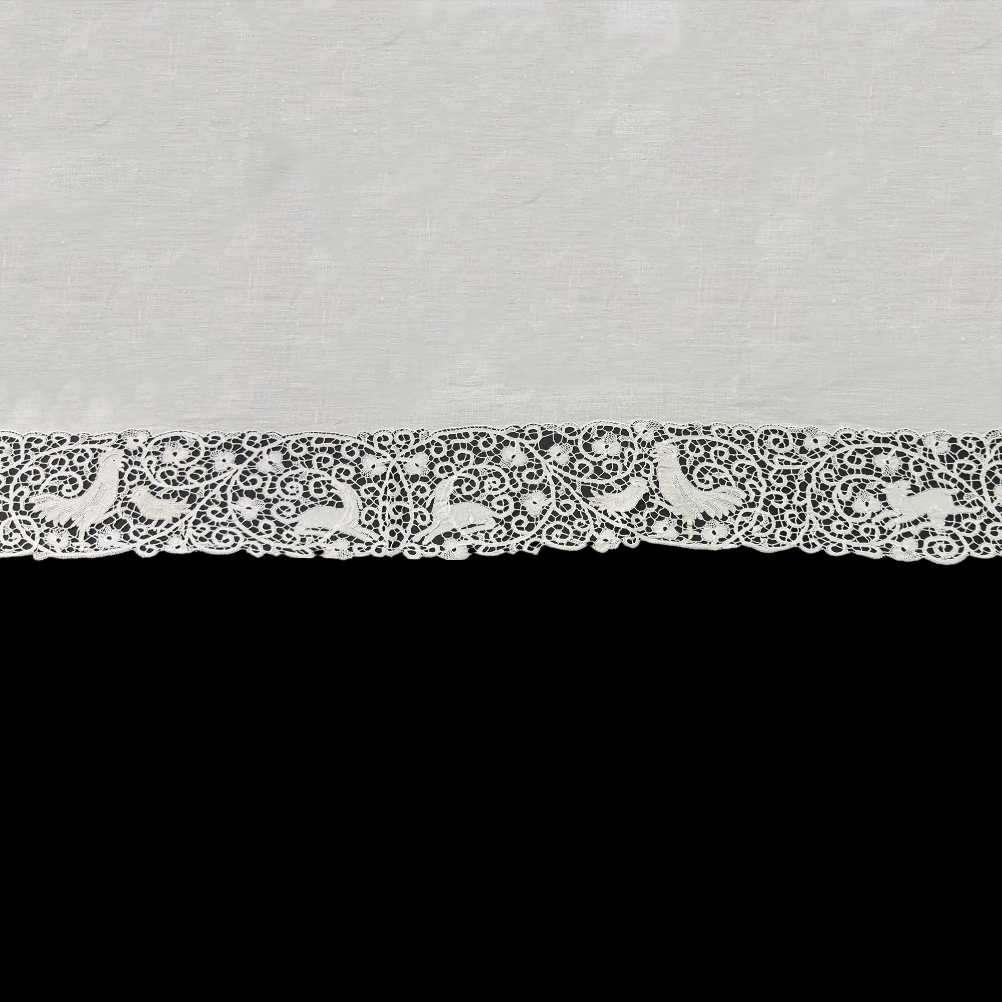 Tovaglia in lino bianco arricchito da applicazioni di pizzo a tombolo con animali