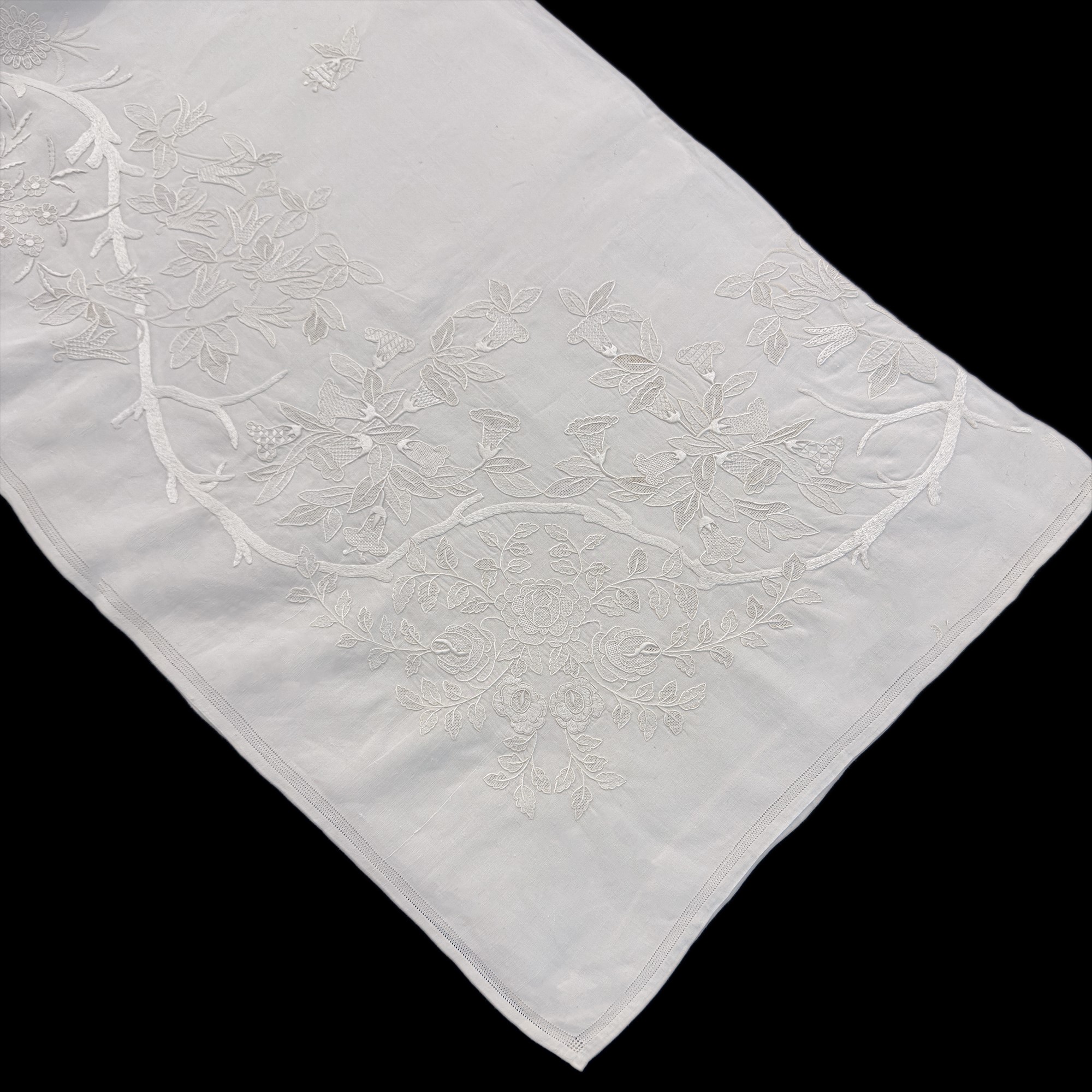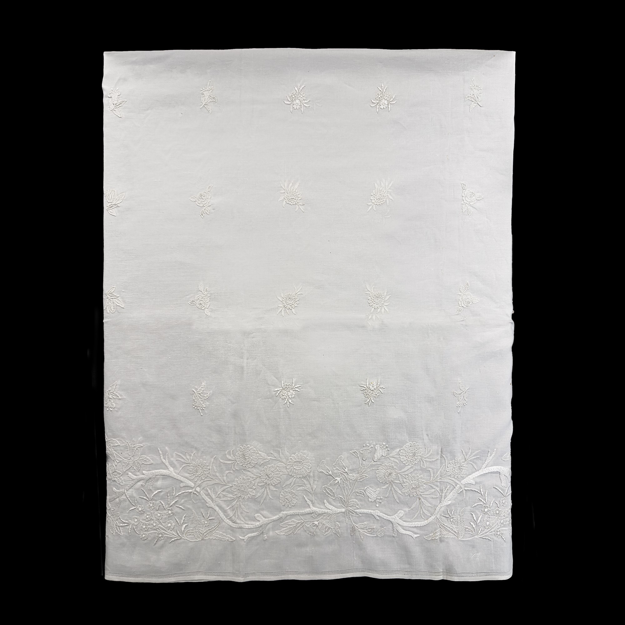 Tovaglia in lino bianco ricamato a fiori e campanule