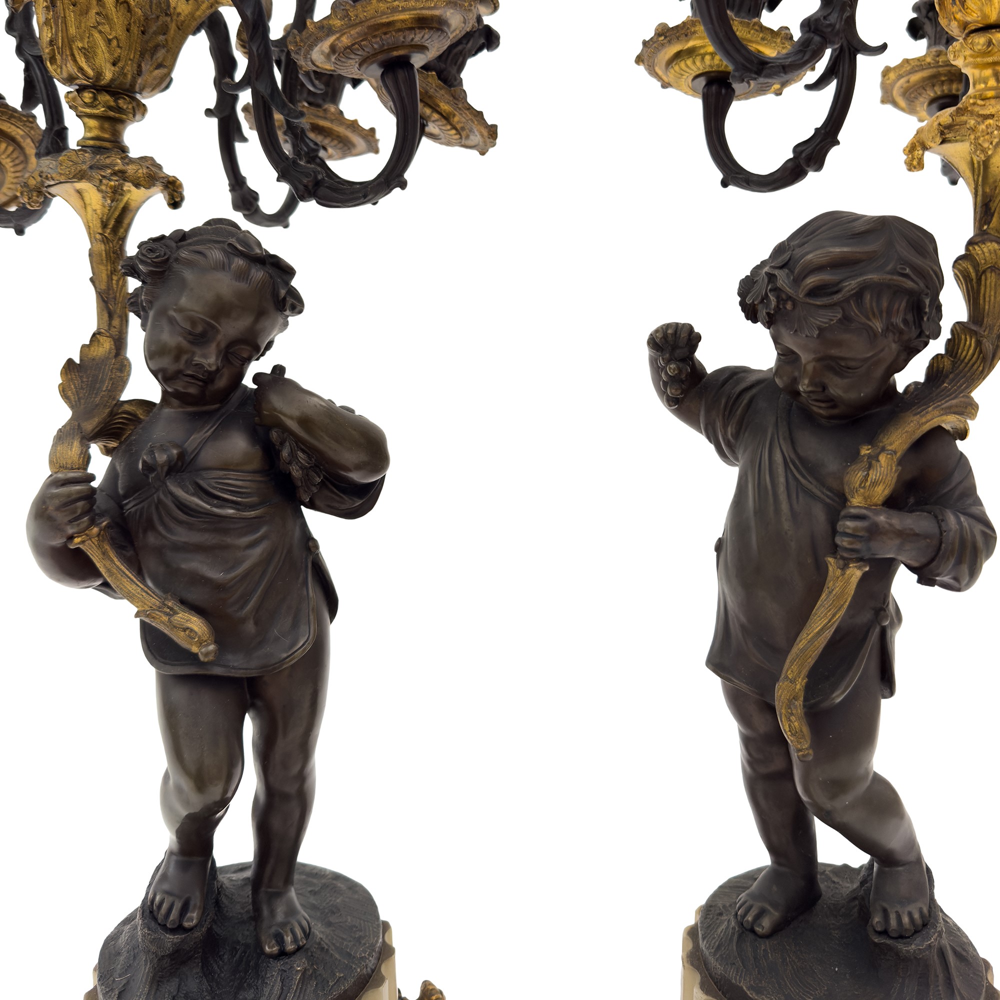 stelo cesellato rispettivamente a figura di bambino e bambina con un grappolo d'uva in mano che sostengono una cornucopia fogliata da cui emergono sei bracci per candela a voluta; base a colonna scanalata arricchita da festoni, h. cm. 73