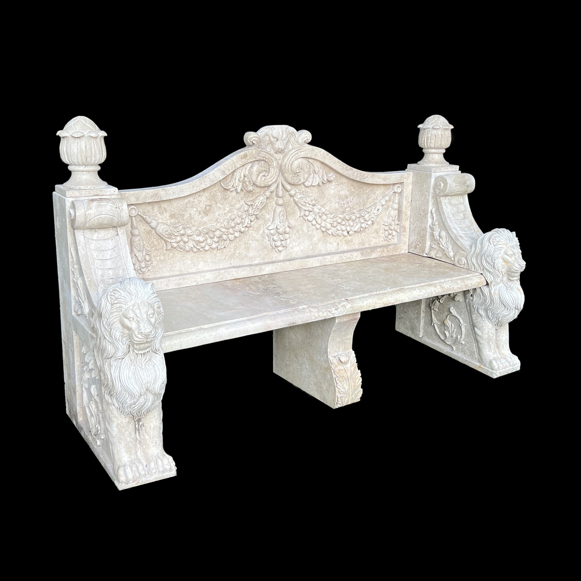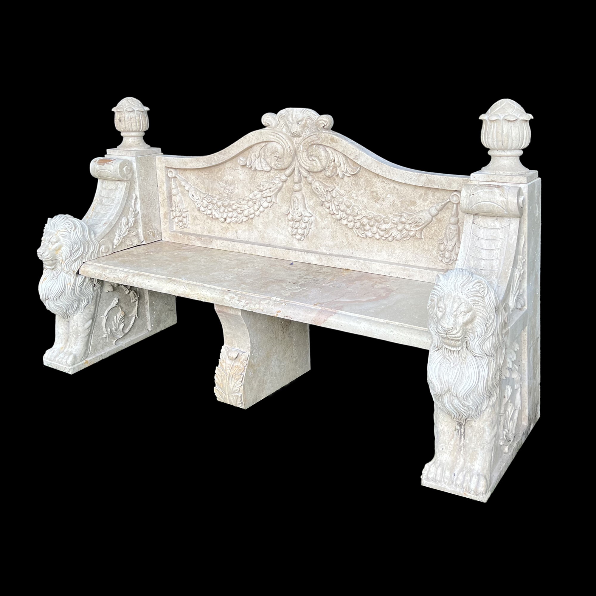 schienale dal profilo superiore centinato, qualificato da festoni di frutti scolpiti e delimitato da due vasi fogliati; braccioli a voluta anticipati da un'erma leonina, cm. 110x180x70