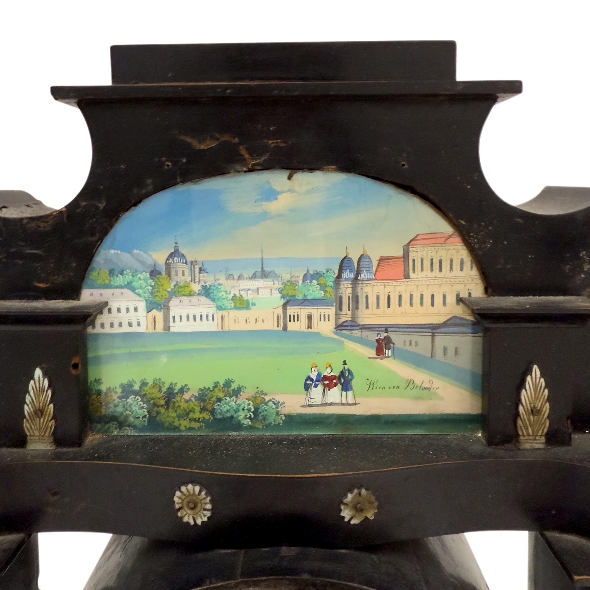 in legno ebanizzato. Cassa circolare affiancata da due colonne in alabastro e sovrastata dall'immagine del Belvedere a Vienna; base parallelepipeda, cm. 59,5x36x13,5 (difetti)