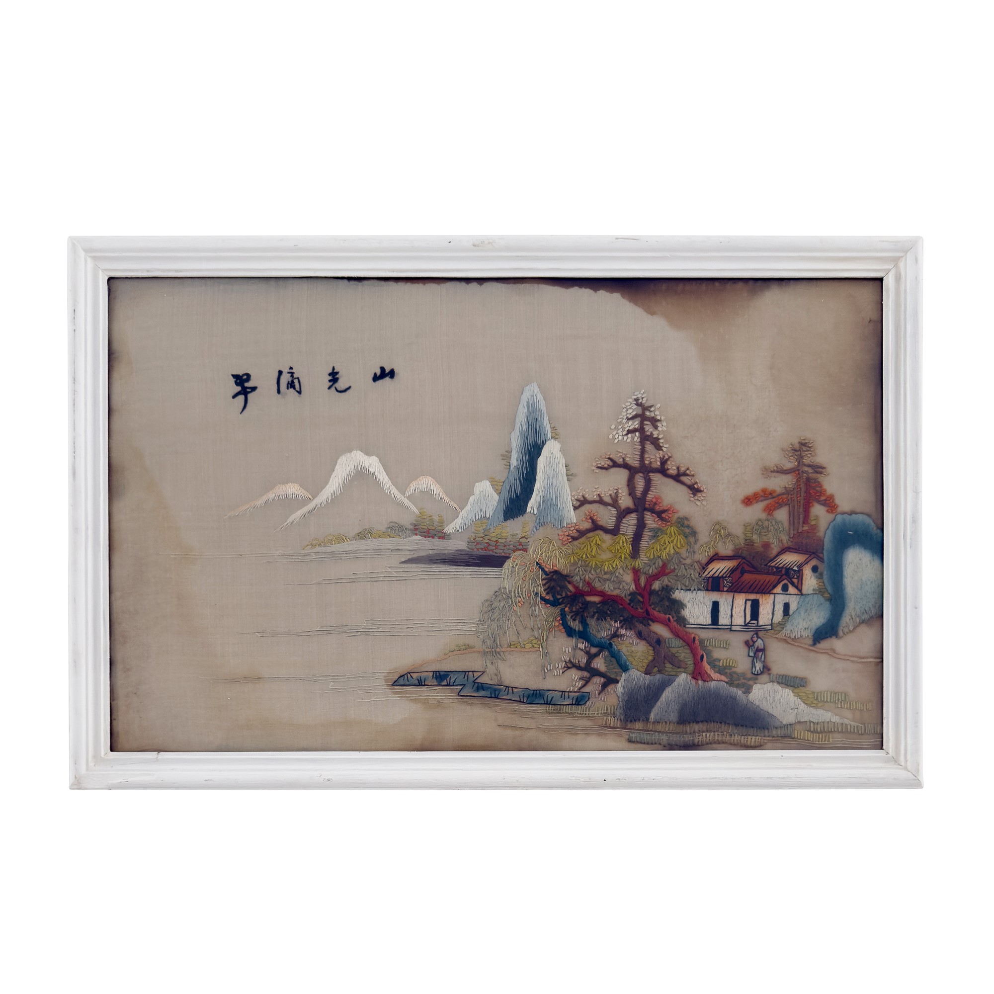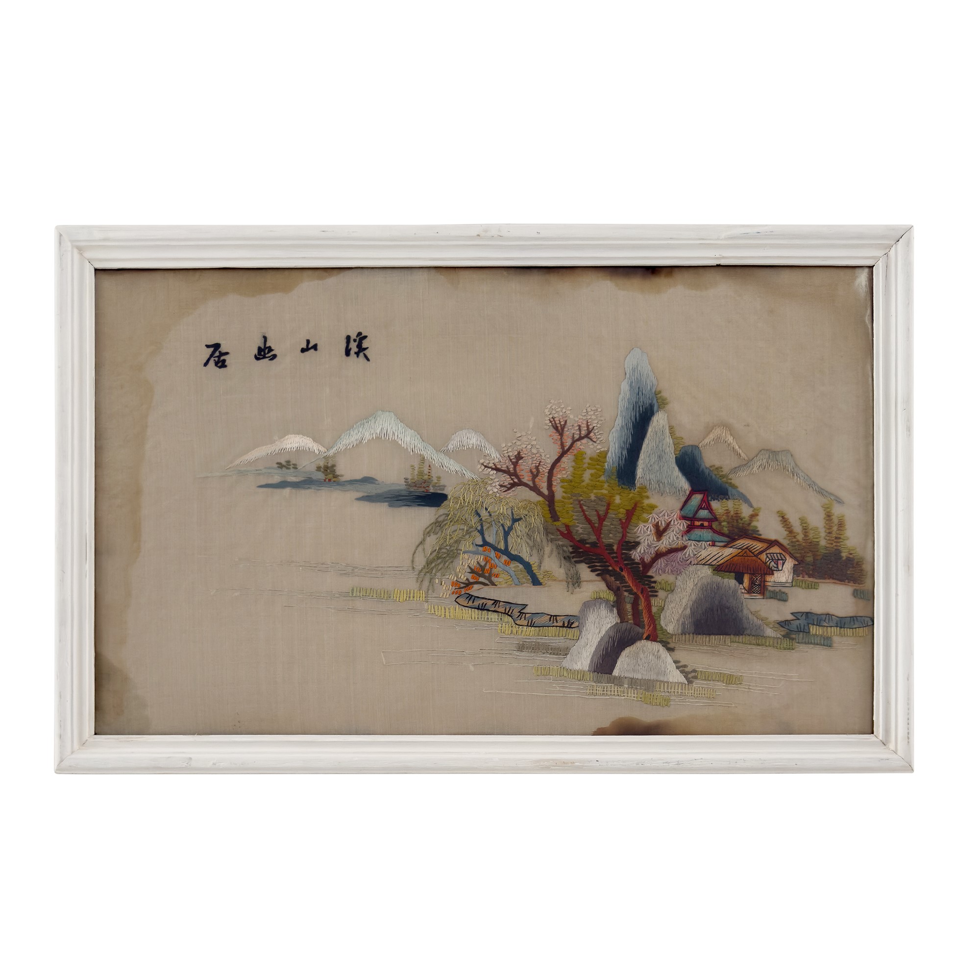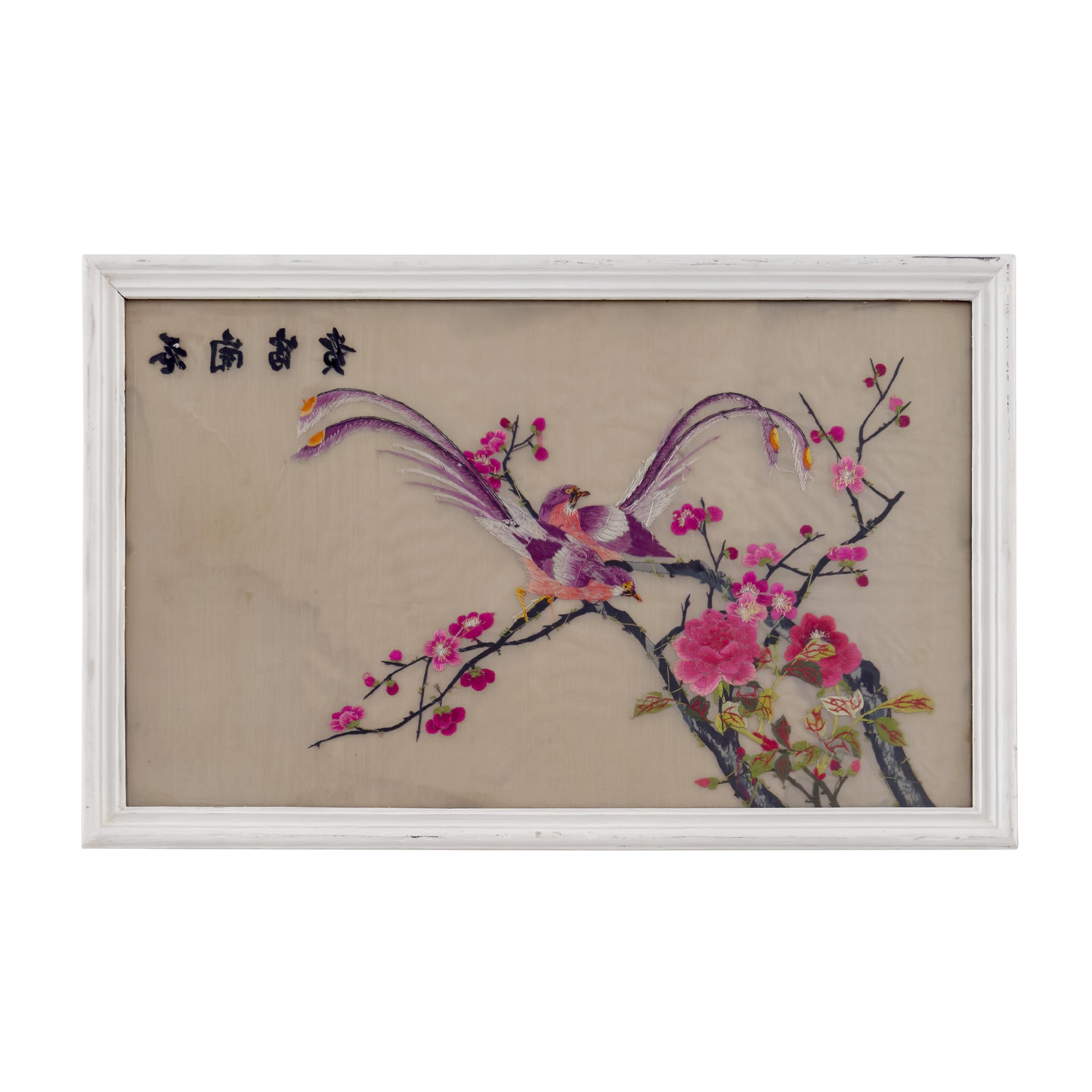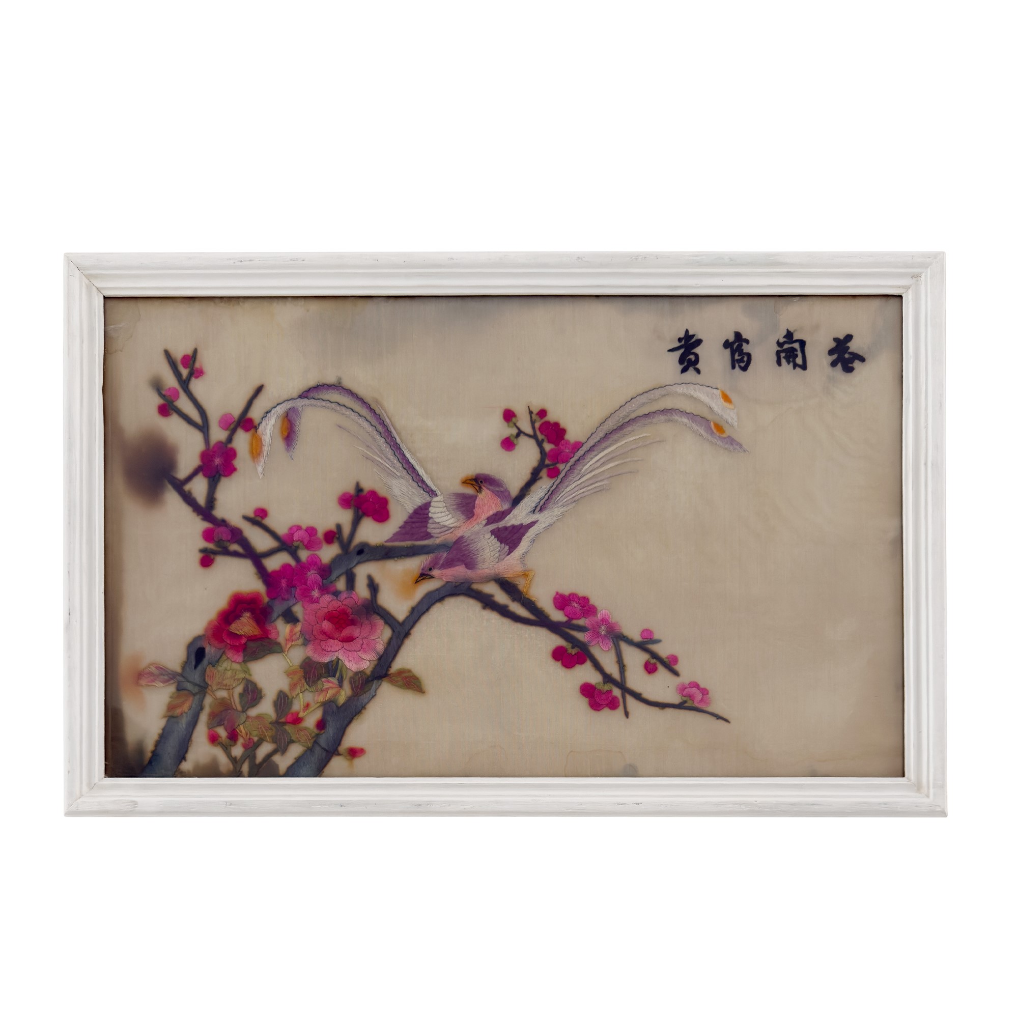 raffiguranti rispettivamente rami di pruno con volatili e paesaggi orientali, resi in vivace policromia, massimo ingombro: cm. 41x65 (difetti)