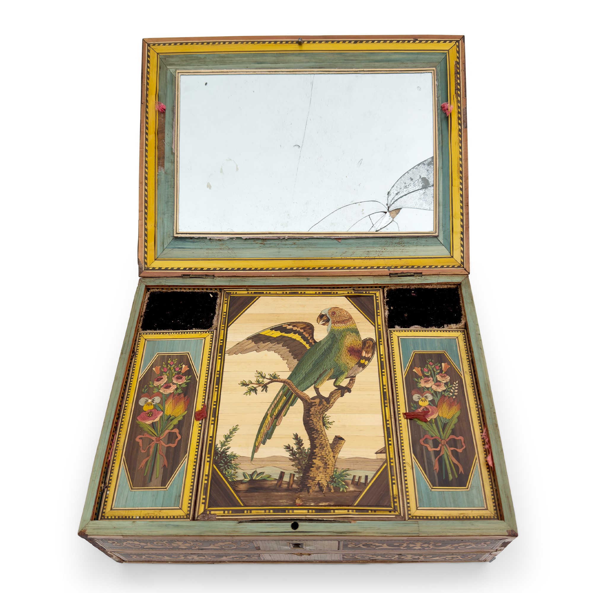 coperchio decorato da una veduta marina eseguita con pagliuzze, apribile su vano all'uopo caratterizzato da scomparti decorati con la medesima tecnica a raffigurare pappagalli, architetture, mazzi di fiori e altri soggetti ispirati all'amore; un tiretto sul fronte, cm. 8,5x27x20 (difetti significativi)