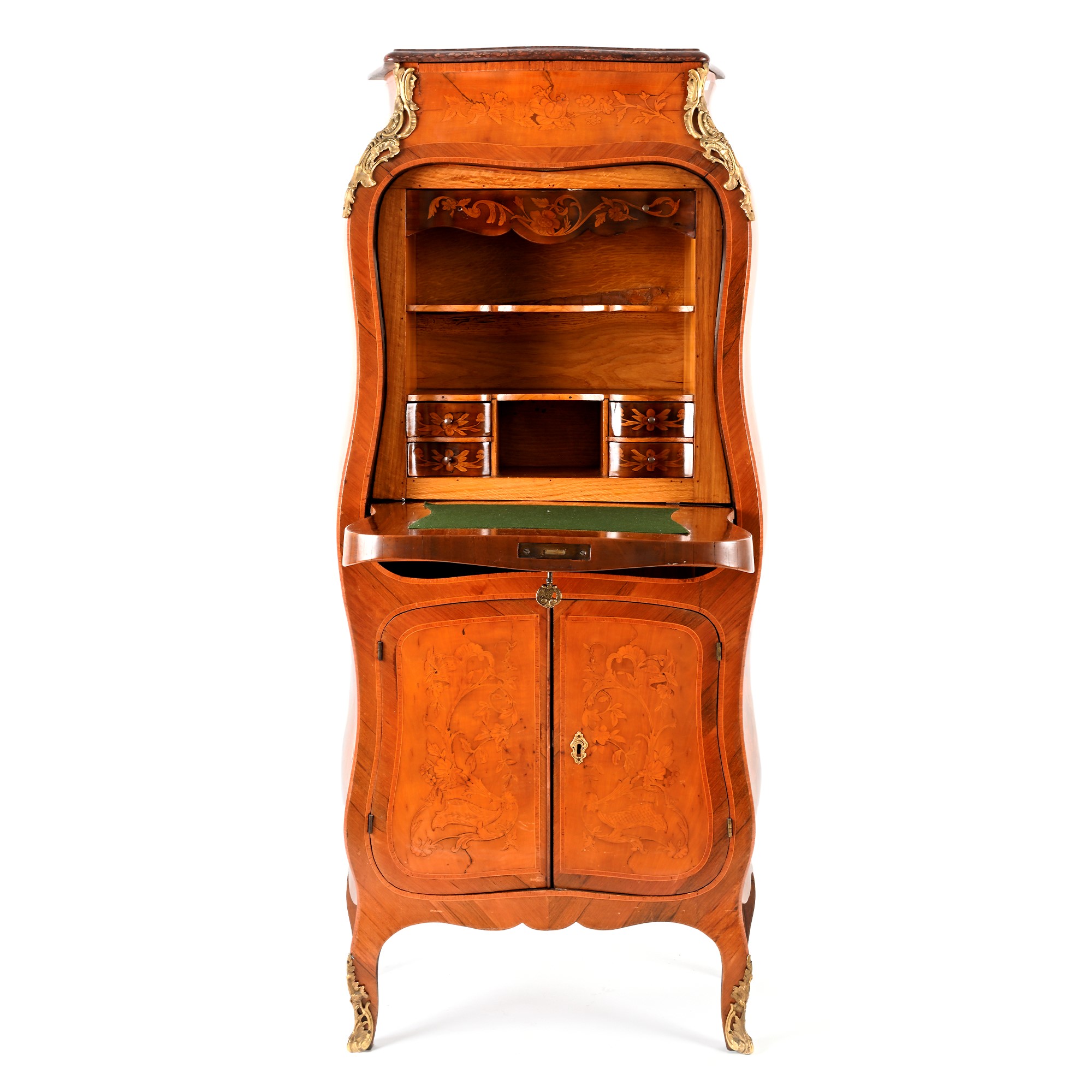 di forma centinata, finemente intarsiato a motivi vegetali e floreali. Fronte scandito da una calatoia sovrastante due portine, apribile su vano guarnito di un cassetto e quattro tiretti; applicazioni di bronzi cesellati e dorati, cm. 143x63x26
