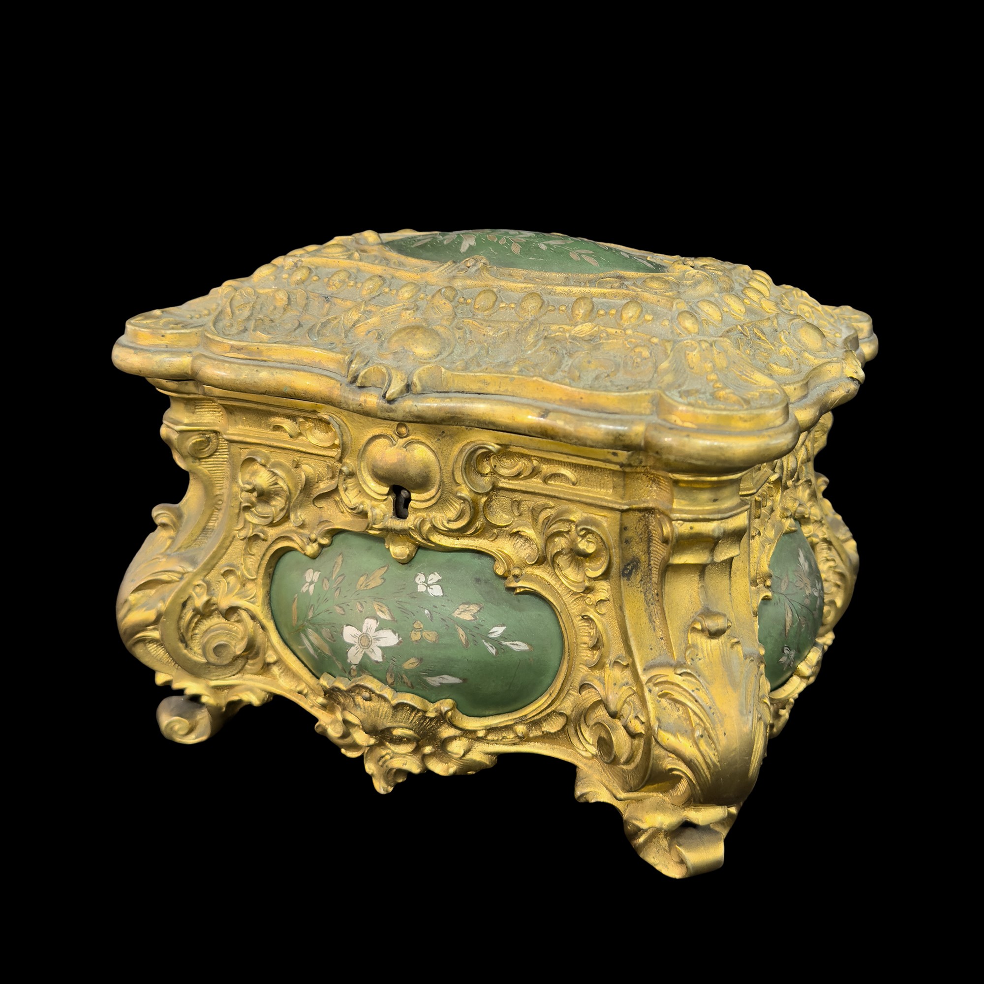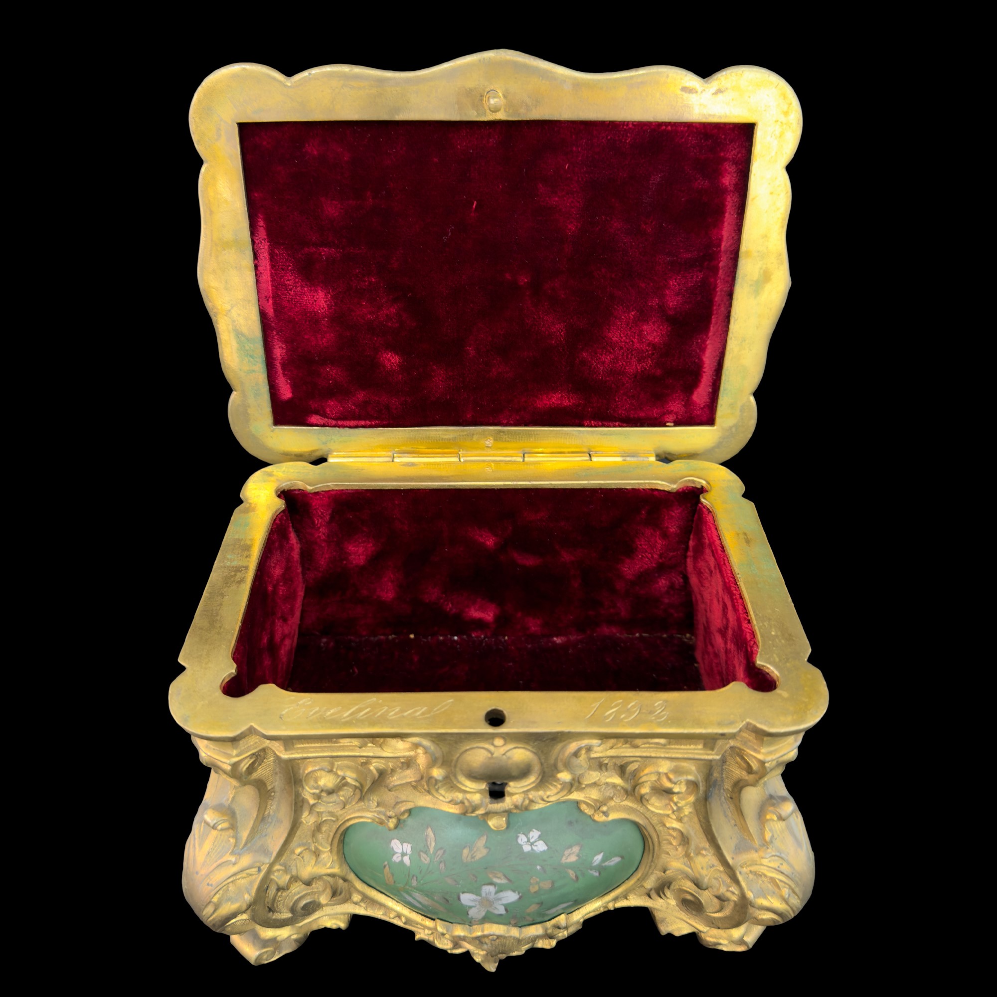 riccamente cesellato a volute fogliate e rocailles; riserve bombate dipinte e motivi floreali so fondo verde. Sul bordo anteriore la dedica: Evelina 1892, cm. 14x18x13