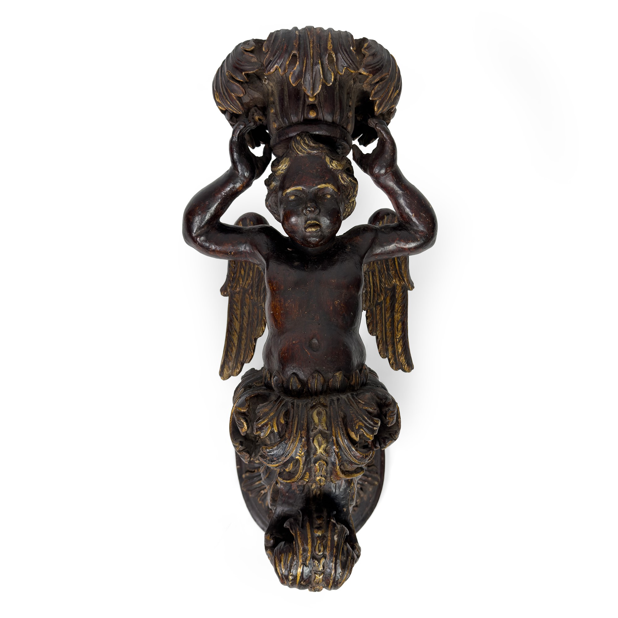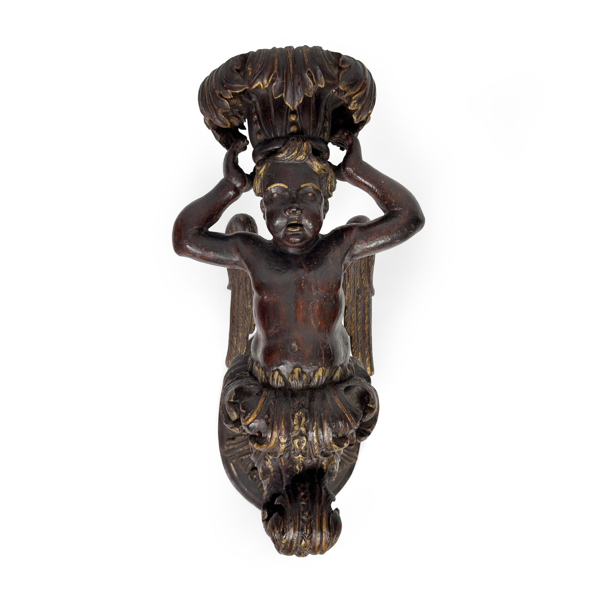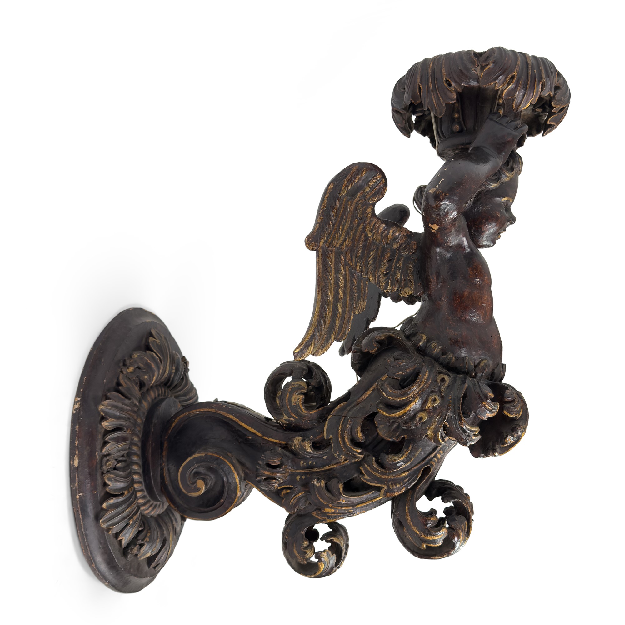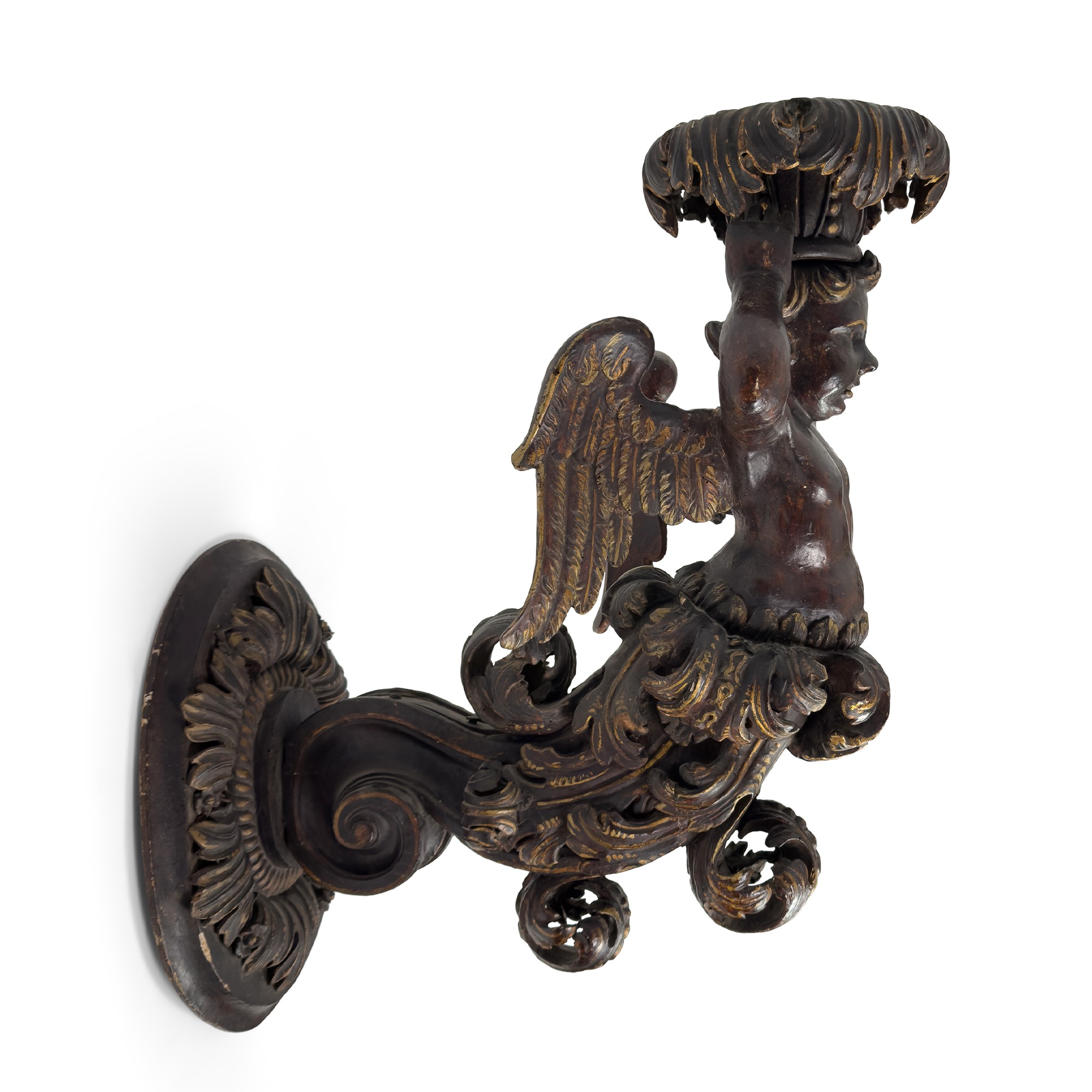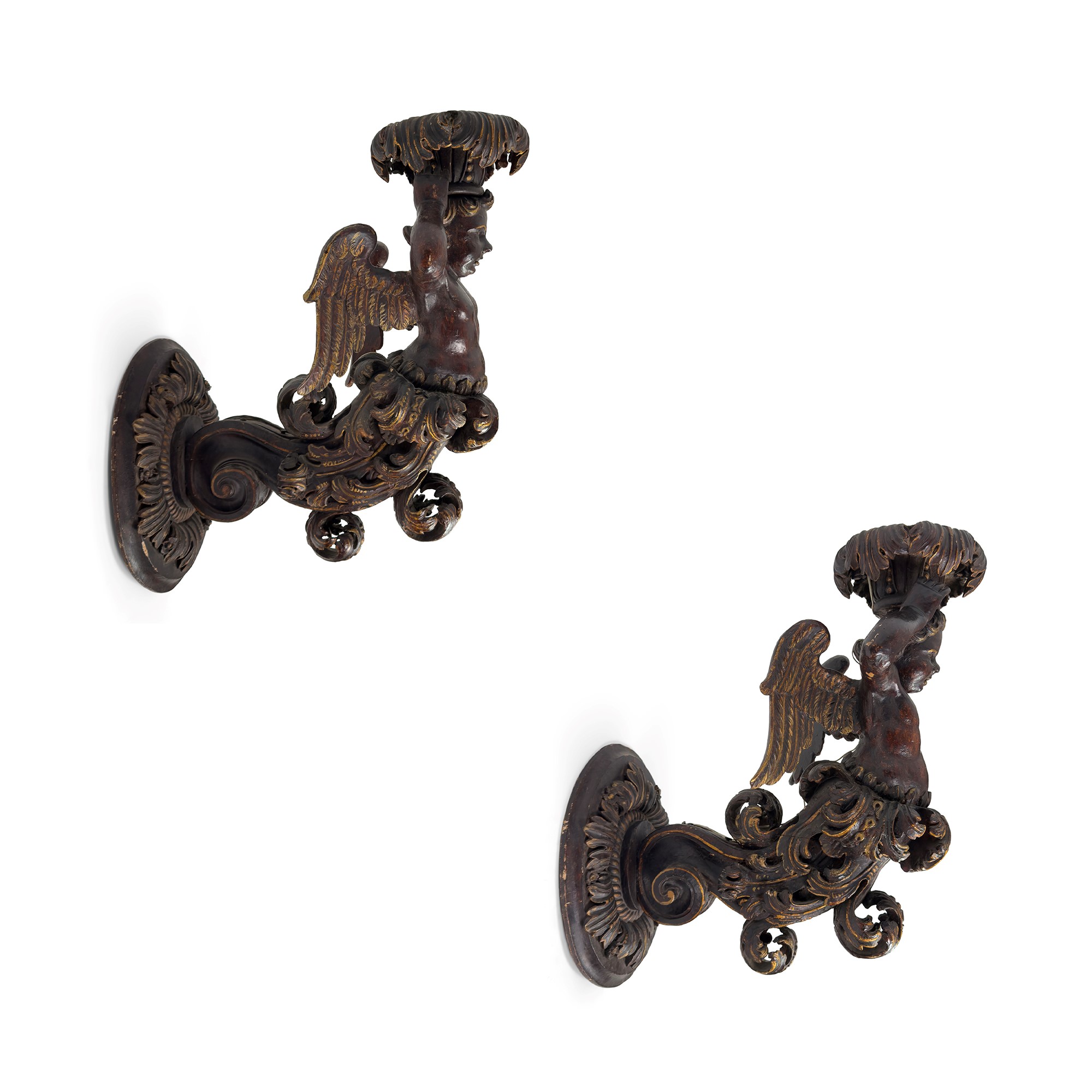Coppia di importanti bracci da parete in legno lumeggiato in oro, Venezia, XVII secolo