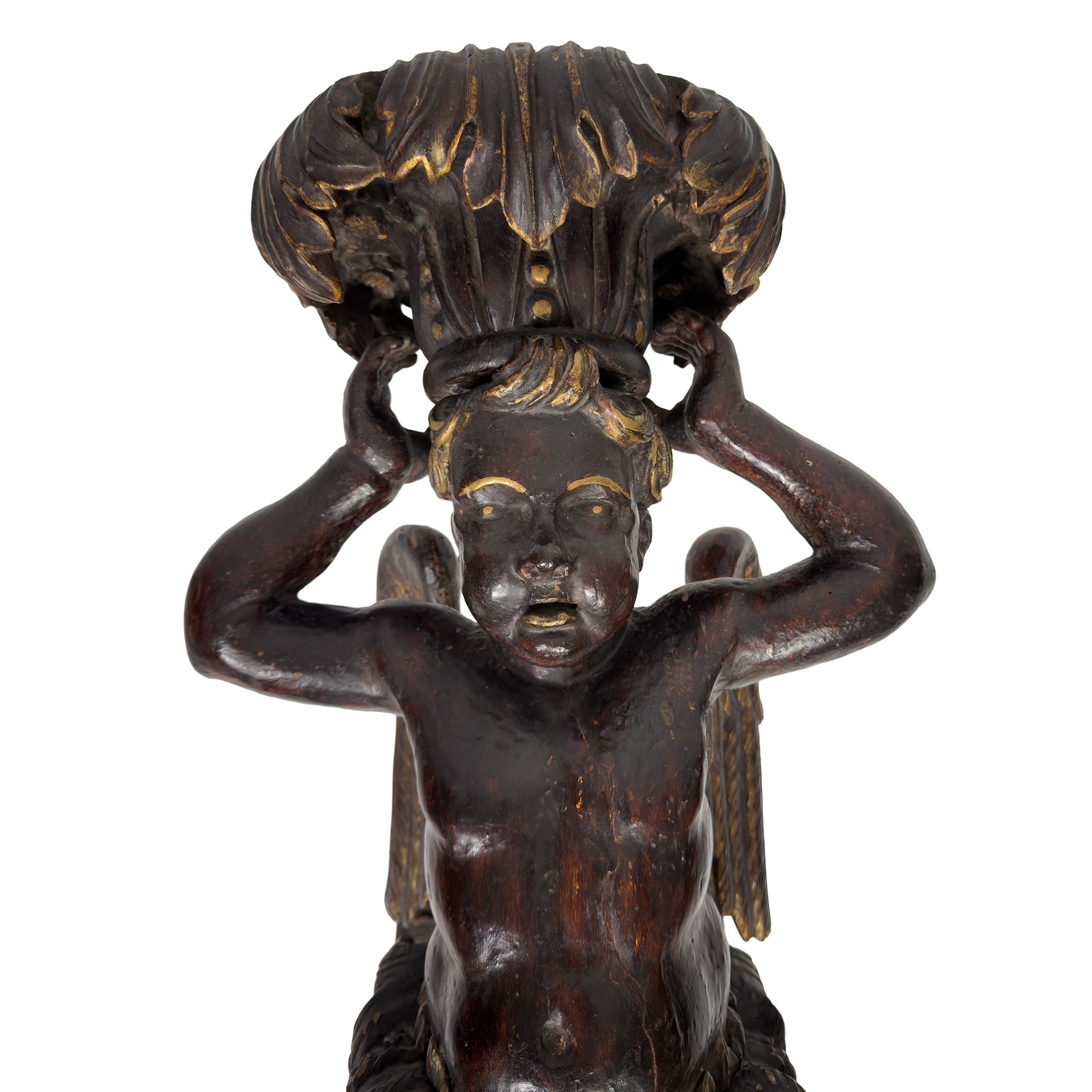 finemente intagliati a raffigurare una cariatide di putto alato che sorregge un cespo fogliato; cartella parietale ovale scolpita a corpose volute, cm. 80x70x38 circa
