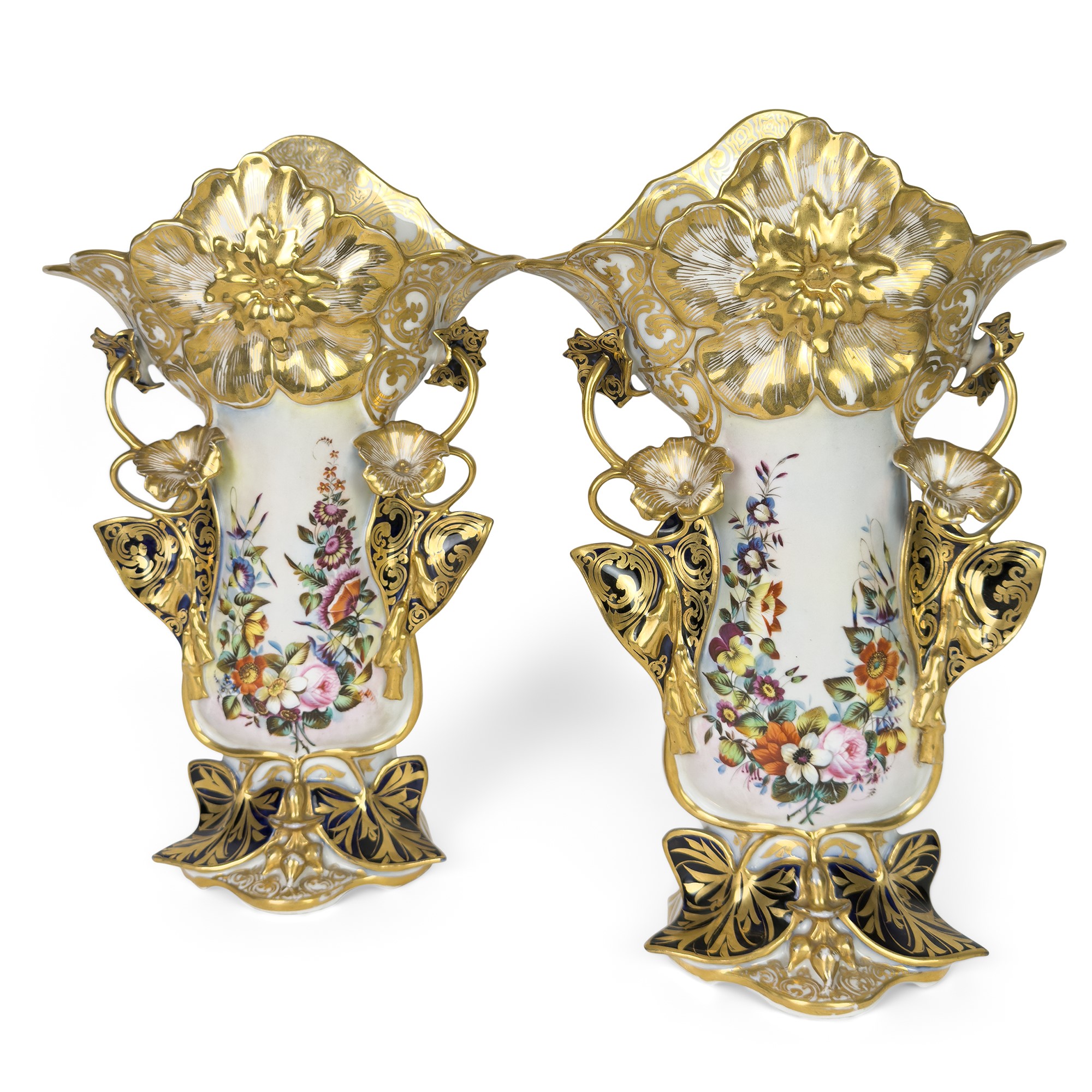 Coppia di vasi a cartoccio in porcellana bianca, dorata e policroma, Francia, XIX secolo