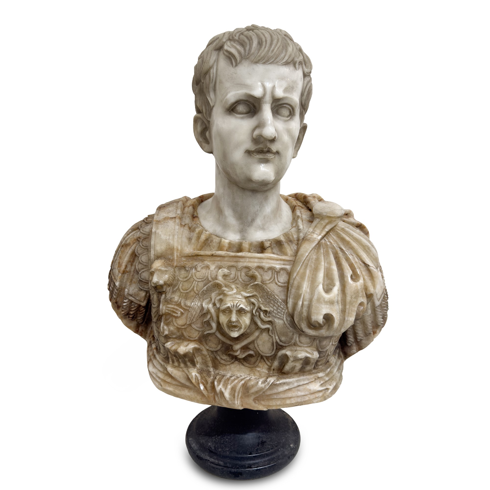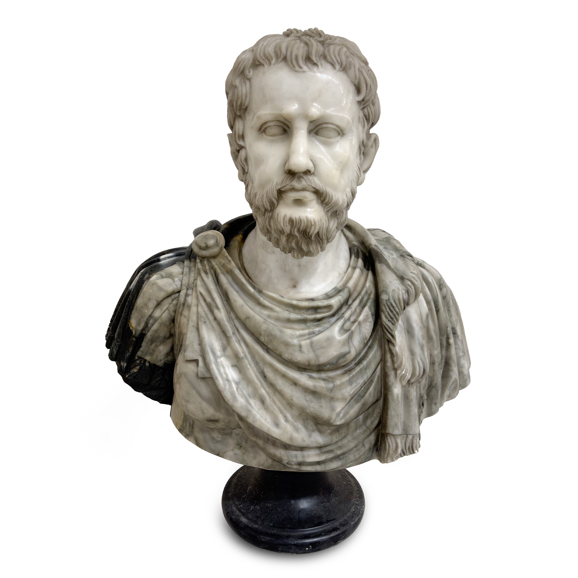 con loriche rispettivamente in alabastro fiorito e marmo cipollino; basi circolari in marmo nero, complessivamente cm. 86x70 circa