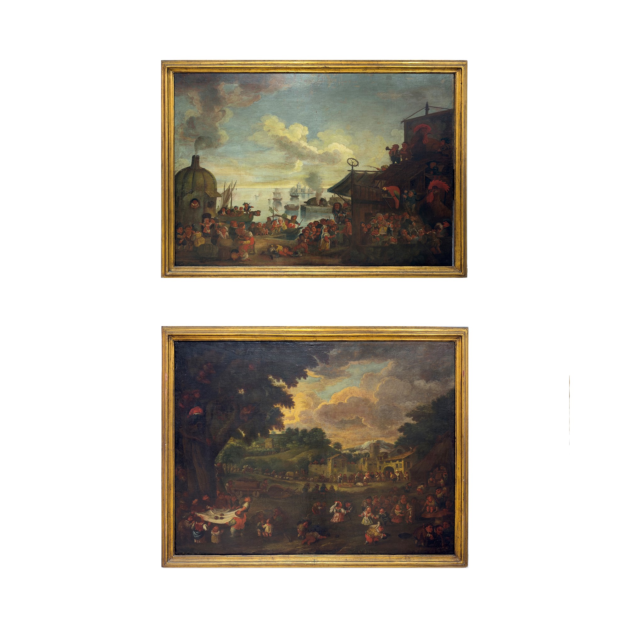 coppia di oli su tela, cm. 97x129 (lievi cadute di colore)