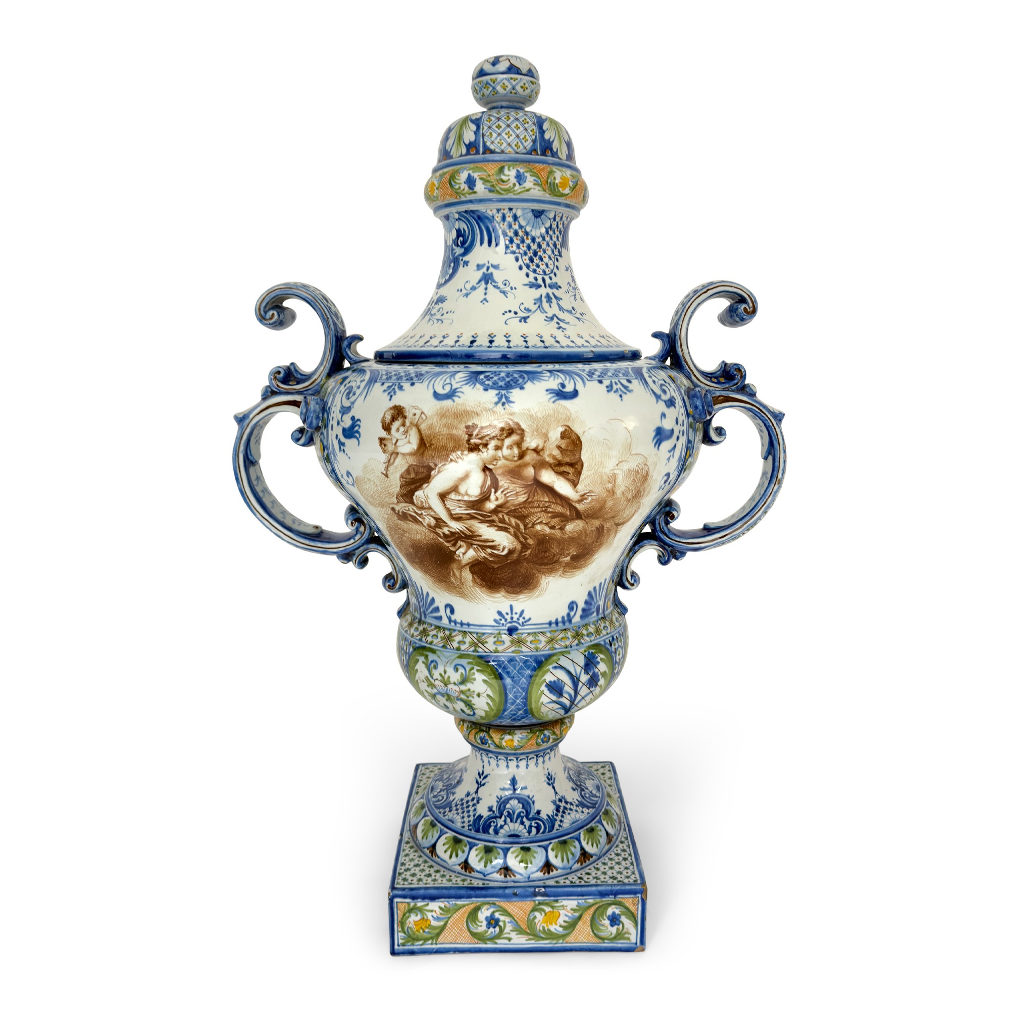 dipinta nei toni predominanti dell'azzurro a motivi vegetali stilizzati e decorativi; corpo a balaustro ornato nella fascia centrale in monocromia marrone a raffigurare una scena di inspirazione mitologica; piede circolare su base quadrata; due anse a doppia voluta; marca gallo in blu sotto la base, cm. 75x50 circa