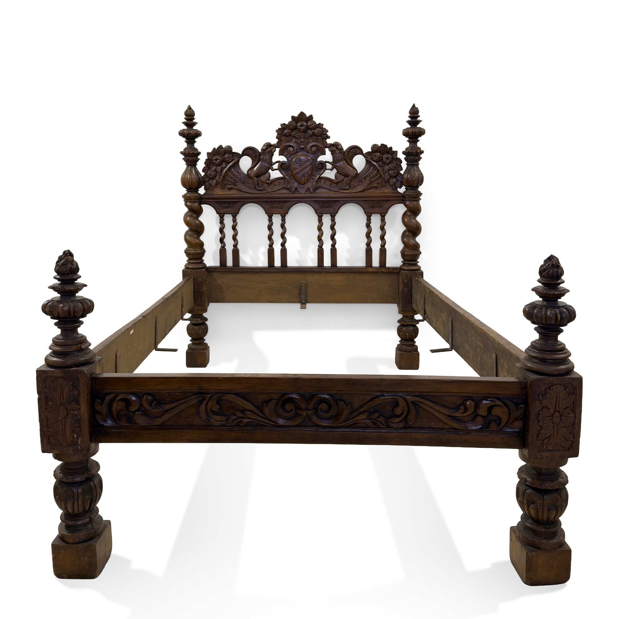 testiera traforata scolpita a colonnine a tortiglione come i montanti laterali, sormontate da una cimasa qualificata da cornucopie traboccanti frutta centrate da un cartiglio con stemma sostenuto idealmente da due leoni; traverse laterali intagliate a foglie stilizzate, cm. 153x141,5x210 circa; misure interne: cm. 197x128 circa