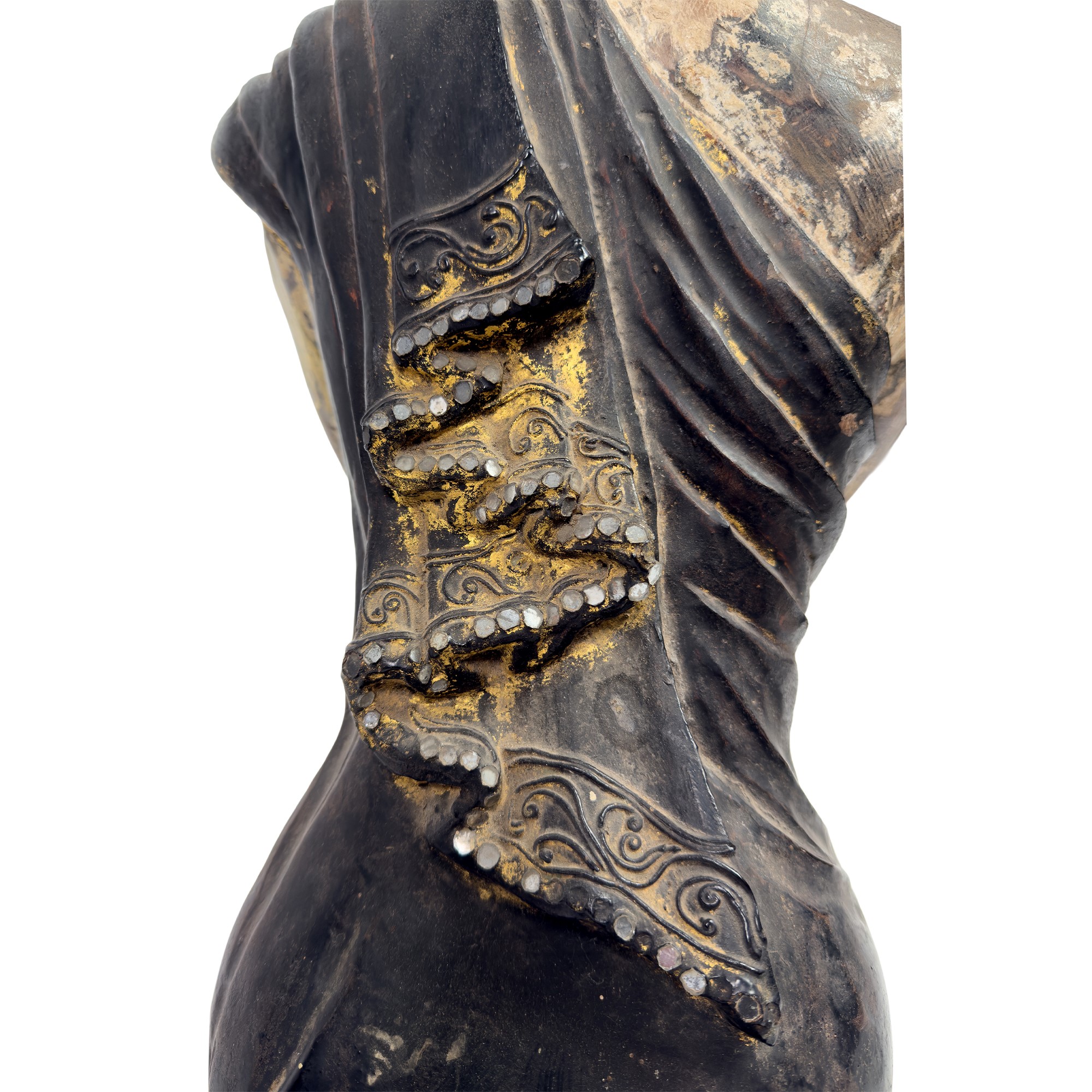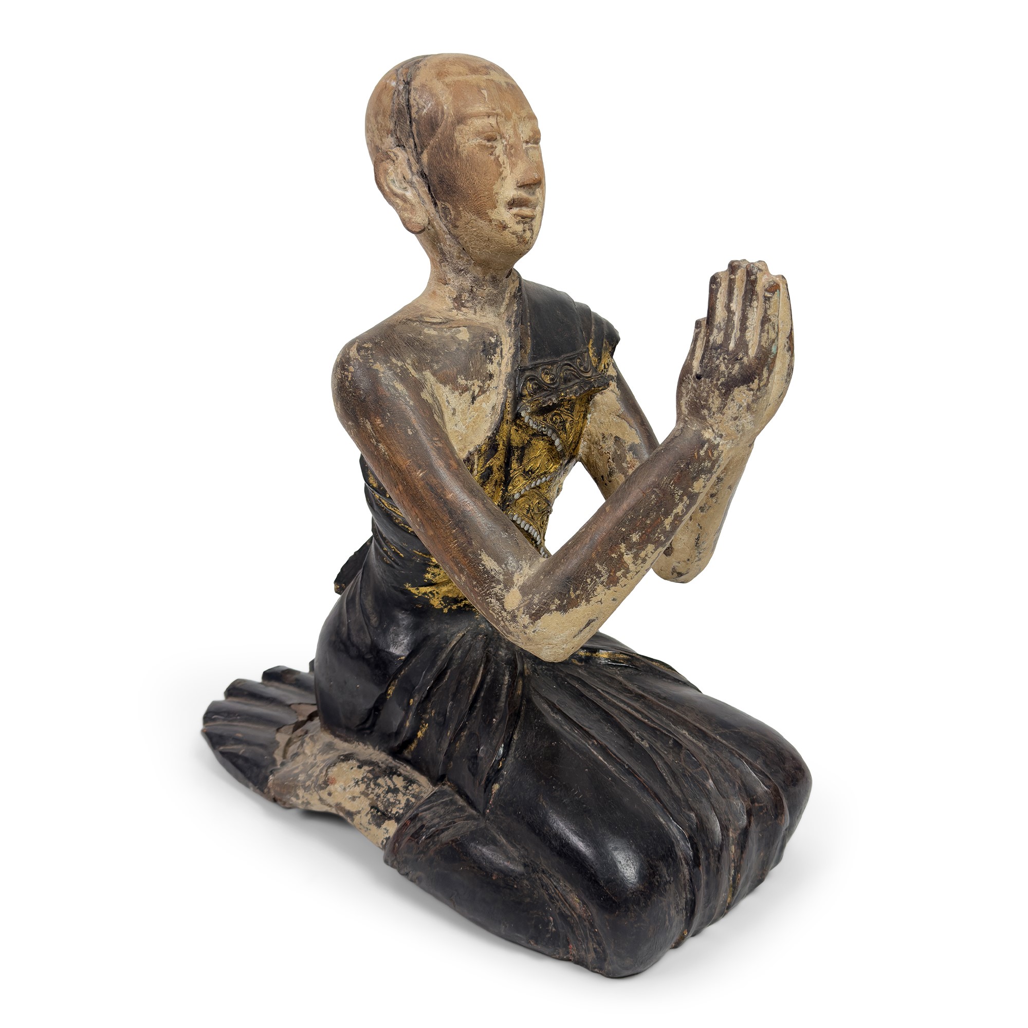 raffigurante un monaco in preghiera, cm. 62x60x30 circa (mancanze al colore e alla doratura)