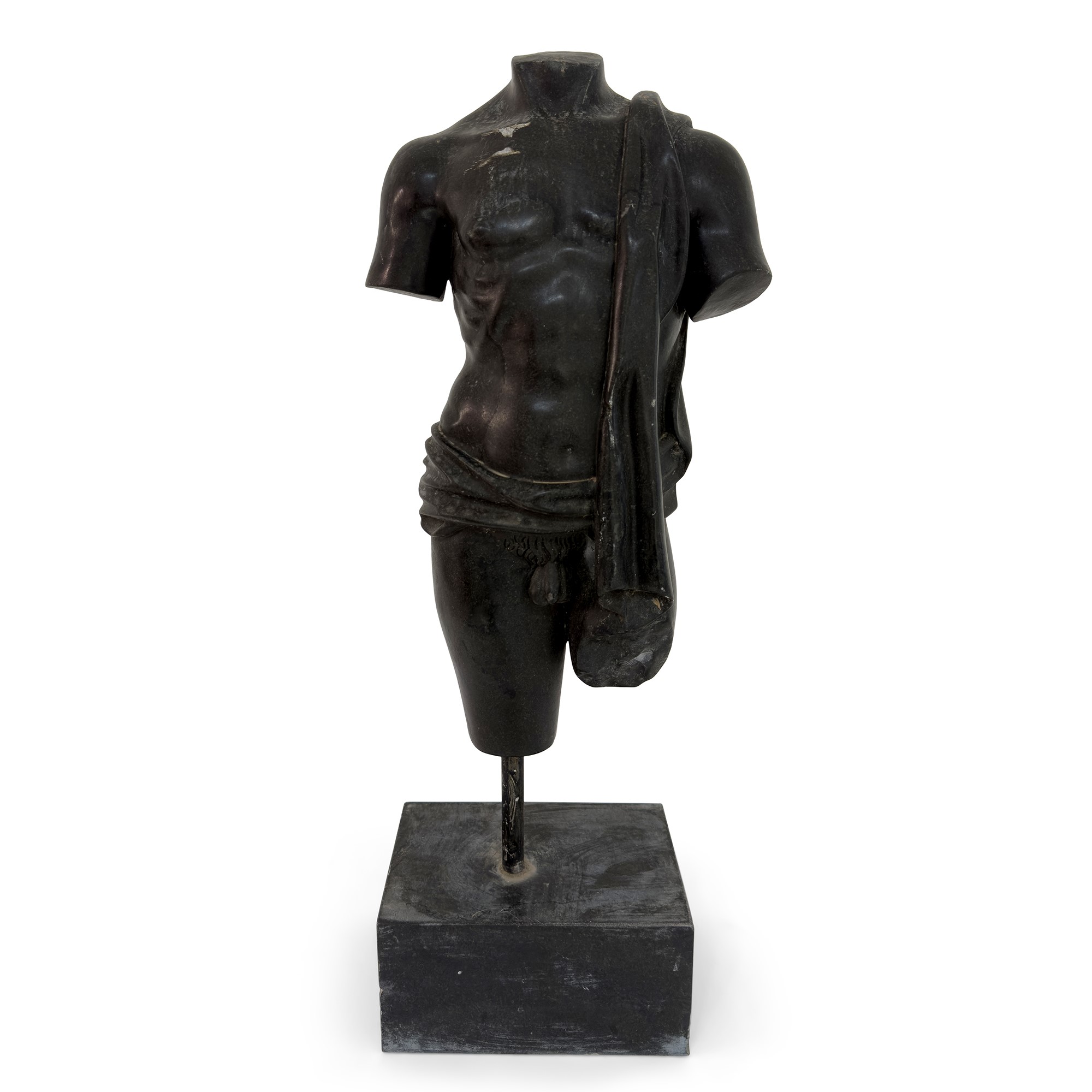 raffigurante un torso maschile acefalo; base parallelepipeda parimenti in marmo nero, il torso: h. cm. 45, complessivamente h. cm. 65