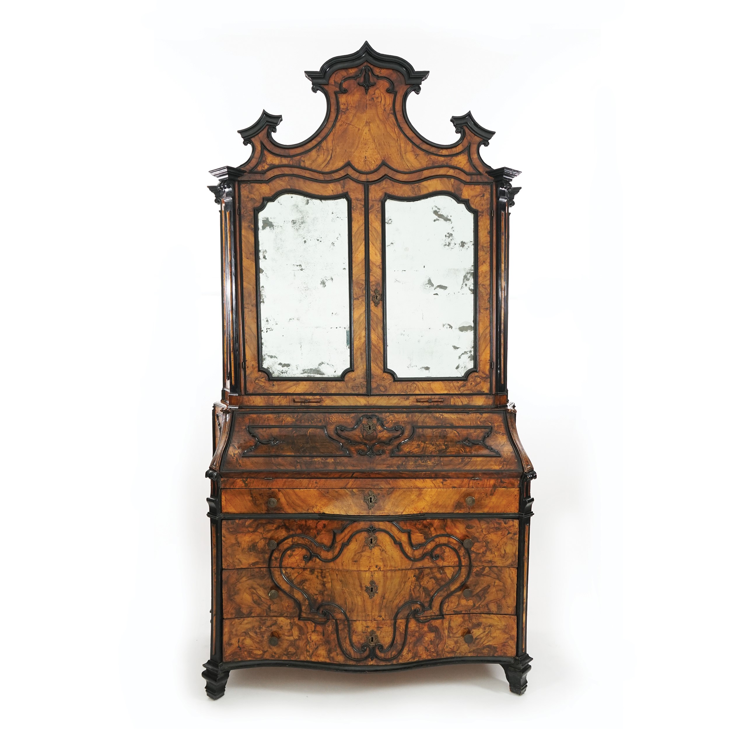 con profili in legno ebanizzato. La parte inferiore con fianchi concavi e prospetto centralmente bombato a quattro cassetti sottesi a una calatoia celante cinque tiretti; quella superiore a due ante con specchio. Alta cimasa a timpano spezzato; corte gambe a balaustro, cm. 250x140x60