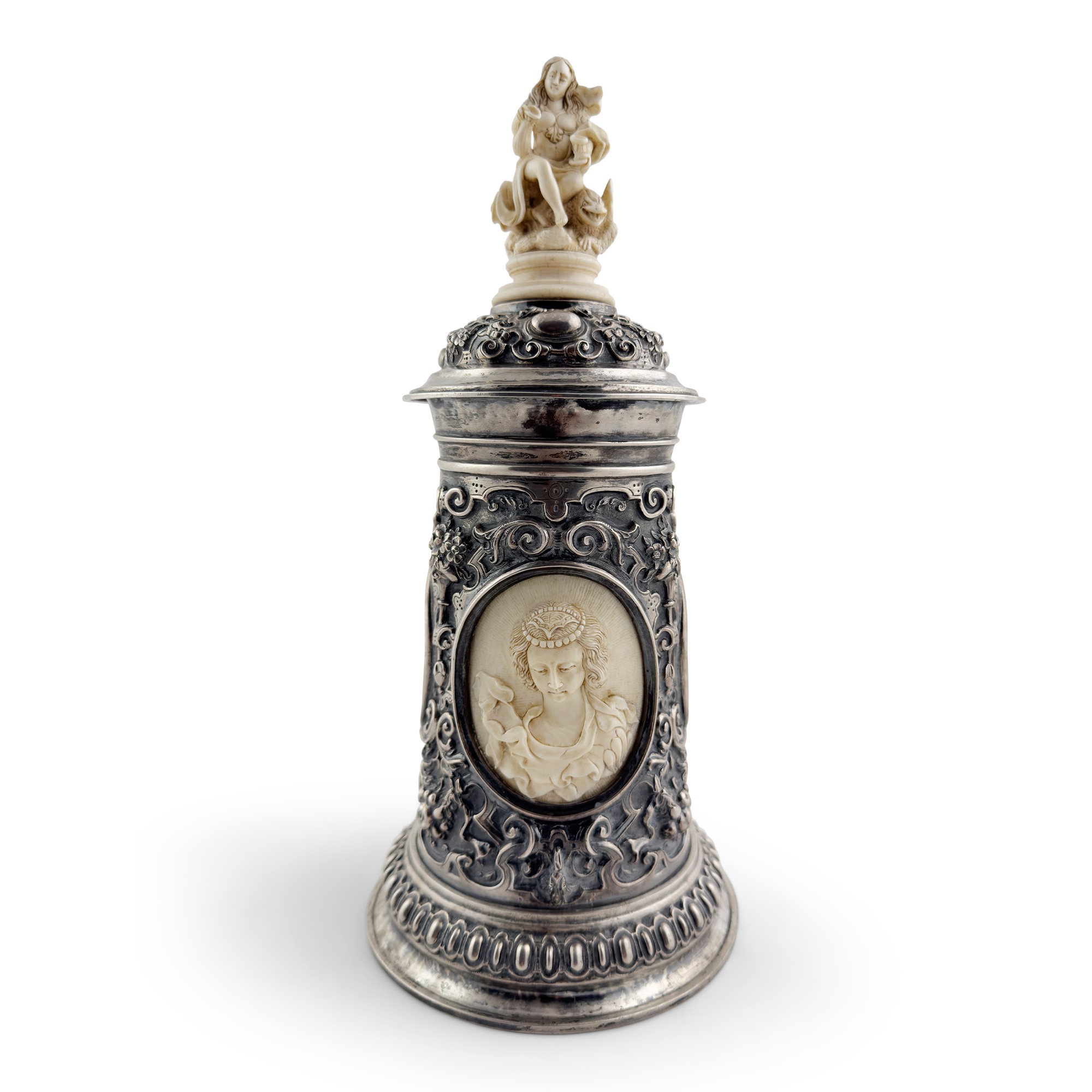 Tankard in argento, argento dorato e avorio, Germania, XIX secolo