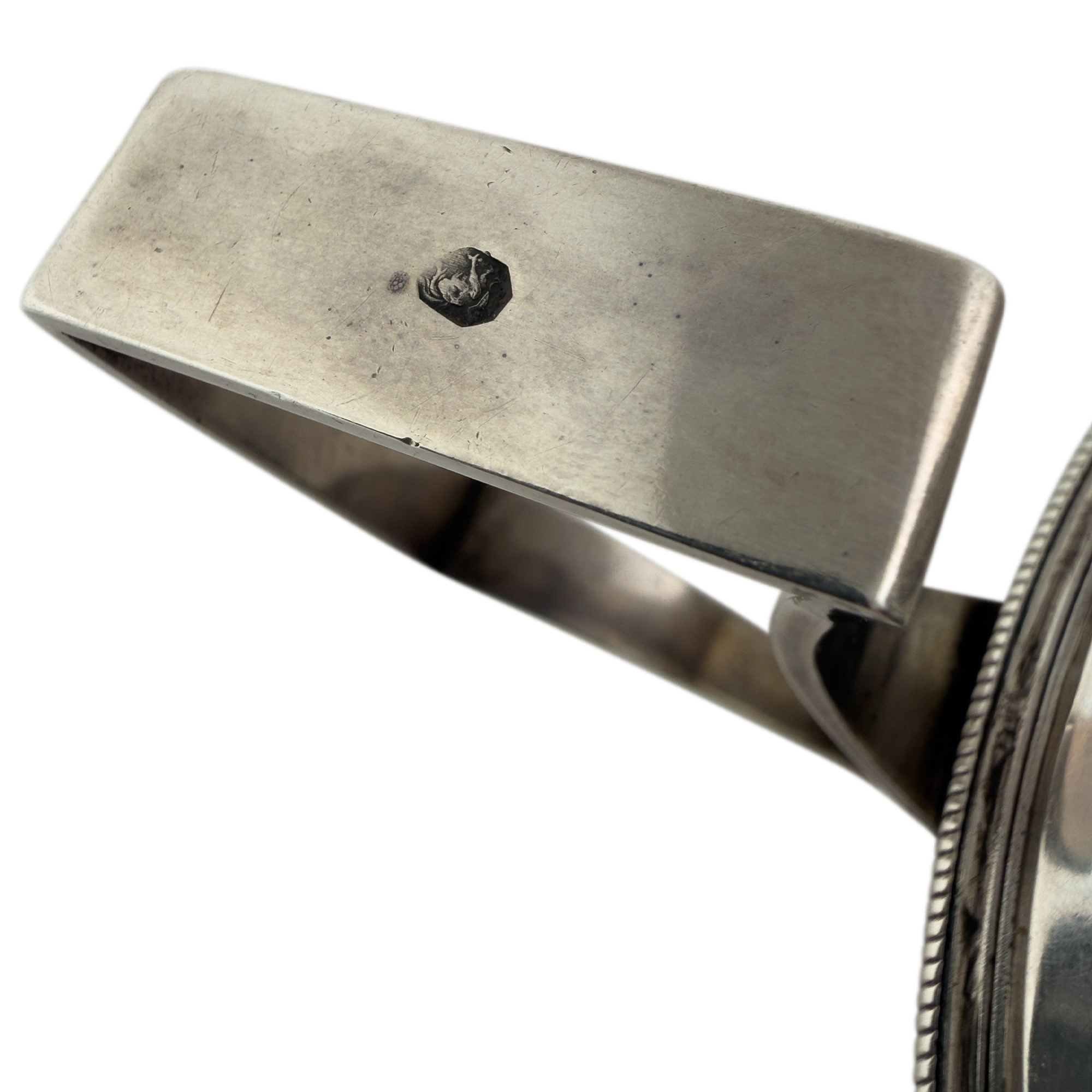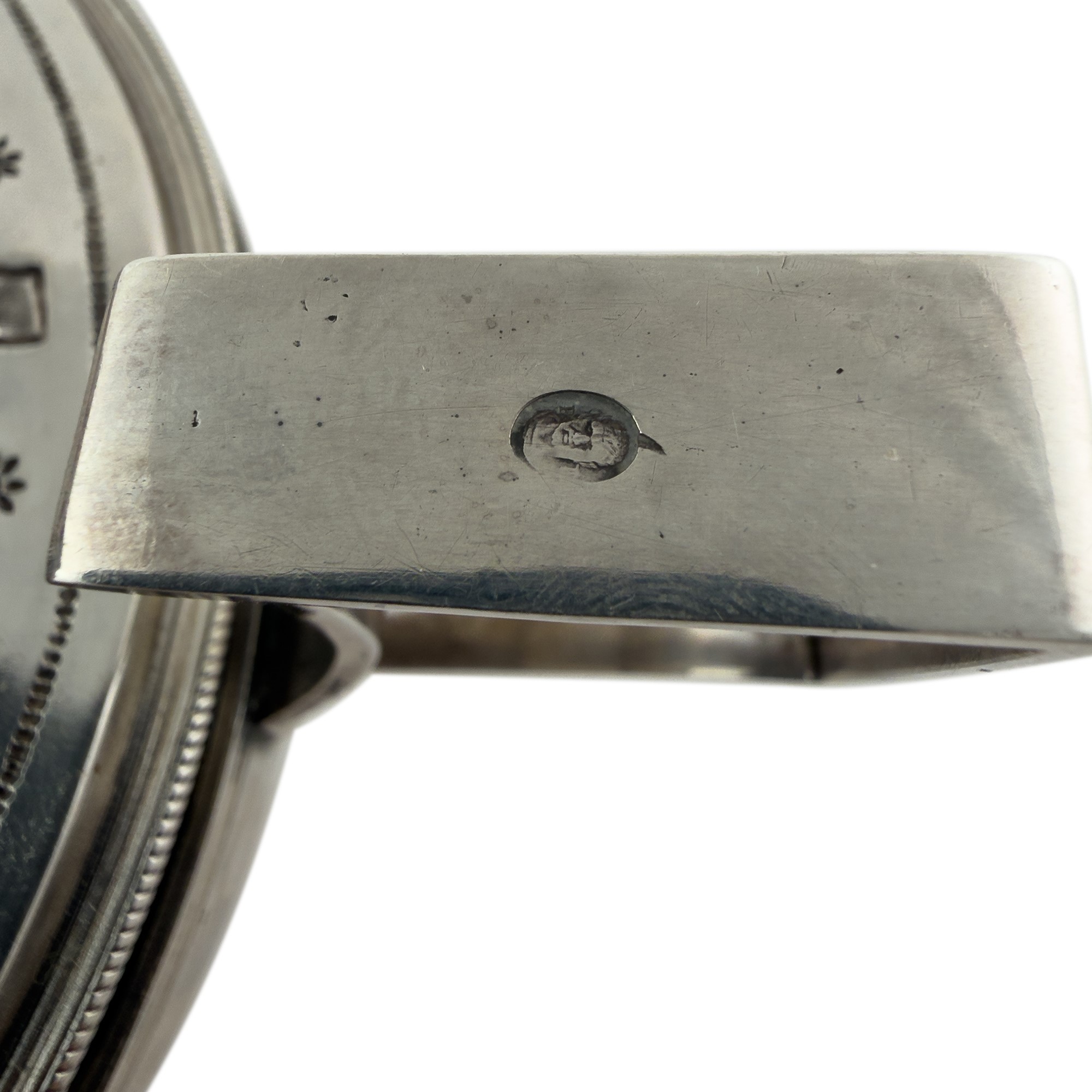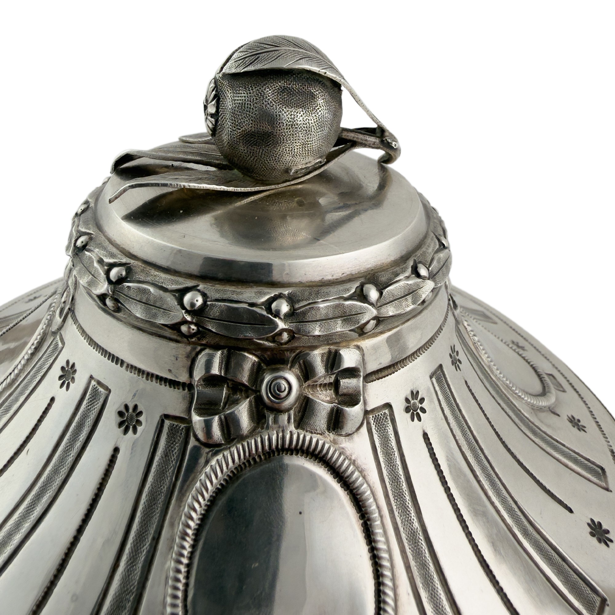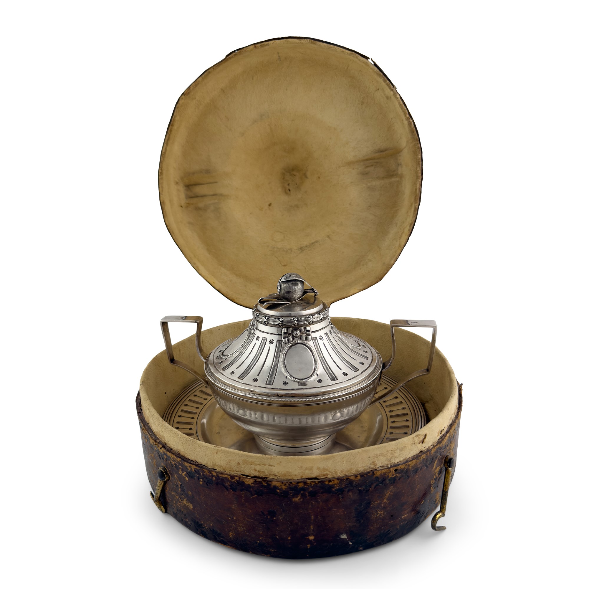 corpo circolare con due prese a volute geometriche stilizzate; coperchio sbalzato a motivi lineari alternati a riserve ovali cieche, culminanti in una corona d'alloro; presa del coperchio in forma di melograno, la tazza: cm. 12x24; il piatto: d. cm. 24, peso complessivo gr. 872. Conservata nell'astuccio originale rivestito in cuoio