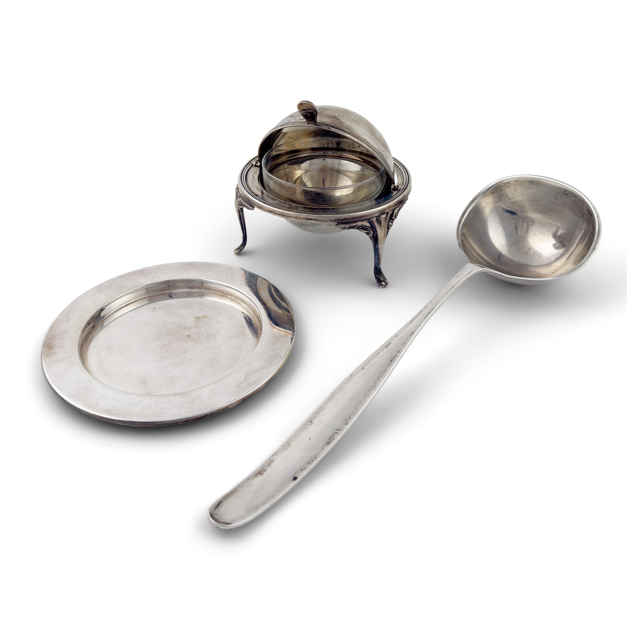 UNITA a un piattino e a un mestolo parimenti in argento, la bowl: cm. 10x12,5, peso complessivo gr. 400 circa