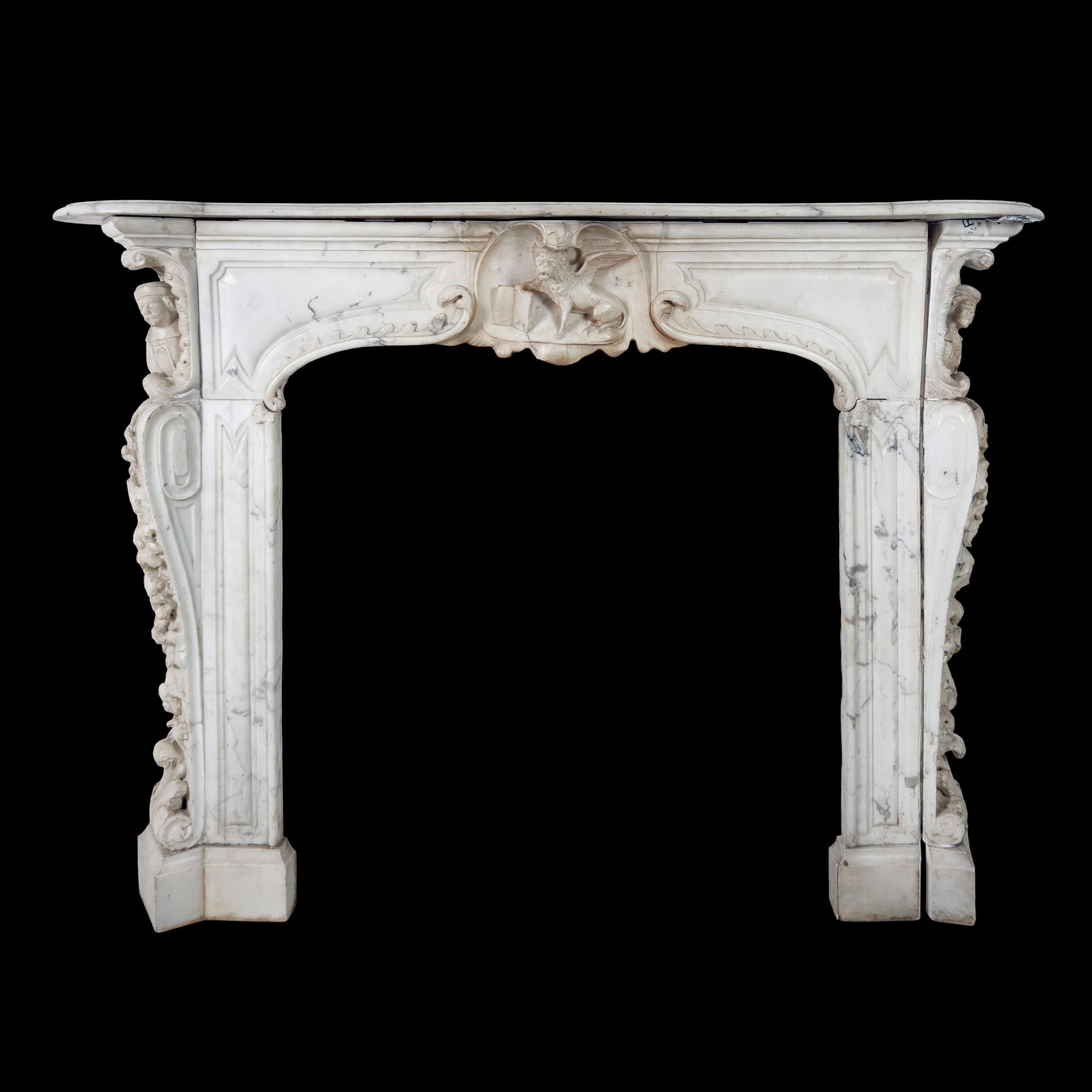 piano frontalmente centinato; architrave centrato dalla figura del leone marciano in forte rilievo; piedritti a volute scolpite a serti fioriti sormontati dal busto di un gondoliere, cm. 108x150x39 circa