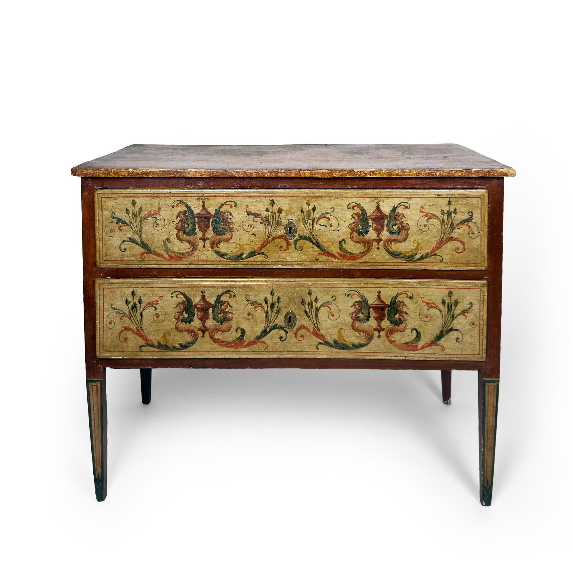 Cassettone in legno laccato e dipinto in policromia, Italia centrale, XVIII secolo
