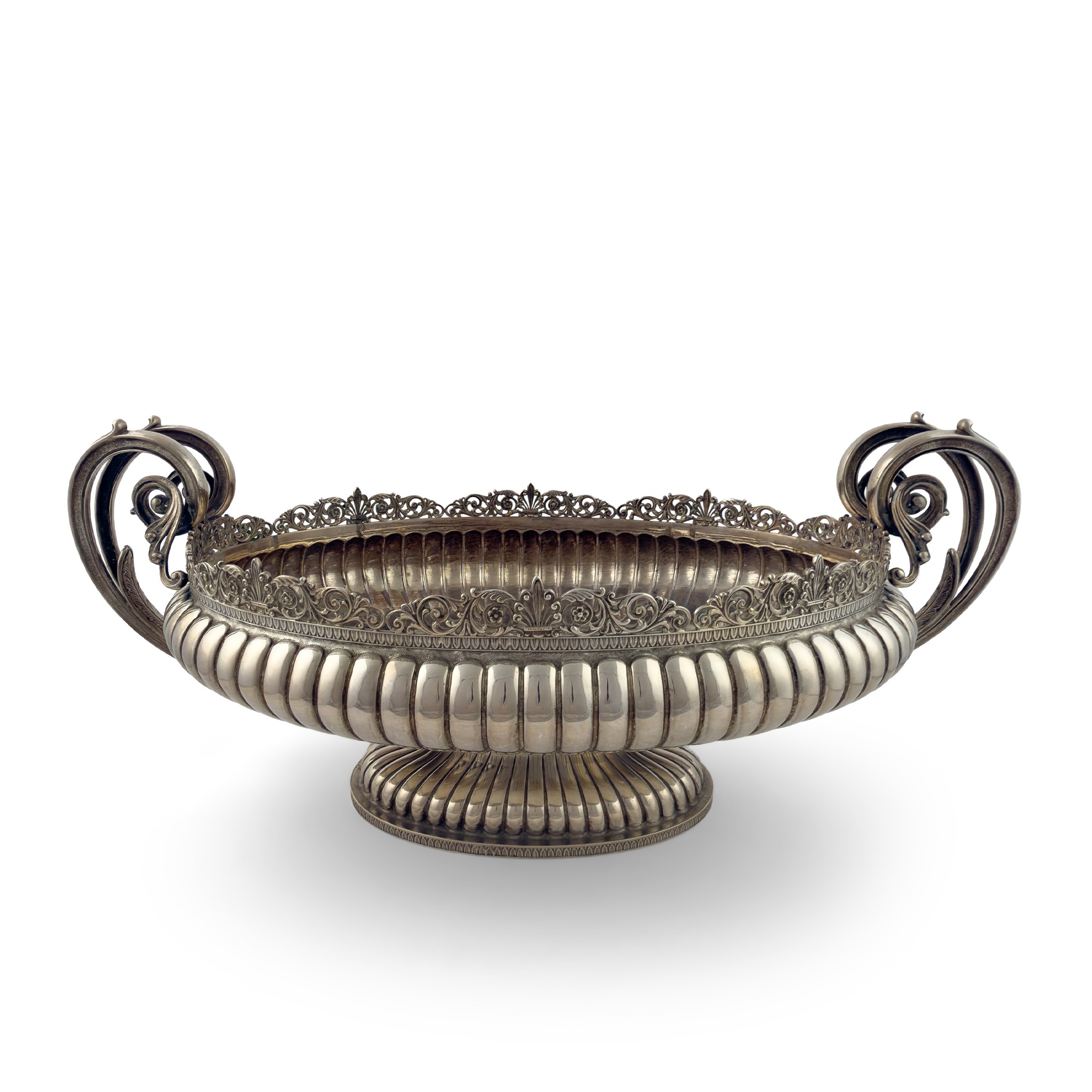 di forma ovale; corpo e piede sbalzati a corpose baccellature; profilo del bordo traforato a minuti motivi vegetali; due anse a doppia voluta arricciata, cm. 23x54,5x28, peso gr. 2.300 circa