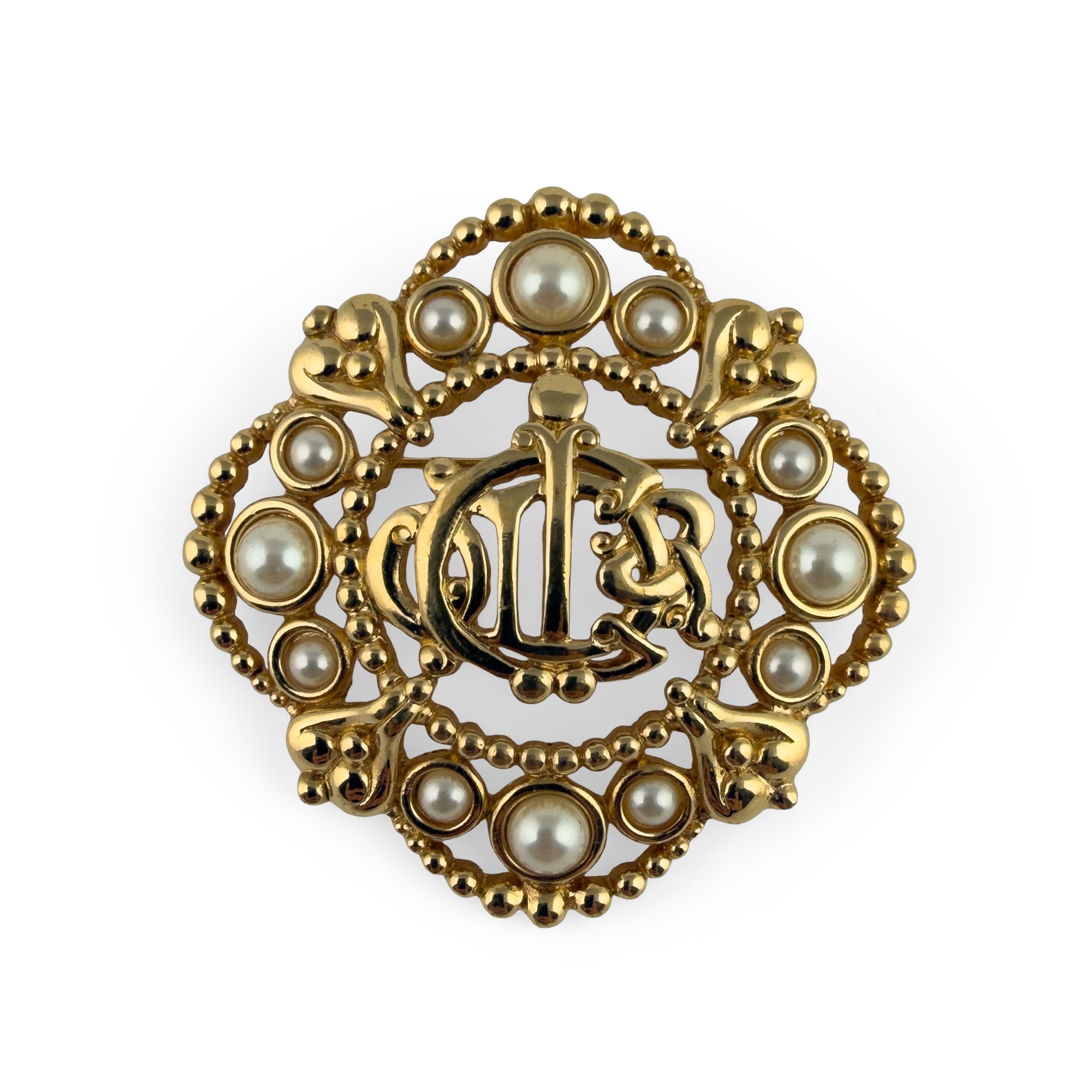 spilla in metallo dorato decorata con finte perle, al centro monogramma CD, d. cm. 5,5