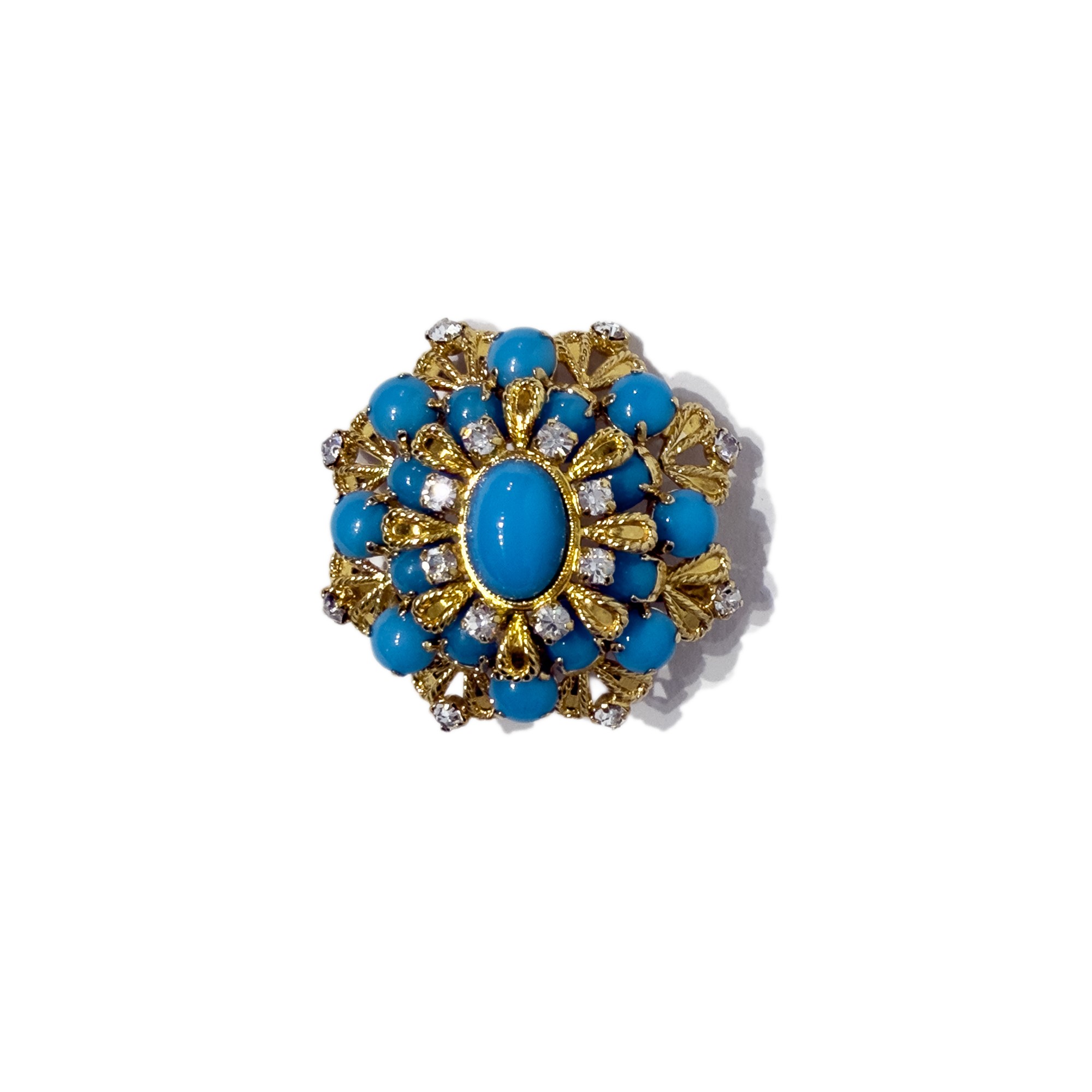 spilla in metallo dorato abbellita da strass e da elementi che imitano il turchese. Custodia originale.